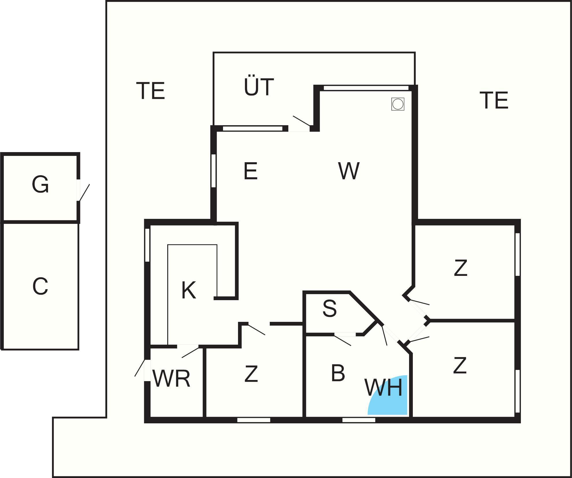 Off. Küche: E-Herd, Kühlschr. m. Gefrierfach, Mikrow., Abzugsh., Kaffeem., Spülm., Waschm, Trockner