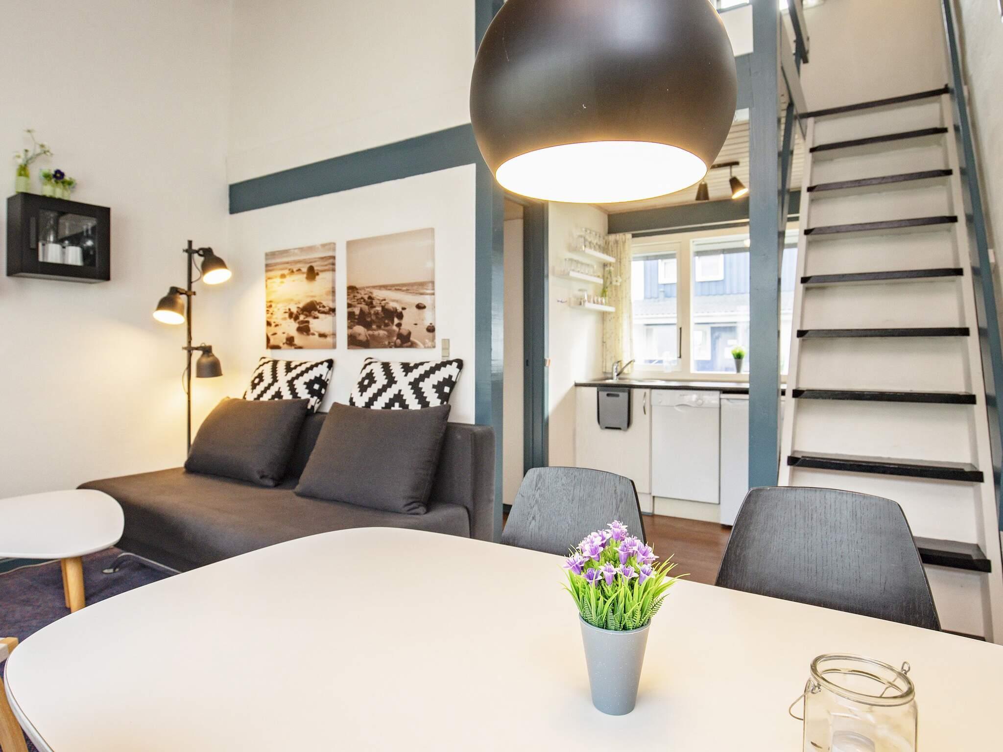 Eine Treppe führt in den ersten Stock, wo sich weitere Schlafplätze mit zwei Einzelbetten befinden, sodass das Haus Platz für bis zu vier Gäste bietet. Die Raumaufteilung bietet Komfort und Privatsphäre – egal, ob Sie als Familie oder in einer kleinen Gruppe reisen.