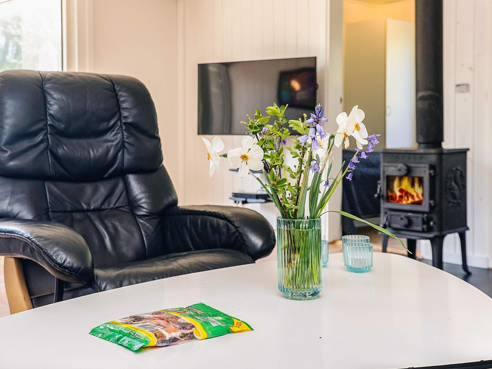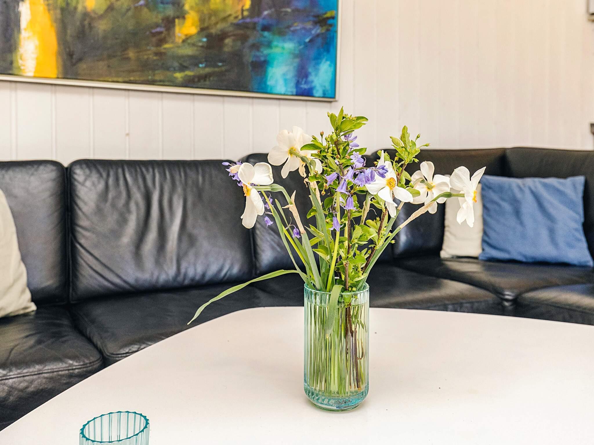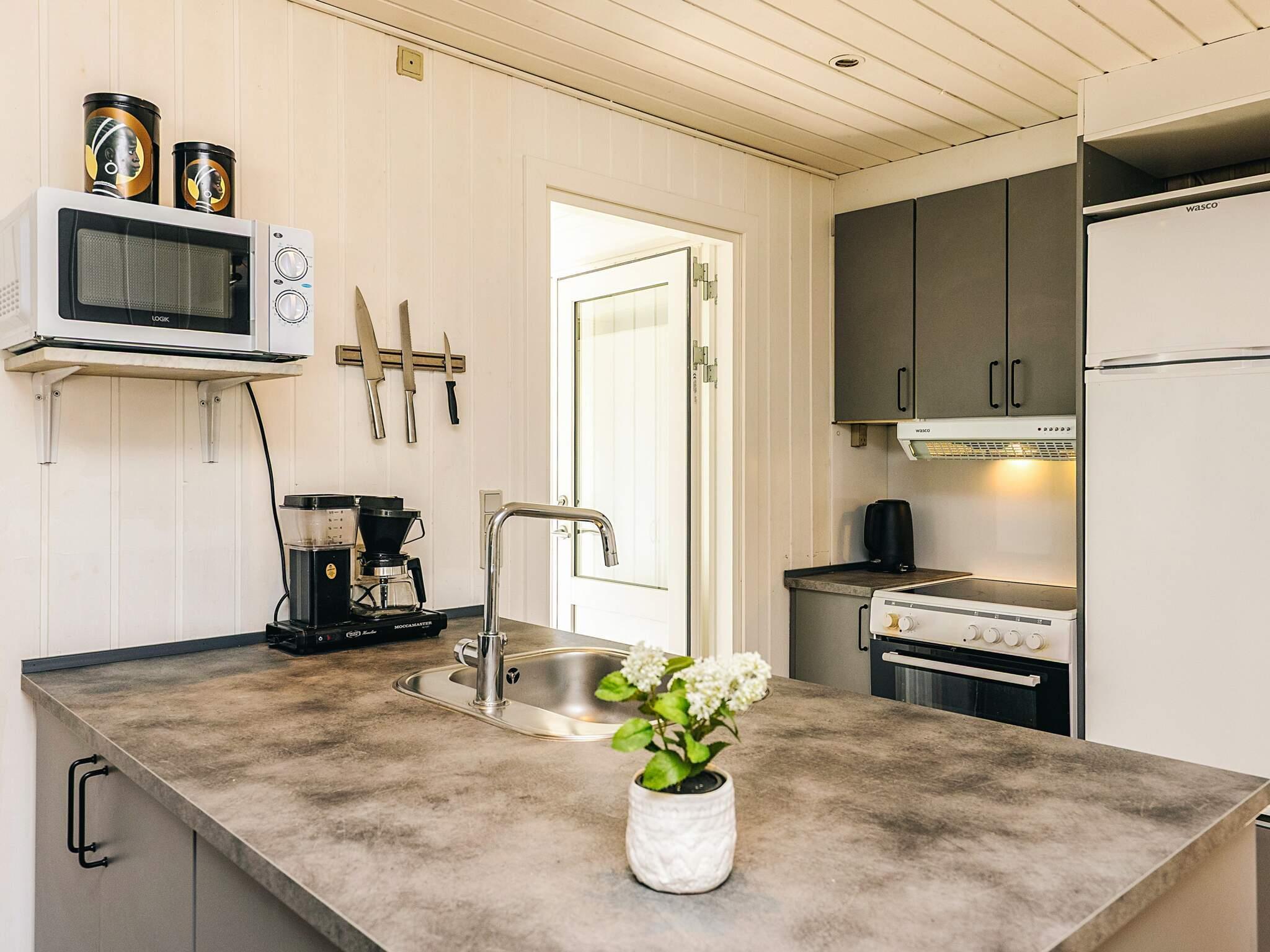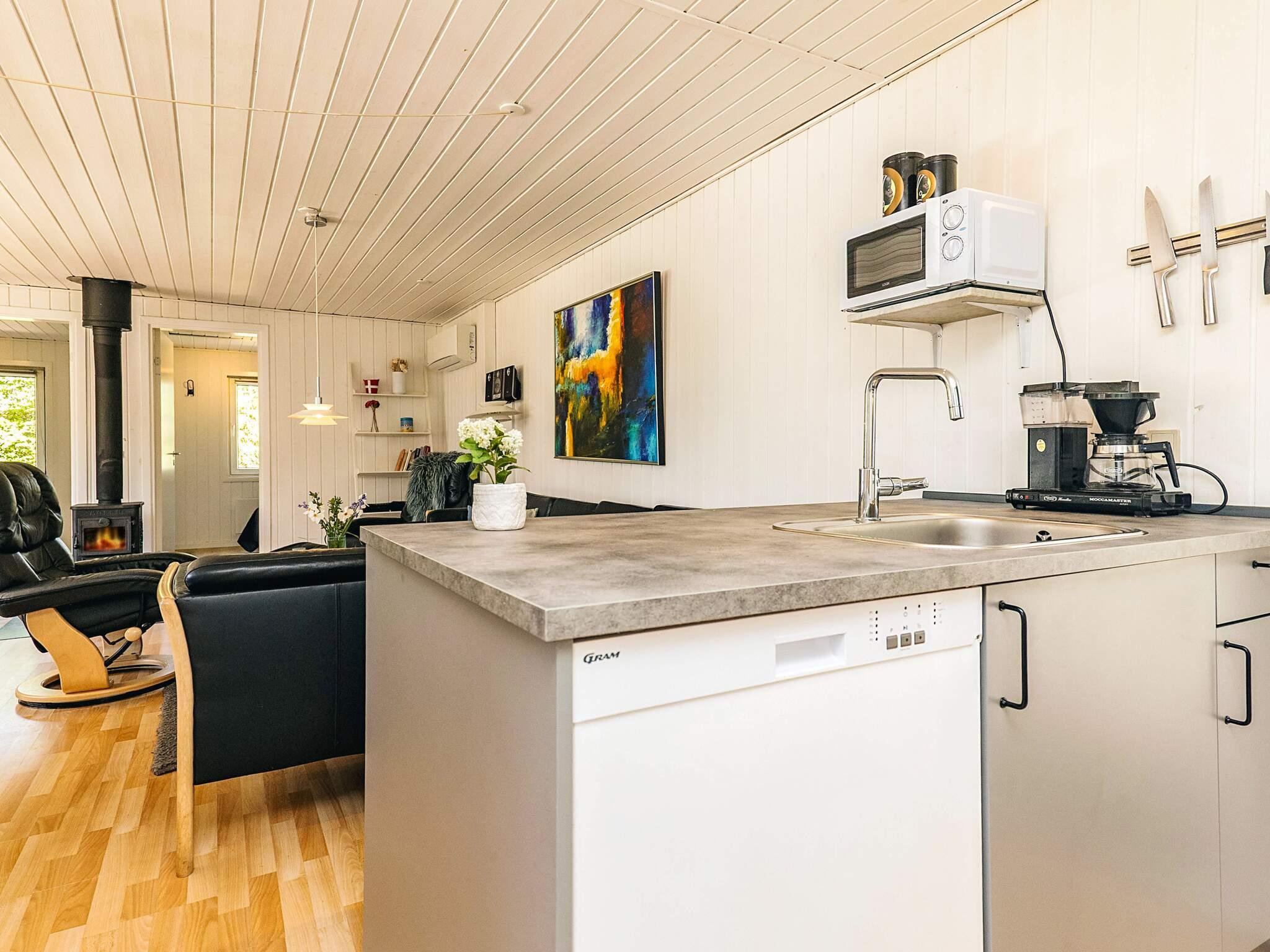 Die Küche des Hauses, ausgestattet mit Kaffeemaschine, Elektroherd mit Backofen, Mikrowelle, Kühlschrank mit Gefrierfach und Geschirrspüler, wurde 2024 renoviert. Von der offenen Küche gelangt man direkt in den Essbereich und das Wohnzimmer mit Kaminofen, Wärmepumpe, Fernseher mit Chromecast, DVD-Player und WLAN.