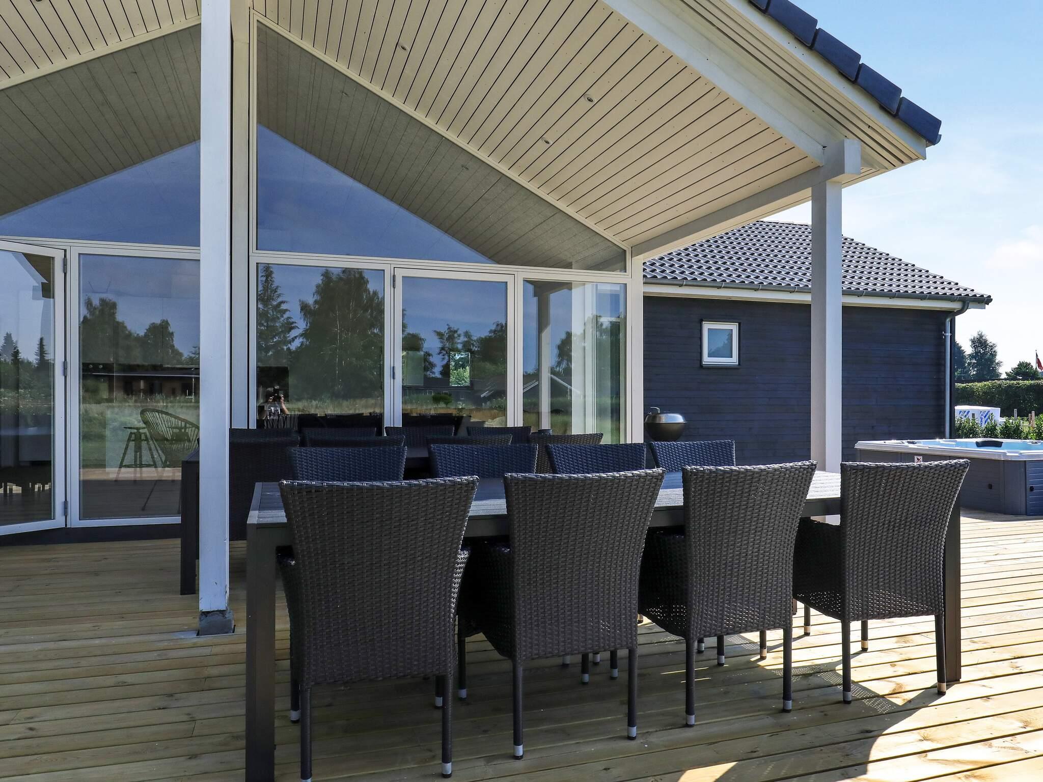 Im Freien gibt es eine große, teilweise überdachte Terrassenfläche, die sich für Sommertage und Grillabende anbietet. Für ein entspannendes Bad unter freiem Himmel steht ein Standwasser-Whirlpool bereit. Außerdem Fußballtor auf dem Rasen.