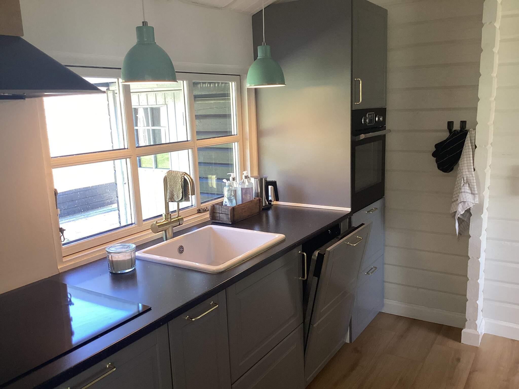 Die Küche des Ferienhauses ist unter anderem mit Kaffeemaschine, Induktionskochfeld, separatem Backofen, Kühl-Gefrierkombination sowie Geschirrspüler ausgestattet. Es gibt zwei Badezimmer – eines im Haupthaus und eines im Annex – beide mit WC, Waschbecken und Dusche.