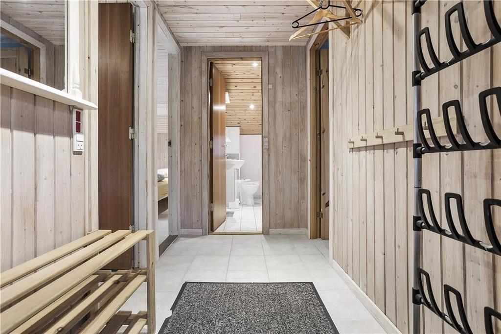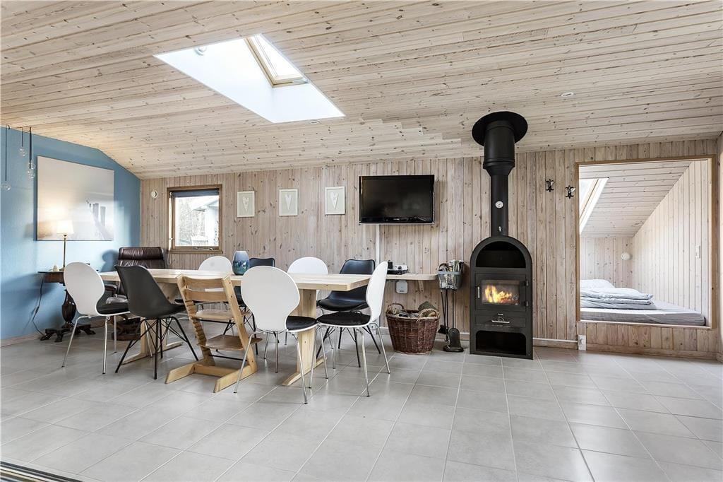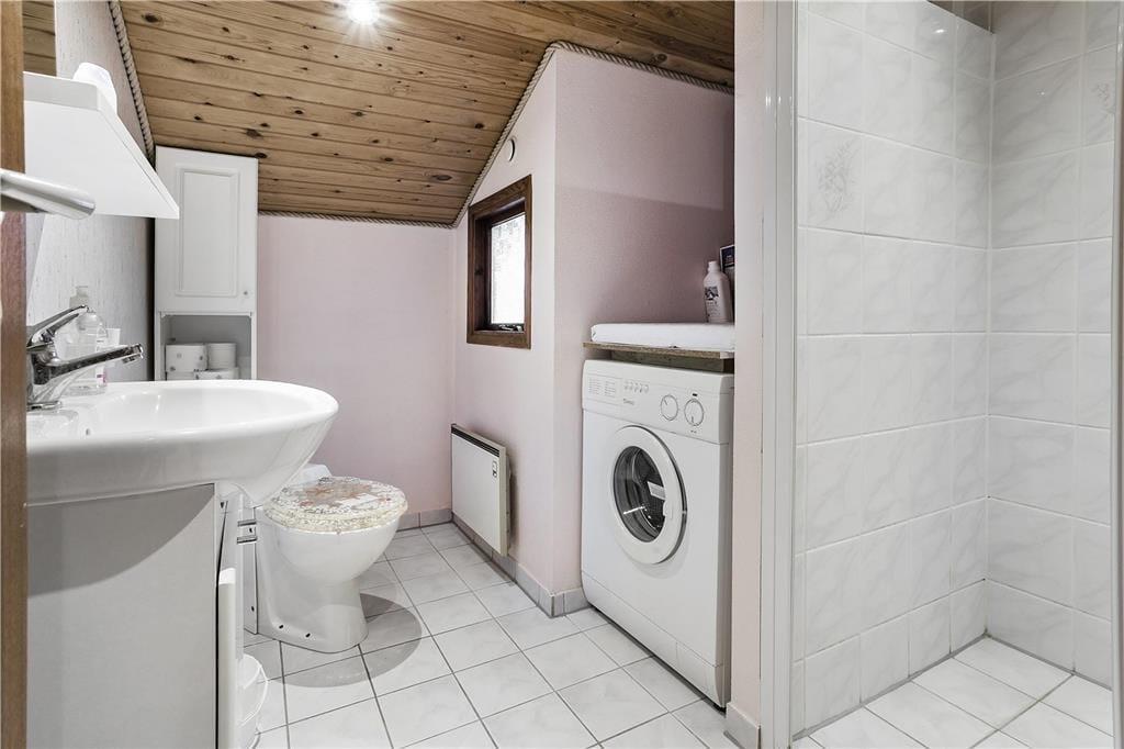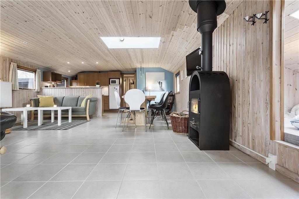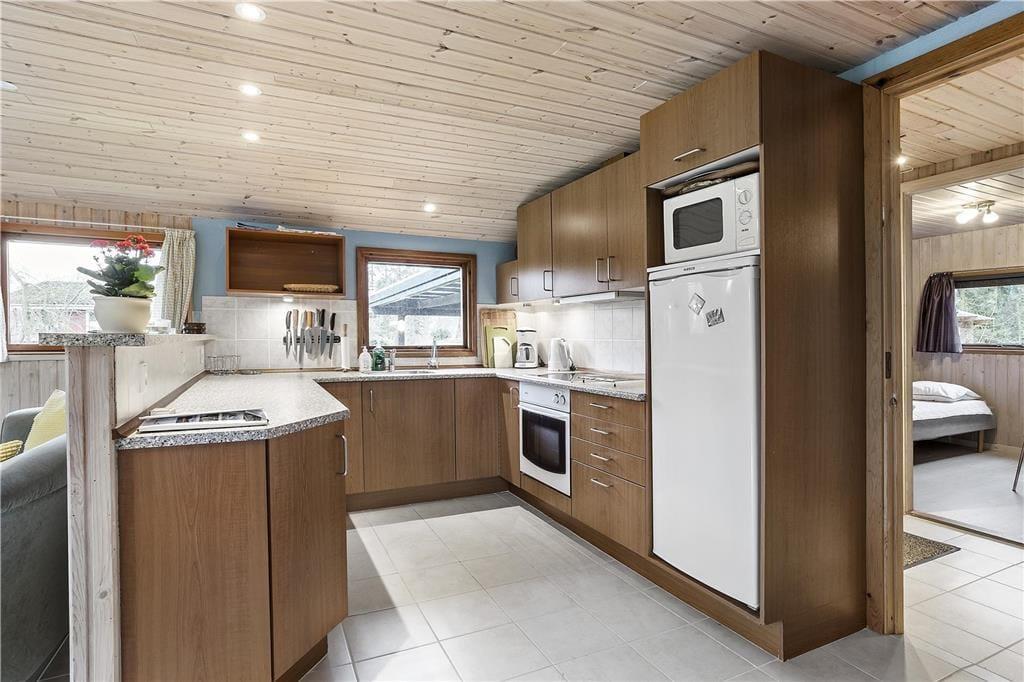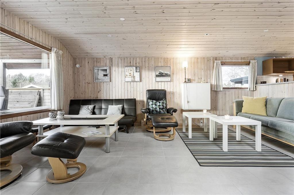 Das Haus ist mit einem schönen gefliesten Badezimmer mit WC, Dusche und Waschmaschine ausgestattet, einer schöne Küche in offener Verbindung mit dem großen und schön eingerichteten Wohnzimmer, das sowohl Sofagruppen, Esstisch, Sessel als auch einen großen Fensterbereich mit Blick auf Terrasse und Garten bietet.