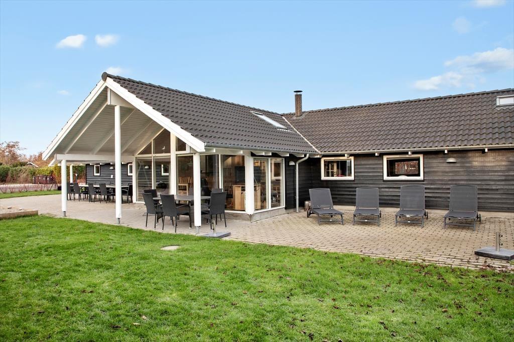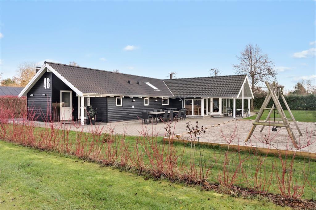 Das Ferienhaus befindet sich auf einem 1080 m großen Grundstück. Für das Ferienhaus gibt es eine 192 m lange offene Terrasse sowie eine 20 m überdachte Terrasse. Es gibt Werkzeugraum, Schaukel und Sandkasten.