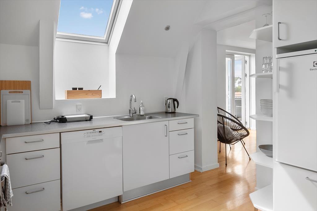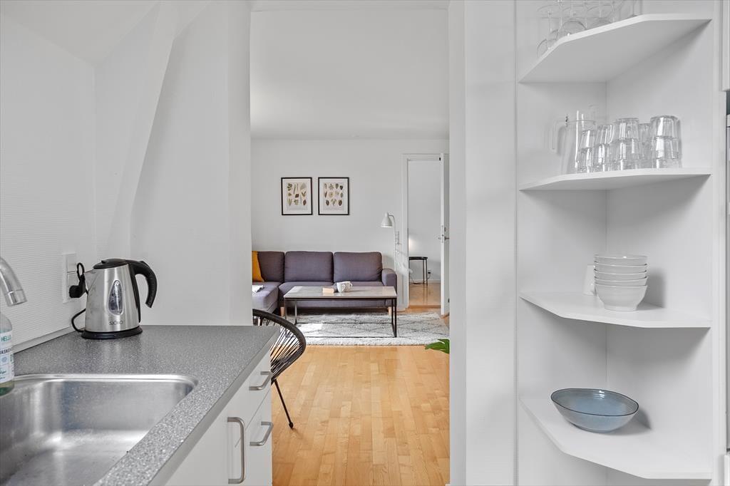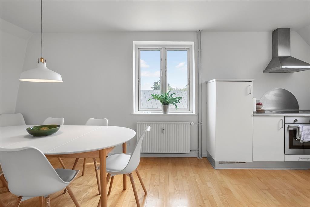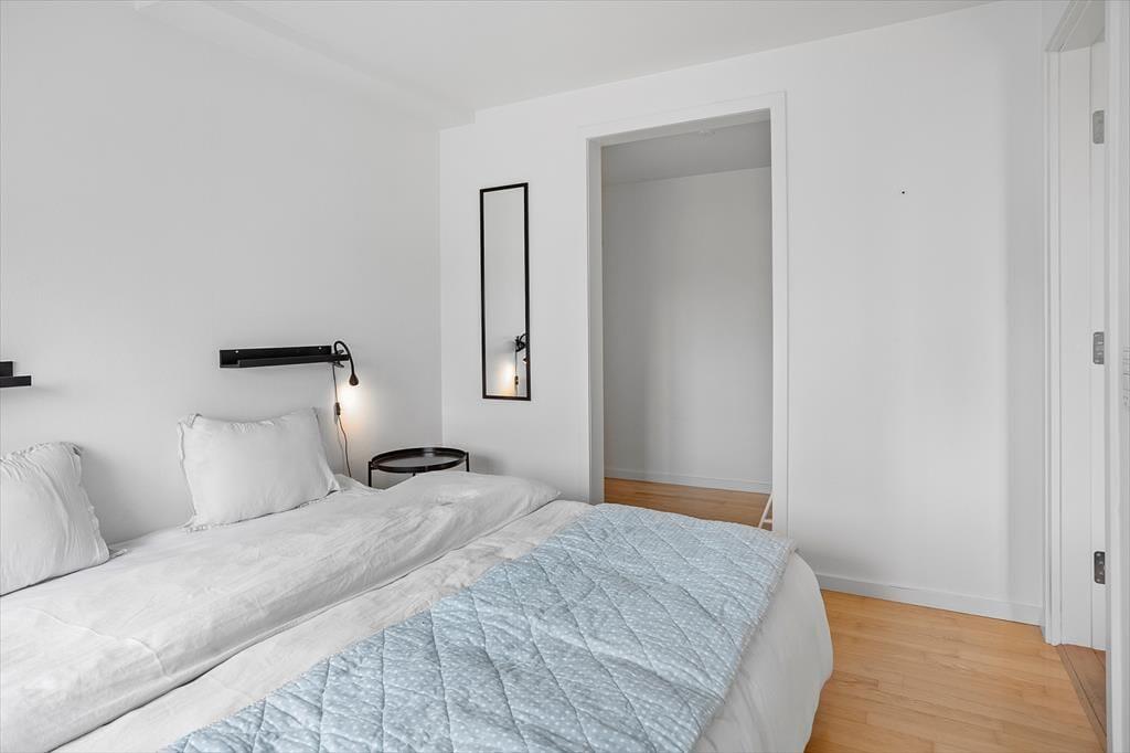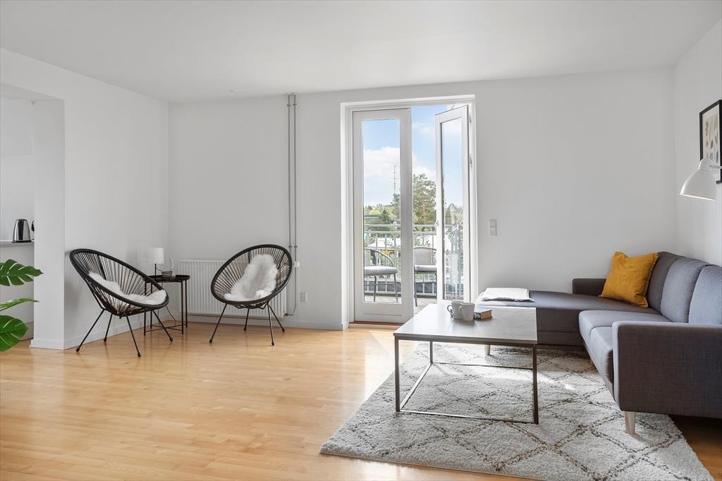 Die Ferienwohnung verfügt über einen Vorraum mit Zugang zu einem Badezimmer mit WC, Waschbecken und Dusche sowie zu einem Schlafzimmer mit 2 Einzelbetten. Zusätzlich gibt es noch ein weiteres Schlafzimmer mit 2 Einzelbetten, die zusammengeschoben sind. Am Ende des Eingangsbereichs gelangen Sie in die schöne und helle Wohnküche der Wohnung, wobei der Küchenbereich alles bietet, was das Herz begehrt, während der restliche Raum über einen Esstisch mit Stühlen und einem Sofa verfügt. Von der Wohnküche aus hat man auch Zugang zur schönen Terrasse der Wohnung mit Aussicht auf Marielyst Torv.