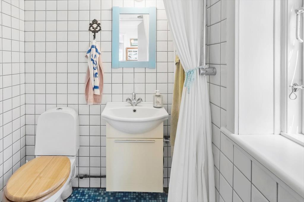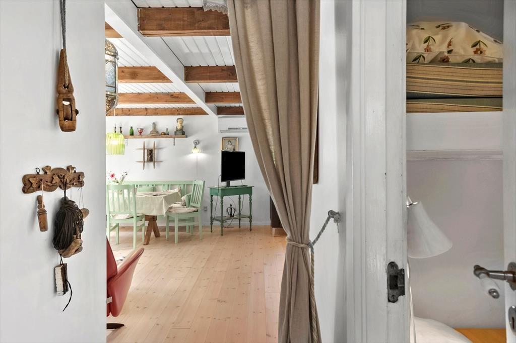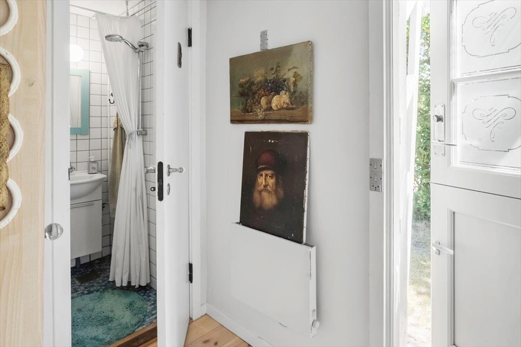 Das Haus verfügt über einen kleinen Eingangsbereich, von dem aus man ins Badezimmer gelangt, das sowohl mit WC als auch mit Dusche ausgestattet ist. Die Küche ist funktional und bietet einen kleinen Essbereich für zwei Personen – ideal für den Morgenkaffee oder eine schnelle Mahlzeit.