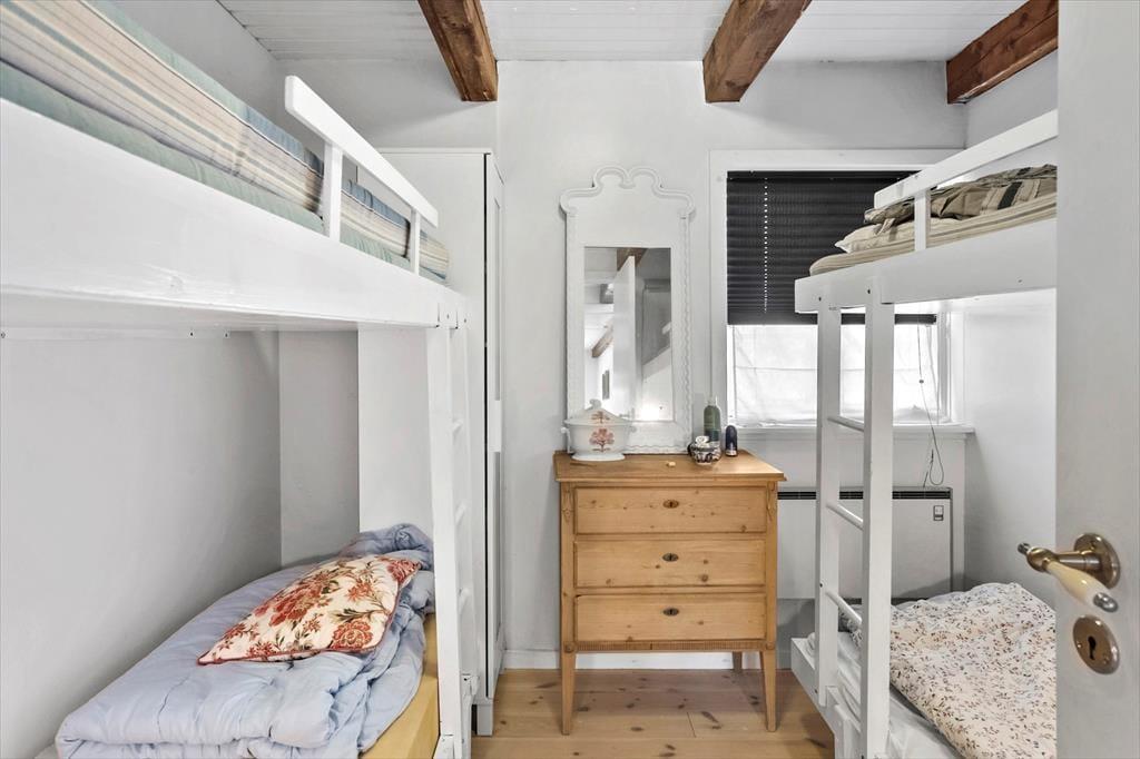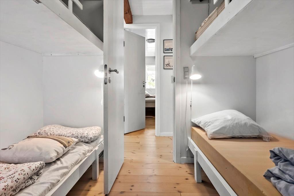 Es gibt zwei Schlafzimmer: eines mit zwei Einzelbetten und das andere mit zwei Etagenbetten – ideal für Erwachsene und Kinder.