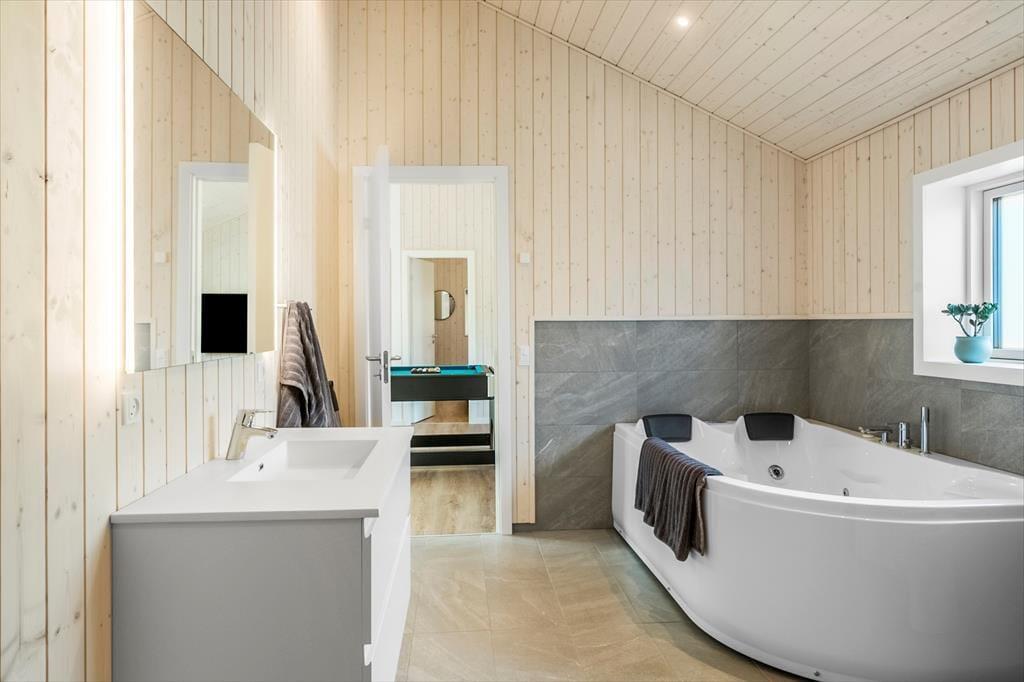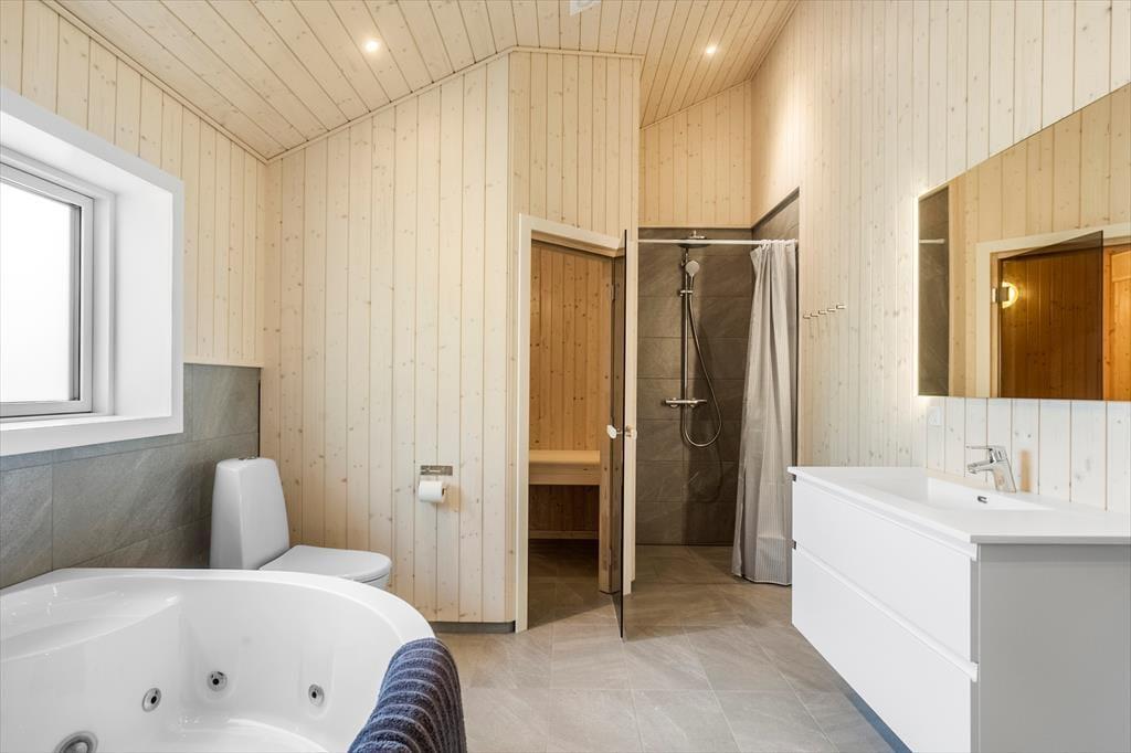 Es gibt zwei Badezimmer: Eines mit WC, Dusche, Whirlpool und Sauna, das andere mit WC und Dusche.
