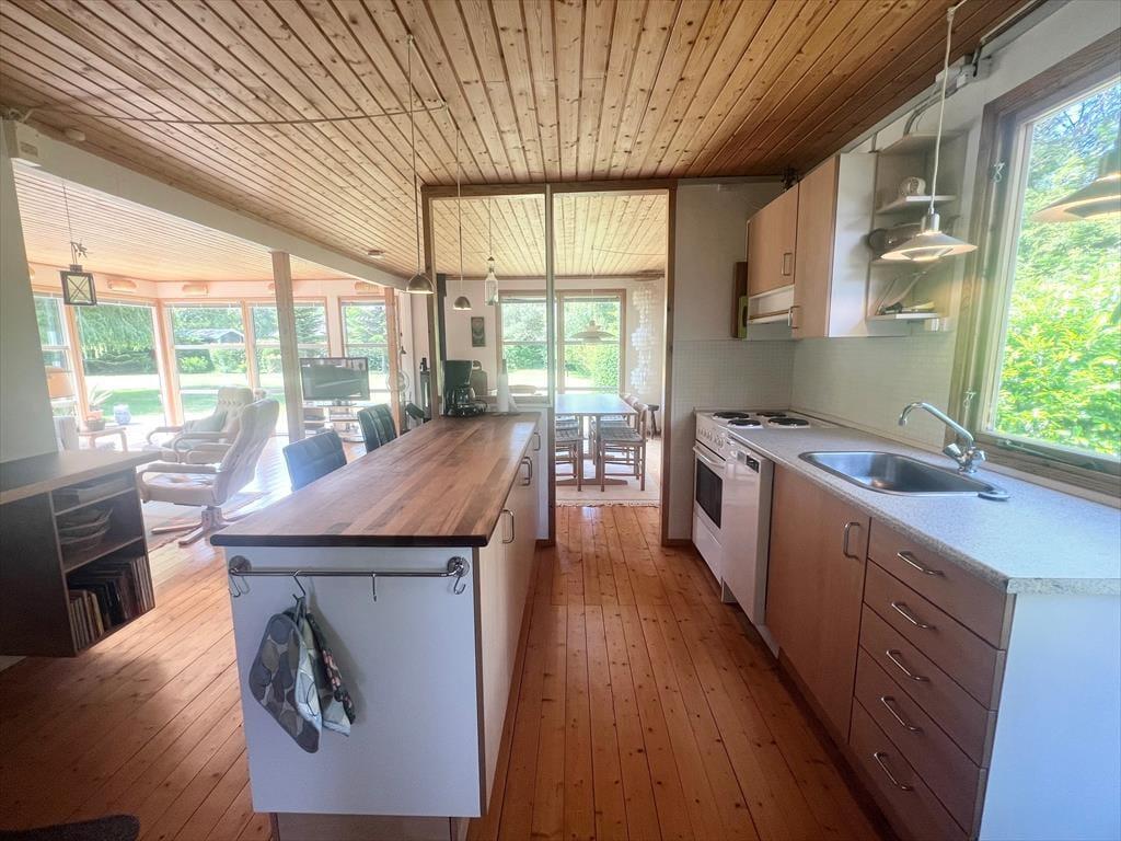 Das Ferienhaus bietet drei komfortable Schlafzimmer: eins mit Doppelbett, das zweite mit Einzelbett und das dritte mit Etagenbett. Außerdem gibt es ein Badezimmer mit WC und Dusche. Das Herzstück des Ferienhauses ist die offene Küche mit Zugang zum Wohn- und Esszimmer. Von hier aus haben Sie einen Blick auf den schönen Garten und Zugang zur Terrasse.
