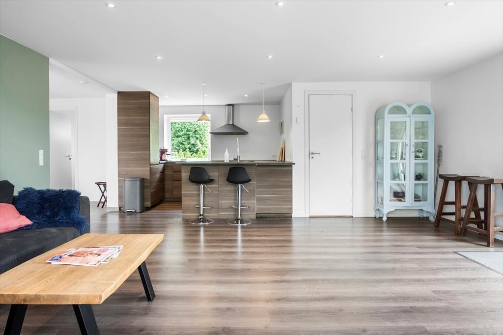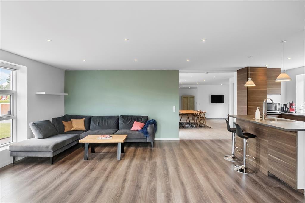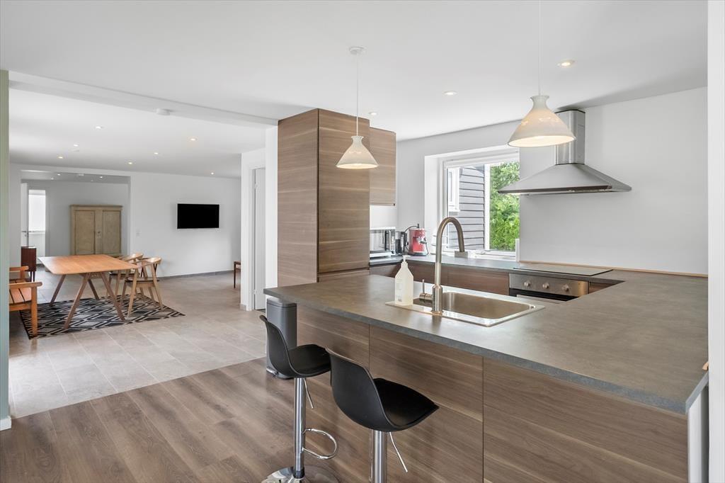 Der Mittelpunkt des Ferienhauses ist die helle, offene Wohnküche, die in den Essbereich und eine einladende Sofaecke übergeht. Von hier aus gelangt man direkt auf die schöne Terrasse, auf der man schöne Stunden verbringen kann.