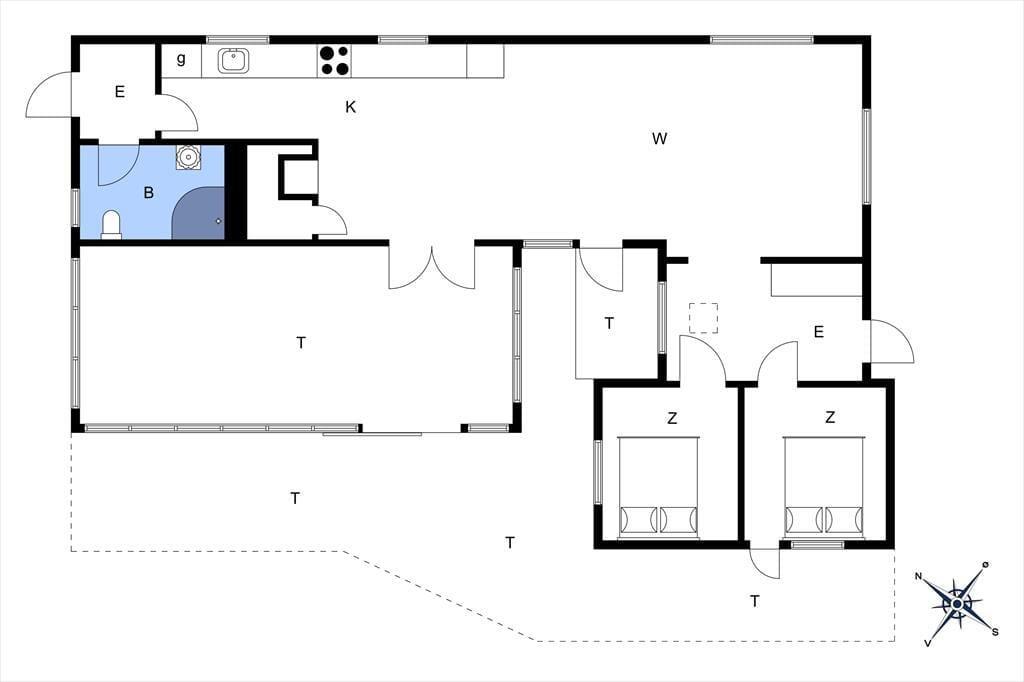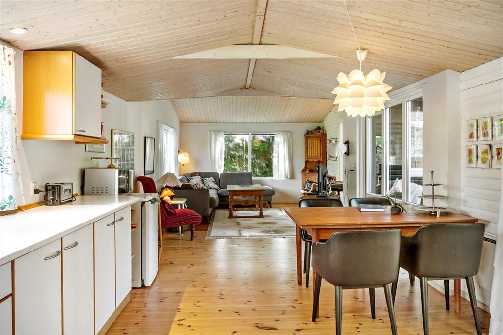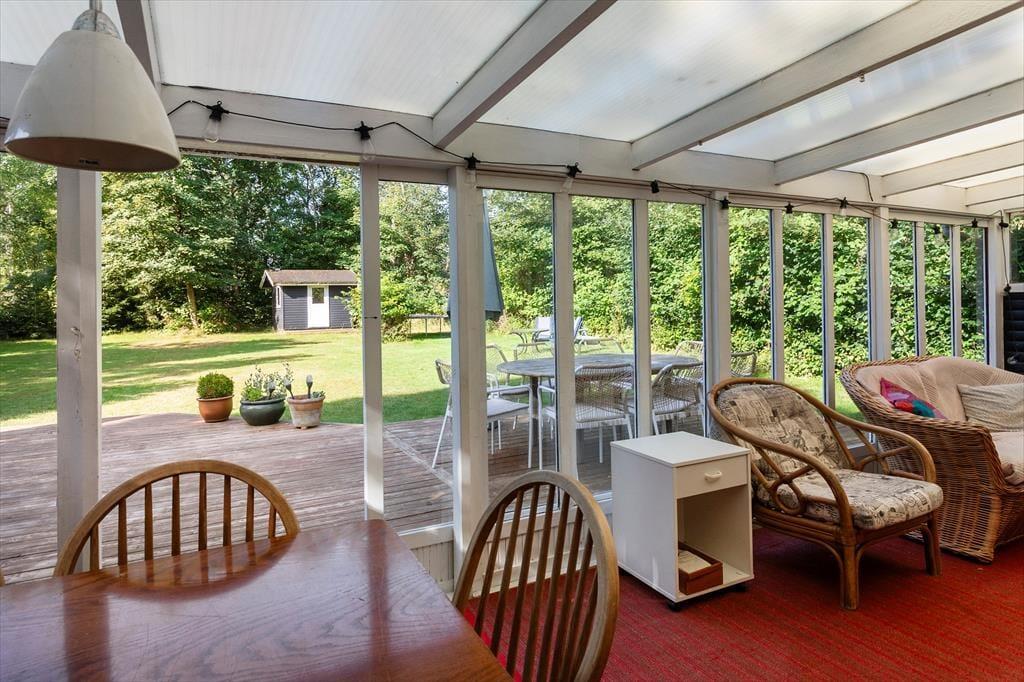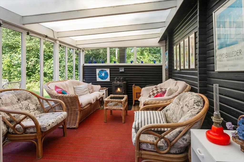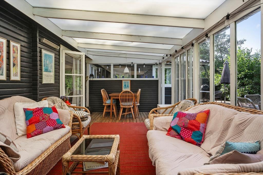 Das Ferienhaus bietet einen Eingangsbereich mit Zugang zur offenen Küche. Hier befinden sich ein Essbereich und eine gemütliche Sitzecke. Von hier aus gelangt man in den schönen Wintergarten. Darüber hinaus bietet das Haus ein Wohnzimmer mit Holzofen und zwei gemütliche Schlafzimmer mit je einem Doppelbett.