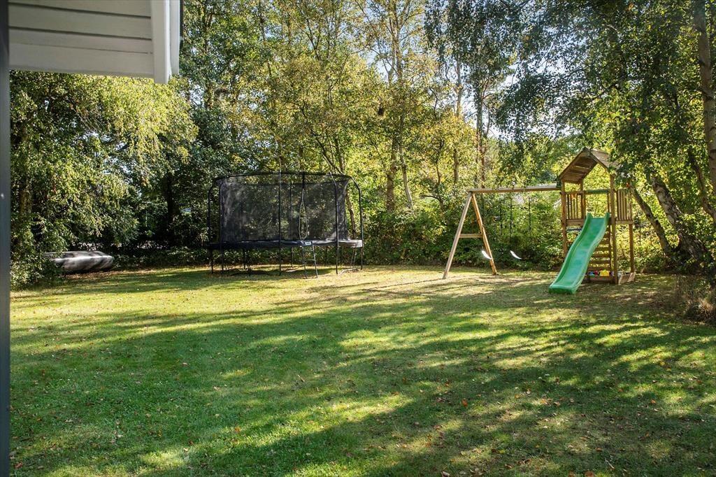 Draußen erwartet Sie eine schöne Holzterrasse – ideal zum Grillen, Sonnenbaden oder für ein Glas Wein in der Abendsonne. Der grüne Rasen lädt zum Spielen und Entspannen ein, und Kinder freuen sich über Trampolin und Spielturm.