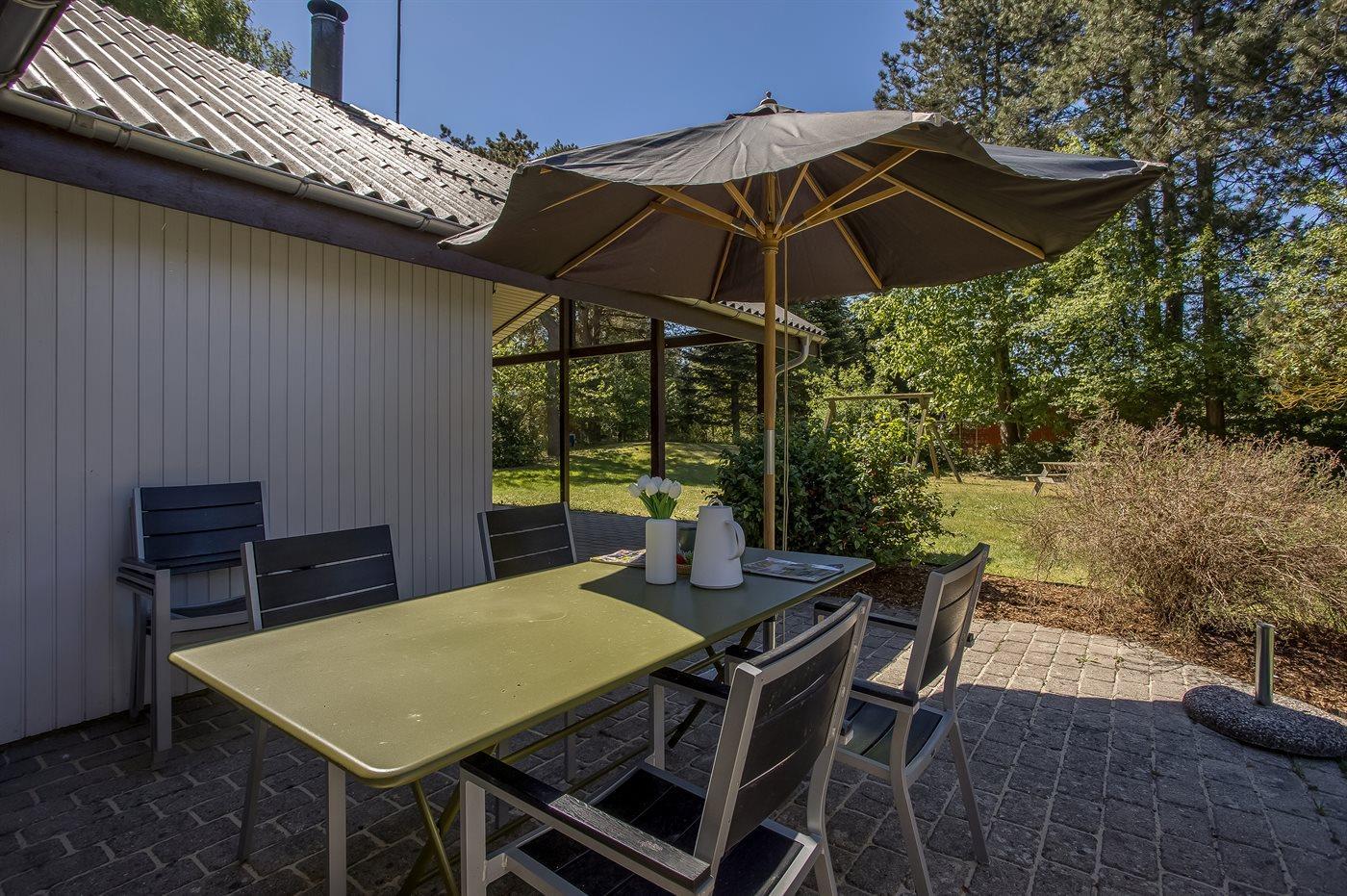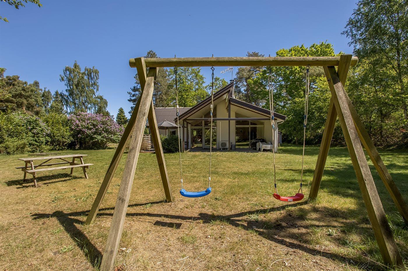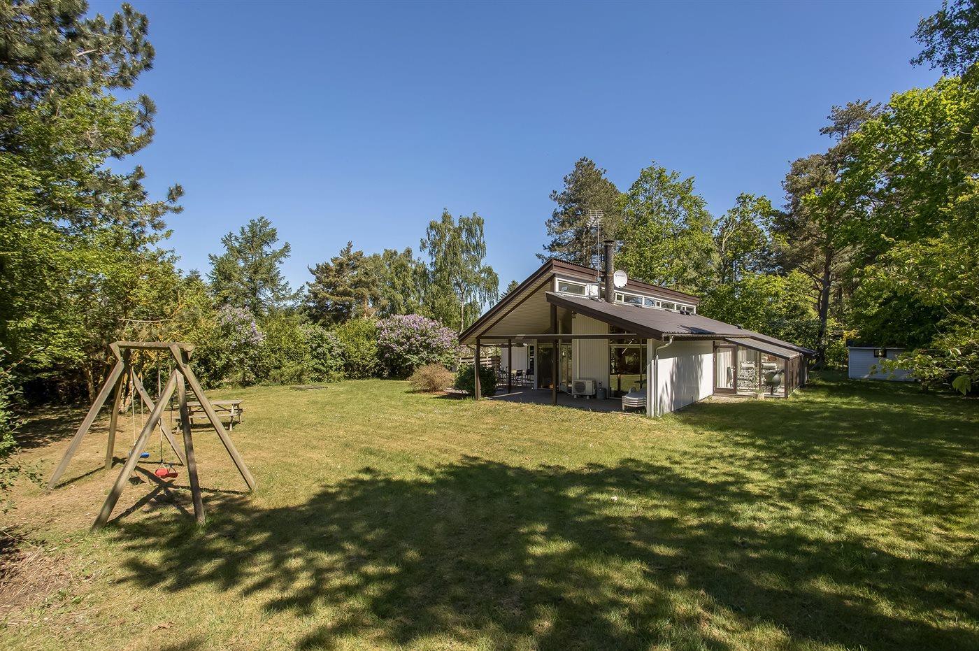 Zum Haus gehören sowohl eine offene als auch eine überdachte Terrasse, auf denen du schöne Stunden im Freien verbringen kannst. Außerdem gibt es einen Wintergarten mit großen Glasfronten und Blick auf den herrlichen Garten. Im Garten hast du die Möglichkeit, die Sonne zu genießen, und auch für die kleinen Urlaubsgäste ist gesorgt – da sowohl eine Schaukel als auch ein Sandkasten zur Verfügung stehen.