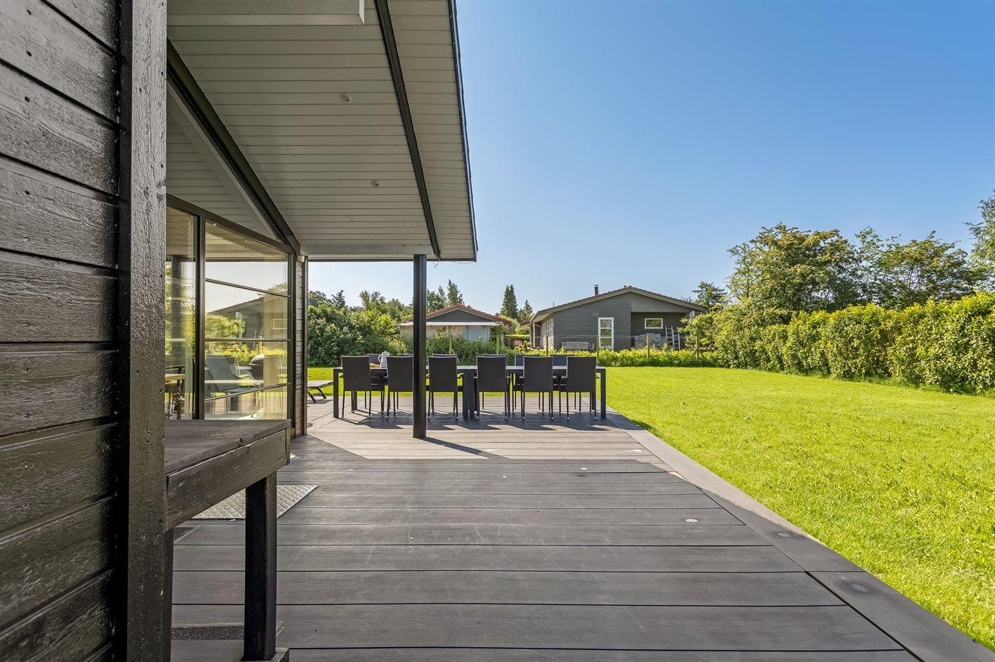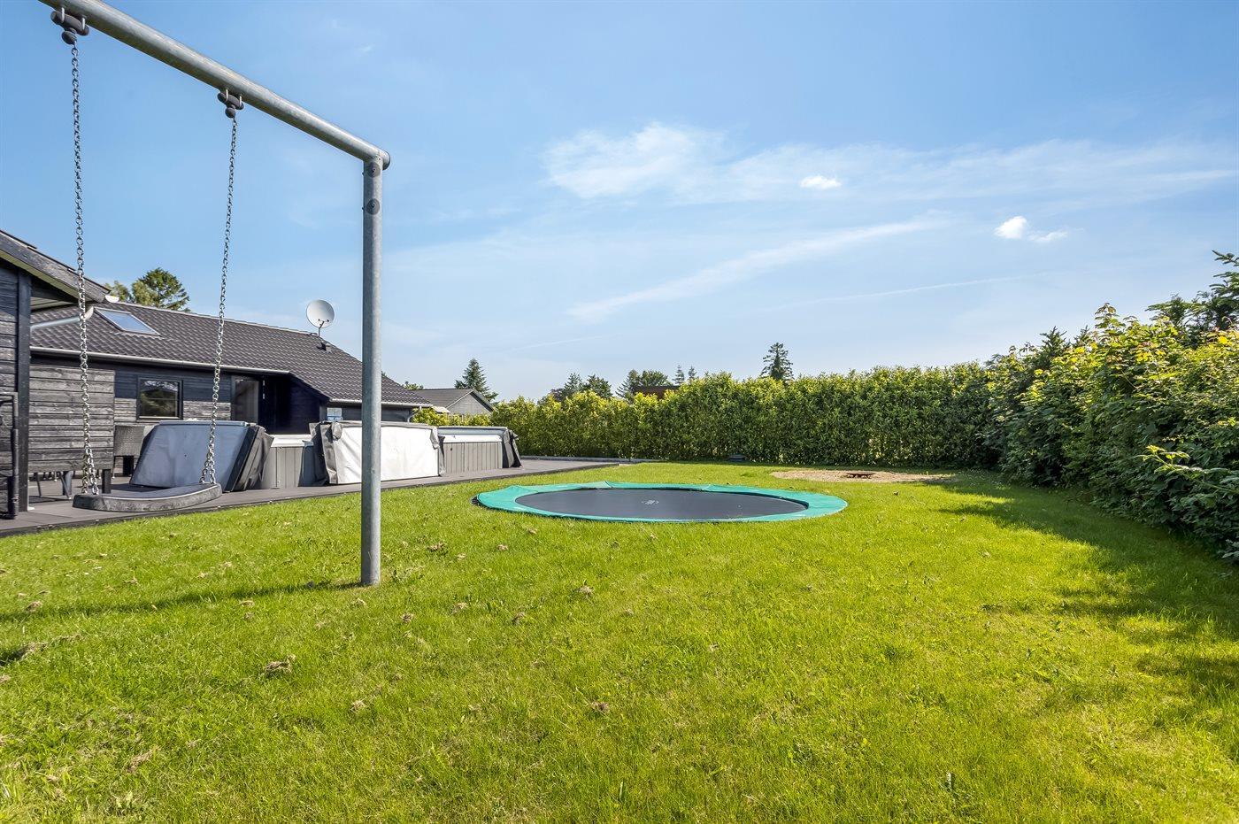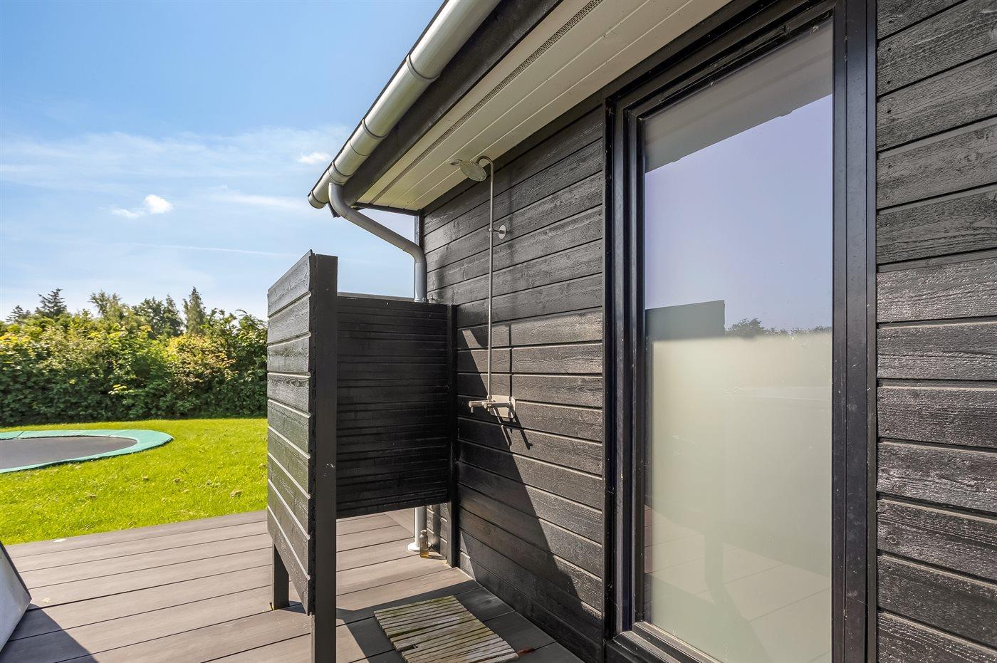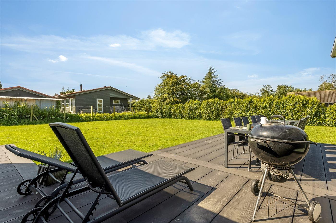 Die Ferienunterkunft liegt auf einem 1216 m² großen Gartengrundstück. Die Entfernung zum Meer beträgt 500 m. Es gibt einen Badesteg in der Nähe. Die nächste Einkaufsmöglichkeit liegt 200 m entfernt. In einem Abstand von 1000 m gibt es einen Golfplatz. Es steht ein offenes Terrassenareal zur Verfügung. Außerdem gibt es überdachte Terrasse. Schaukel. Trampolin. Fußballtor.Lagerfeuerstelle. Außendusche. Es beteht die Möglichkeit das Essen in der Außenküche zuzubereiten. Es steht ein Grill zur Verfügung. Parkplatz auf dem Grundstück.