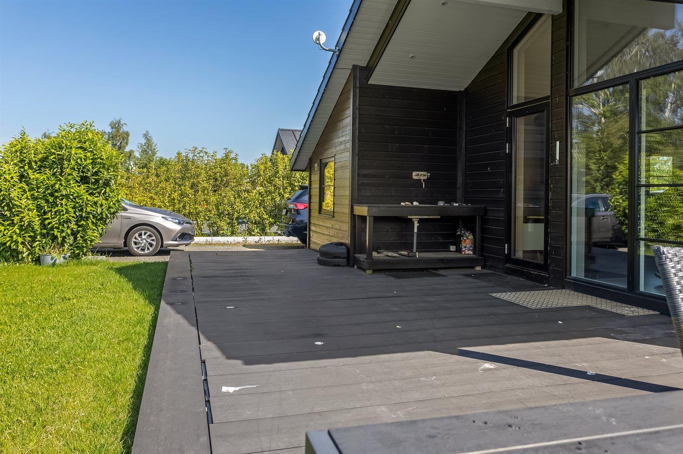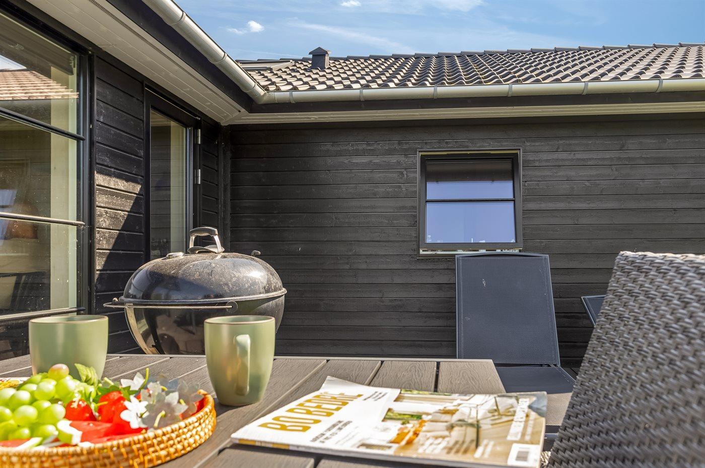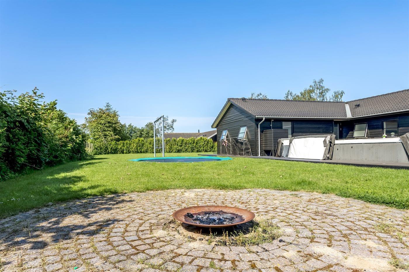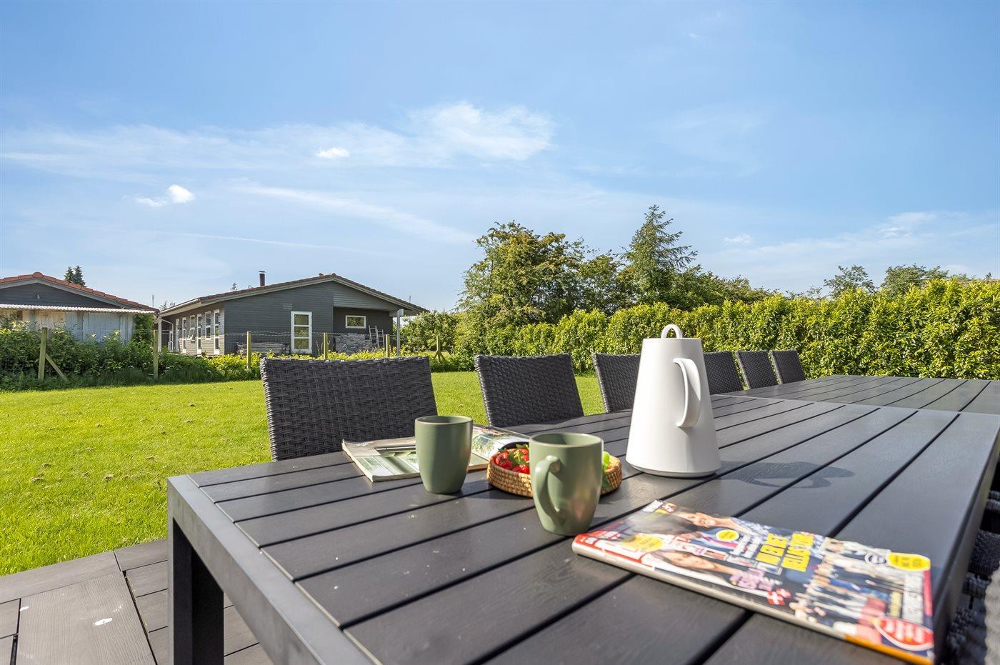 Die Ferienunterkunft liegt auf einem 1216 m² großen Gartengrundstück. Die Entfernung zum Meer beträgt 500 m. Es gibt einen Badesteg in der Nähe. Die nächste Einkaufsmöglichkeit liegt 200 m entfernt. In einem Abstand von 1000 m gibt es einen Golfplatz. Es steht ein offenes Terrassenareal zur Verfügung. Außerdem gibt es überdachte Terrasse. Schaukel. Trampolin. Fußballtor.Lagerfeuerstelle. Außendusche. Es beteht die Möglichkeit das Essen in der Außenküche zuzubereiten. Es steht ein Grill zur Verfügung. Parkplatz auf dem Grundstück.