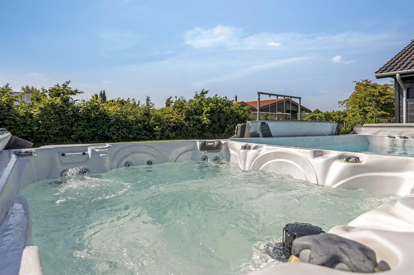Entspannen Sie sich im Innen-Durchlauf-Whirlpool für 2 Personen. Im Außen-Standwasser-Whirlpool für 5 Personen können Sie sowohl die Unterwassermassage als auch den Aufenthalt im Freien genießen.