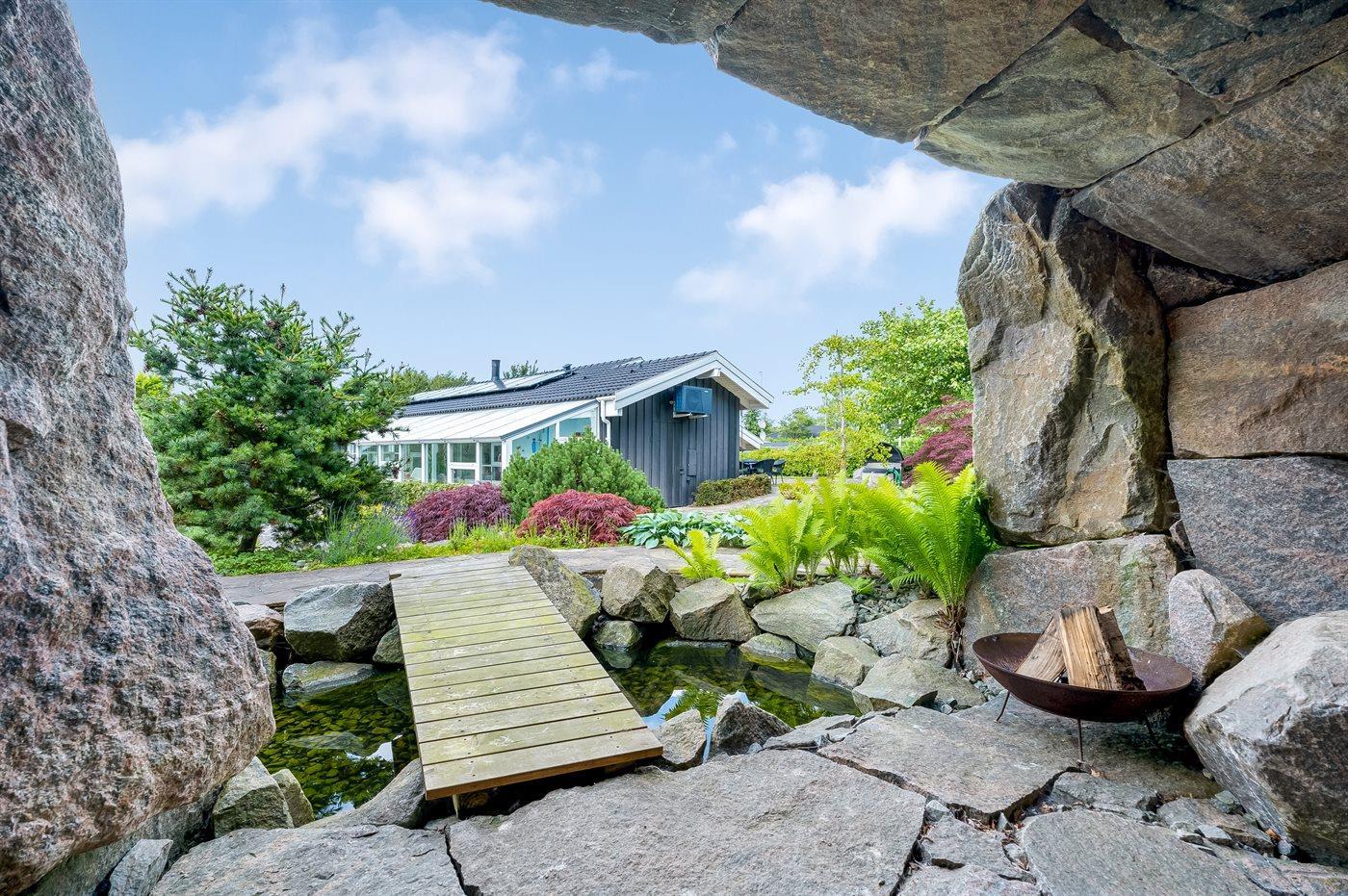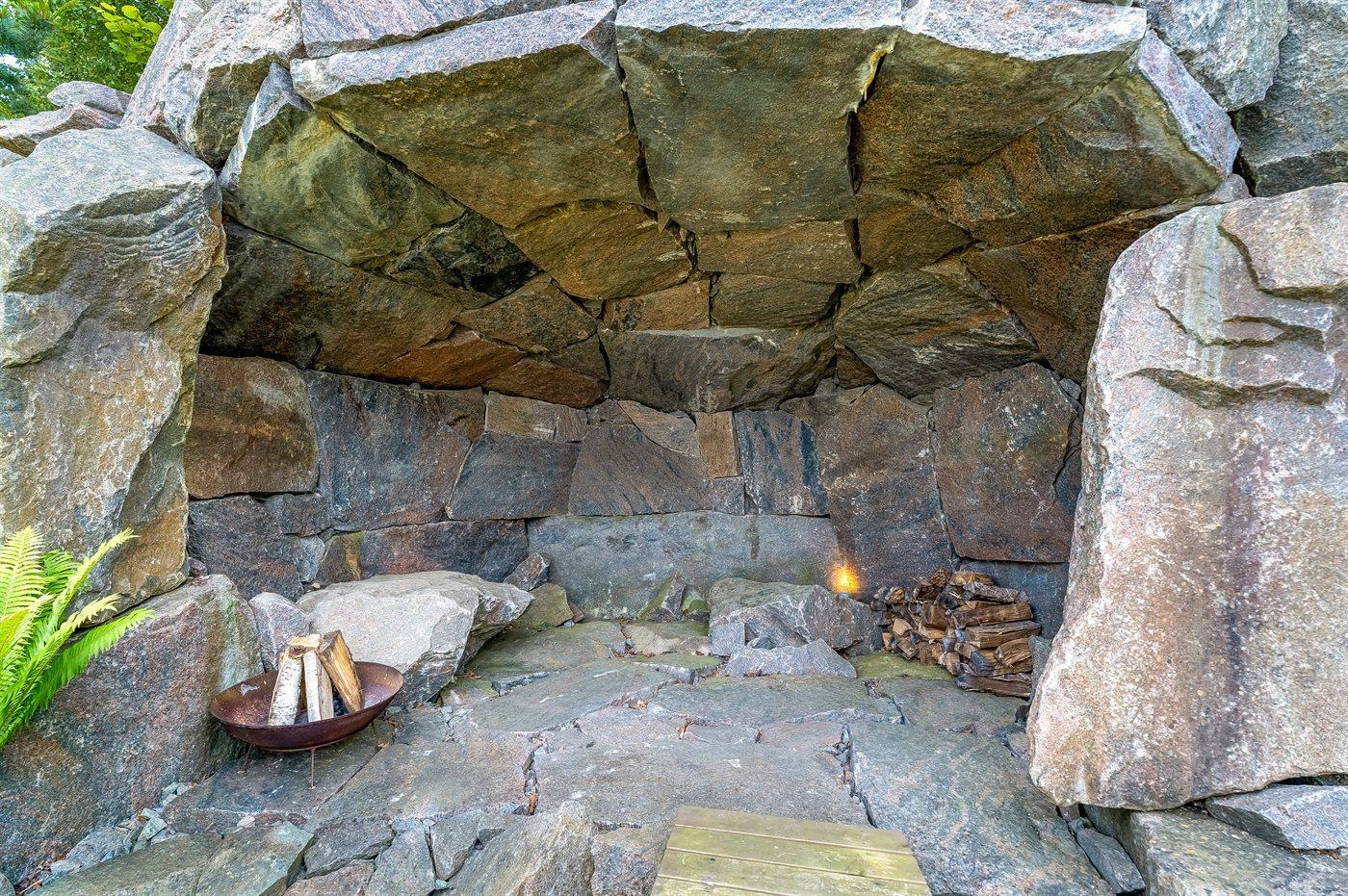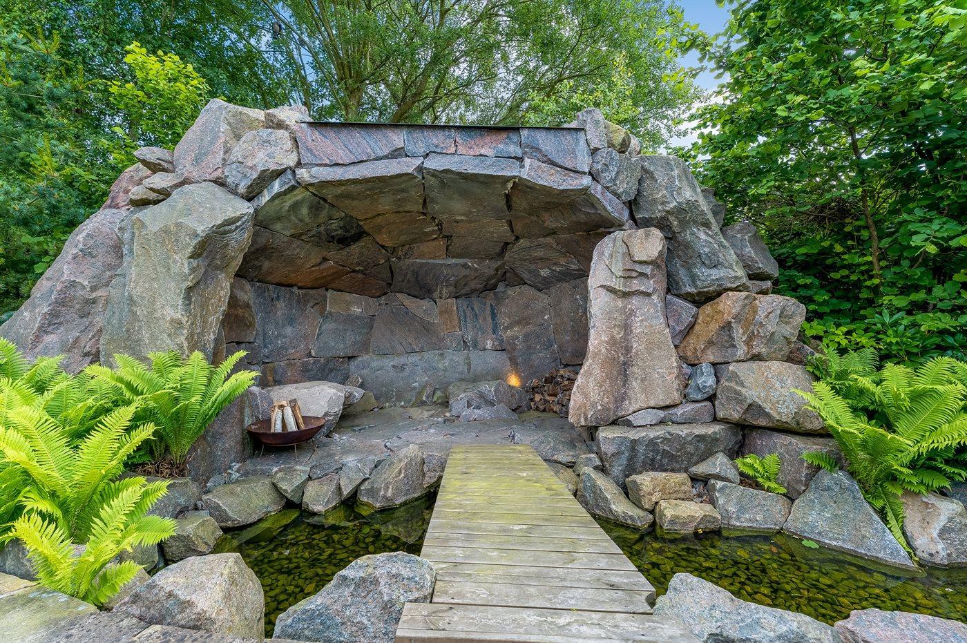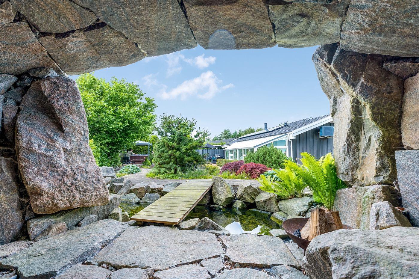Das Haus besticht mit seinem, von Italien inspiriertem Garten aus Granit. Dort findest du einen Bachlauf mit Springbrunnen, ein Putting Green, mehrere schöne Sonnenplätze – und nicht zu vergessen die große Grotte, die an heißen Sommertagen angenehm kühl ist und im Winter mit einer Feuerschale beheizt werden kann.