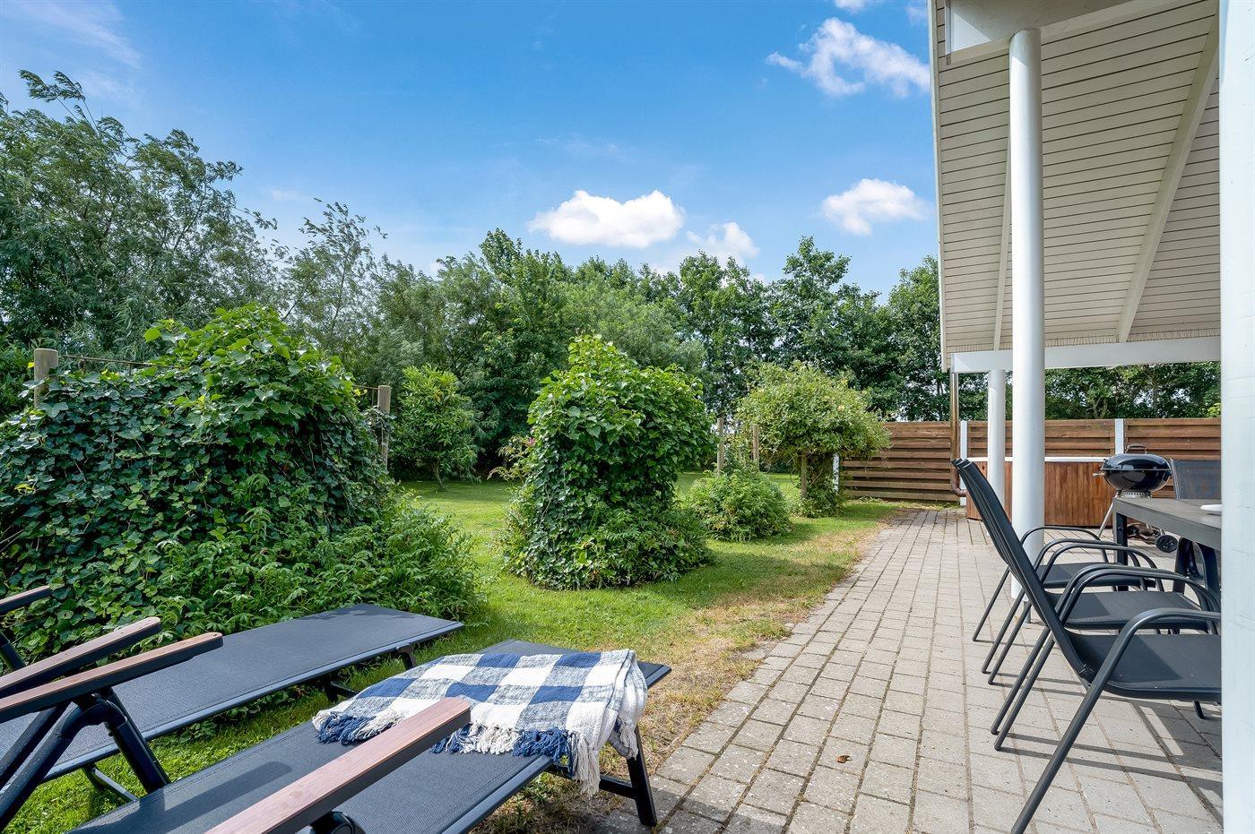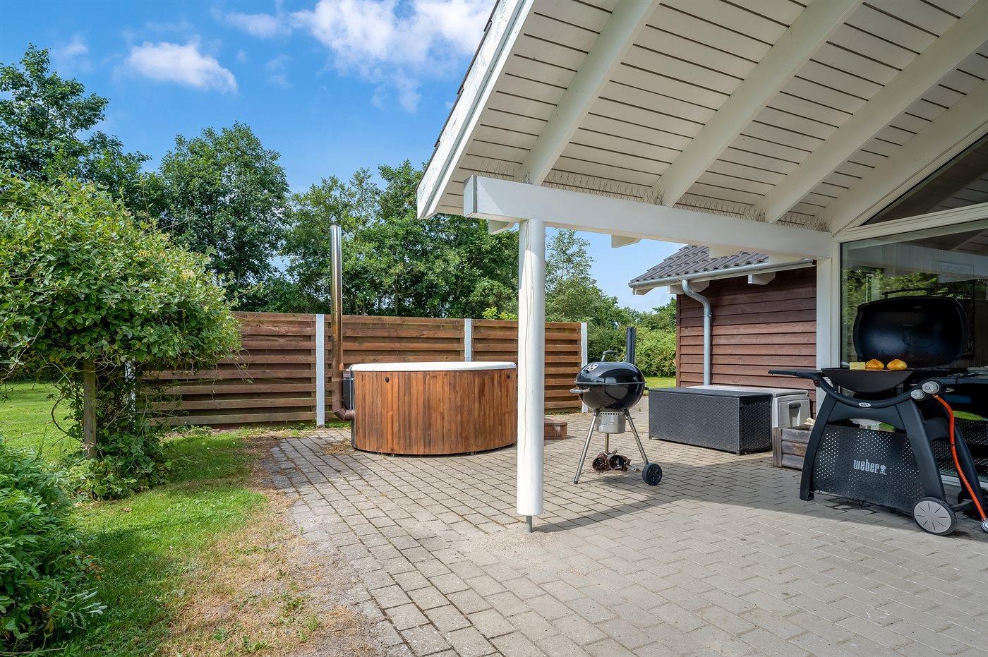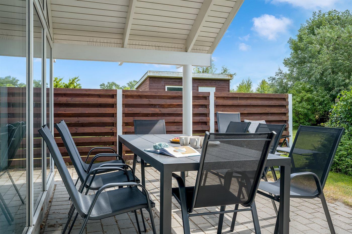 Die schöne Terrasse – teils überdacht, teils offen – bietet viel Platz für die ganze Familie an herrlichen Sommertagen und -abenden. Auf dem Grundstück des Ferienhauses gibt es viel Raum für Gemütlichkeit und Spiele.