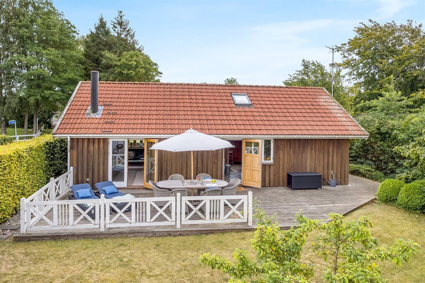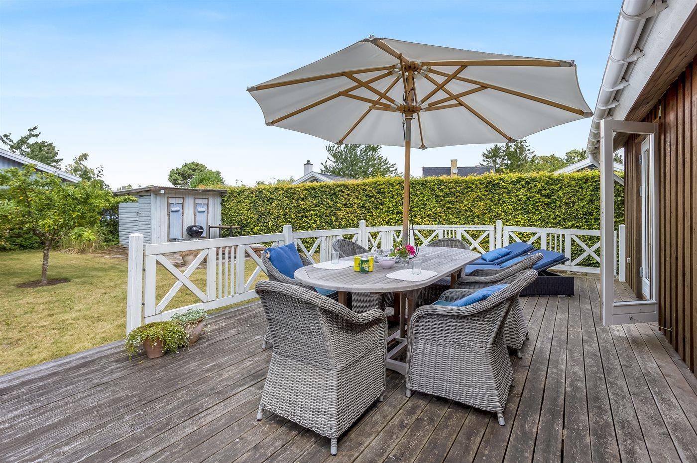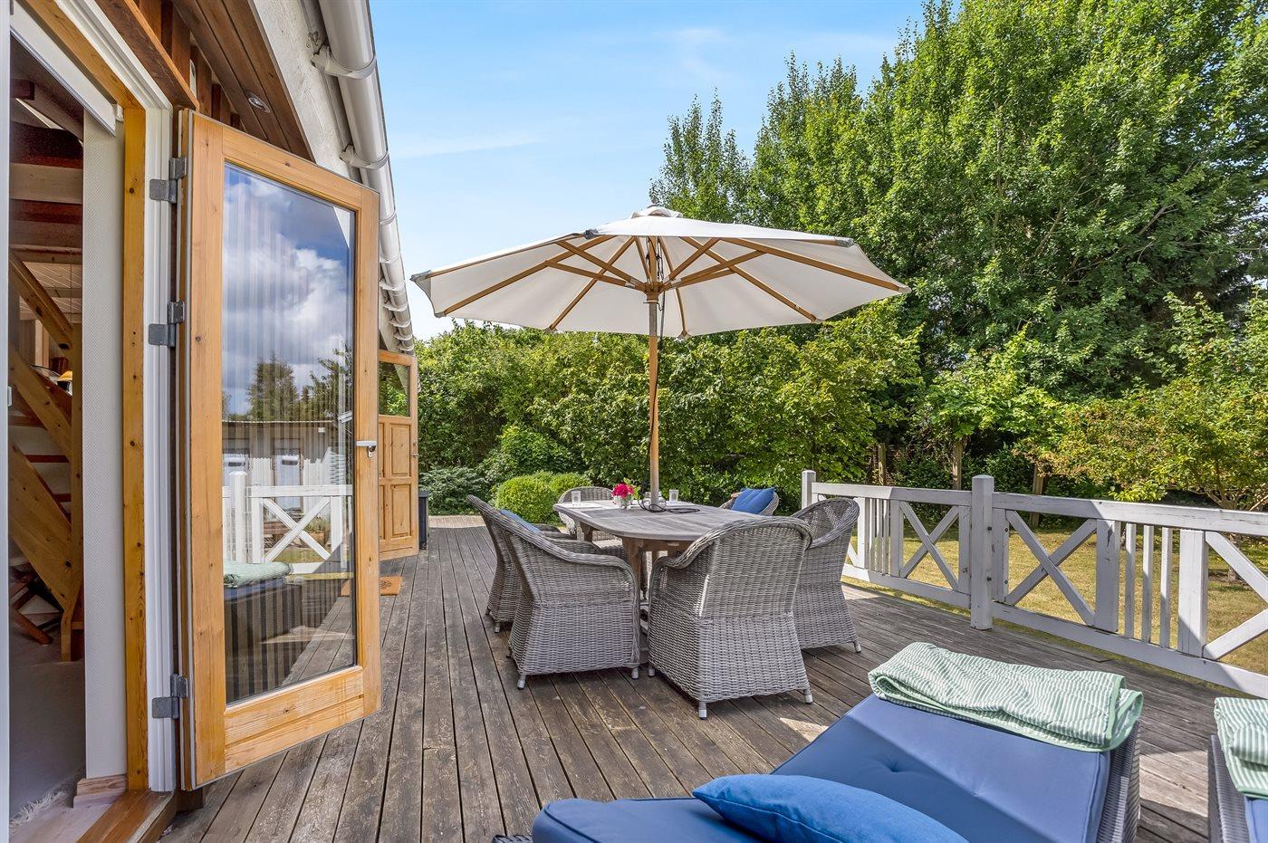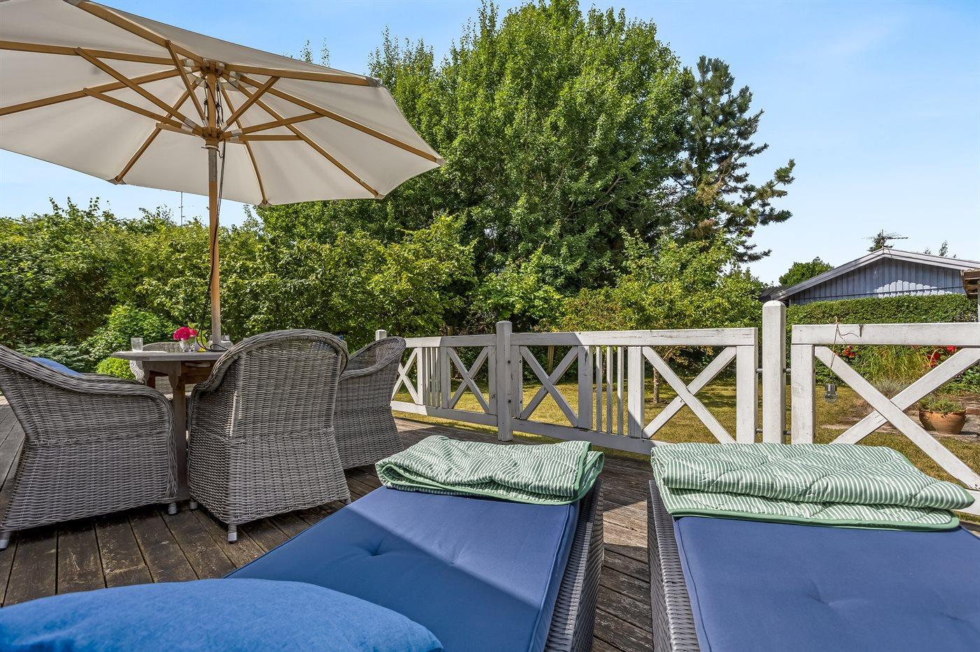 Zum Haus gehört auch eine gemütliche Holzterrasse mit Liegestühlen, Gartenmöbeln und Grill – hier kannst du viele Stunden im Freien verbringen, sei es mit einem guten Buch oder einem leckeren Essen das auf dem Grill zubereitet wurde.