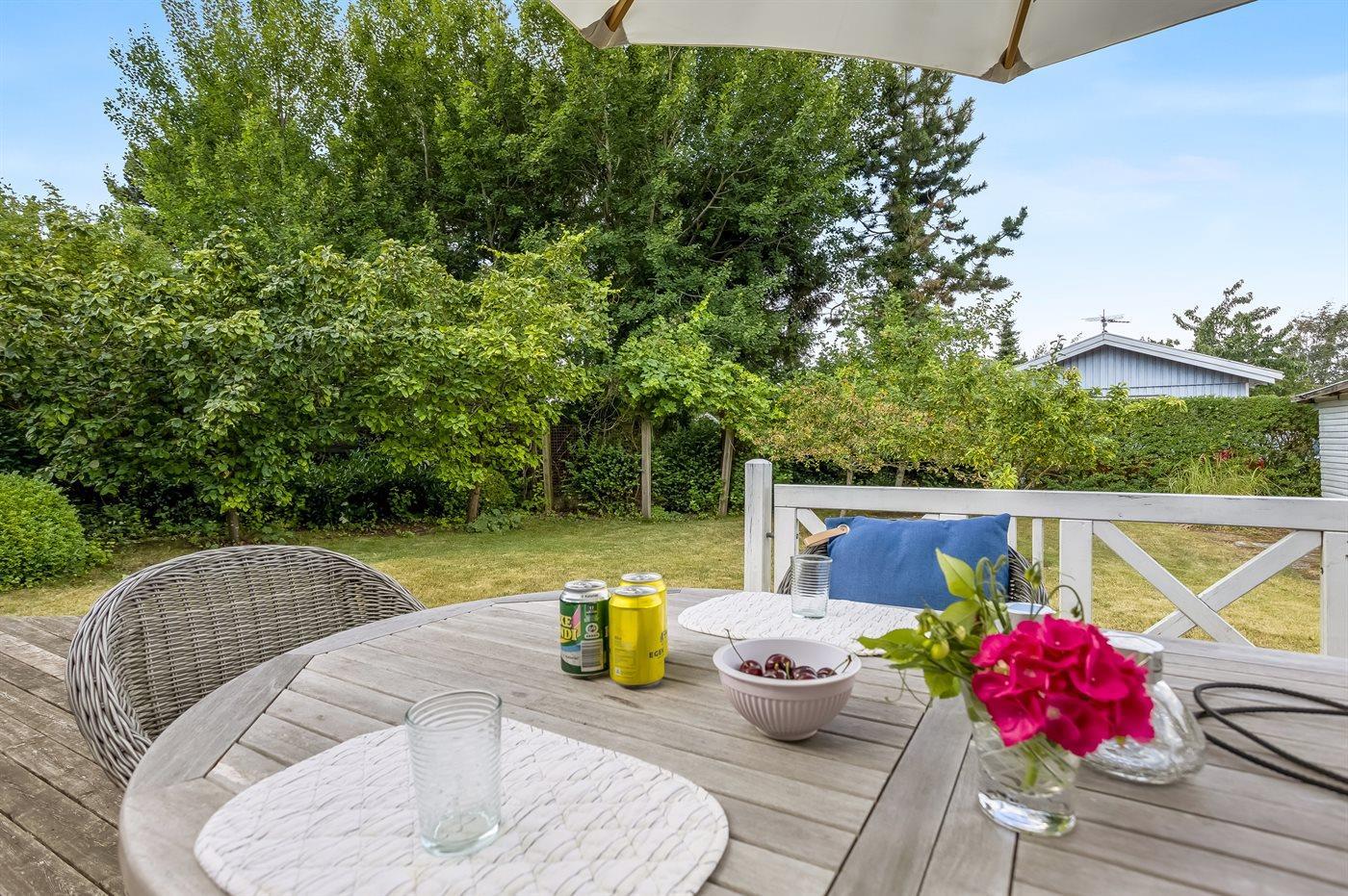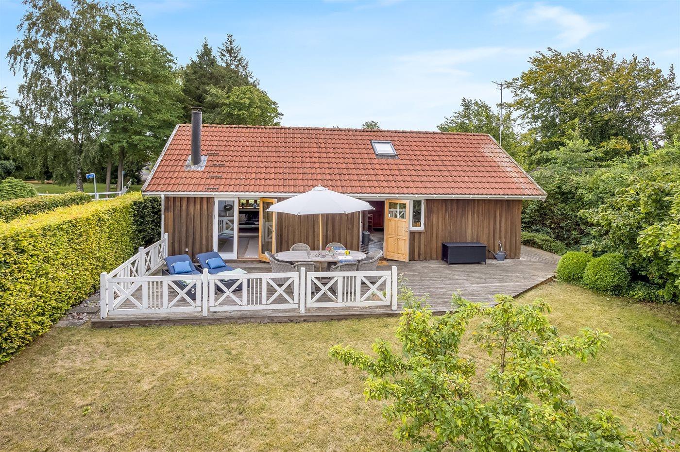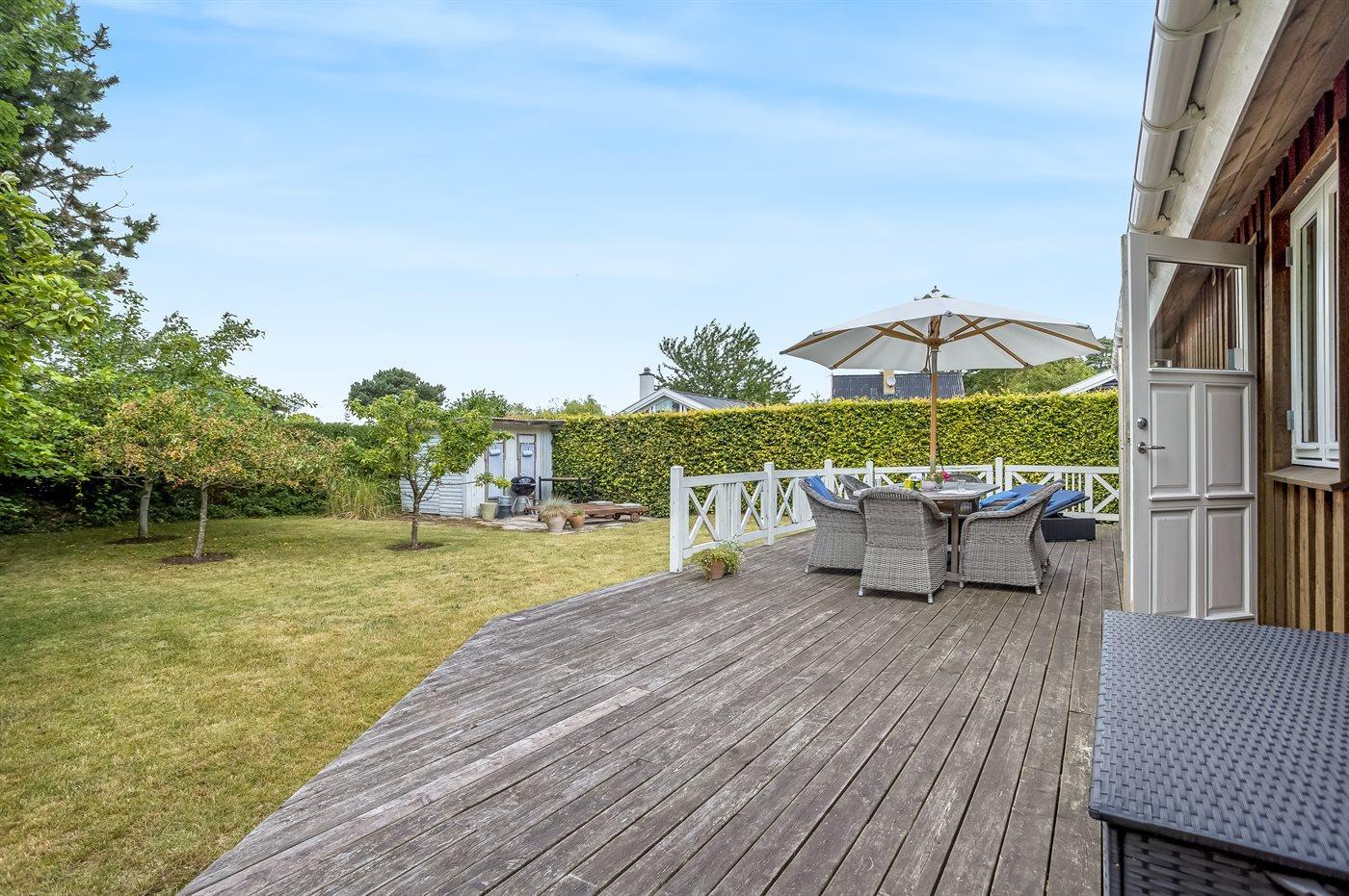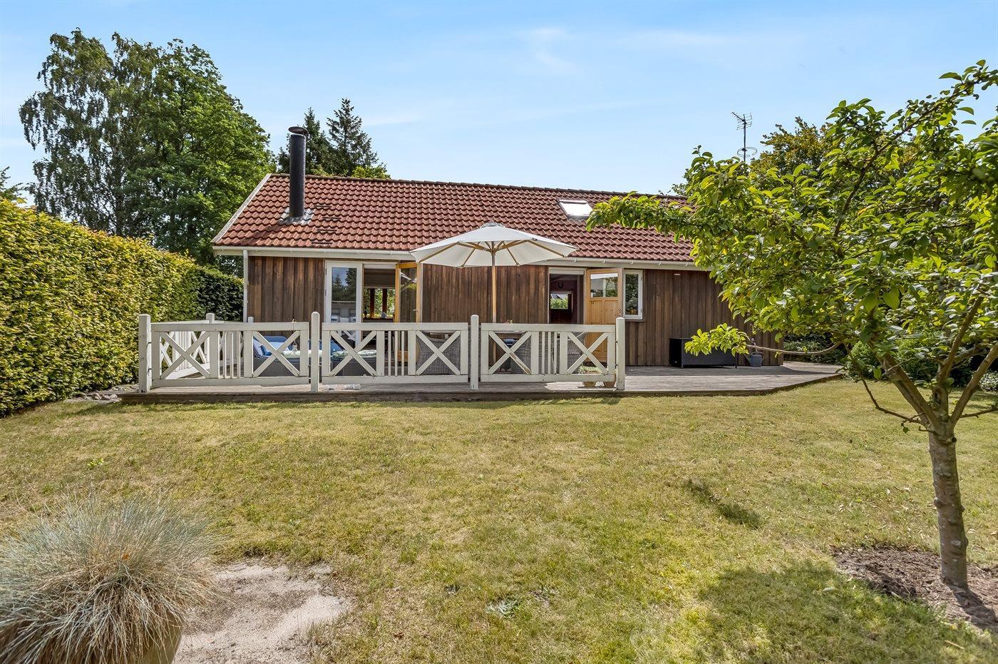 Zum Haus gehört auch eine gemütliche Holzterrasse mit Liegestühlen, Gartenmöbeln und Grill – hier kannst du viele Stunden im Freien verbringen, sei es mit einem guten Buch oder einem leckeren Essen das auf dem Grill zubereitet wurde.