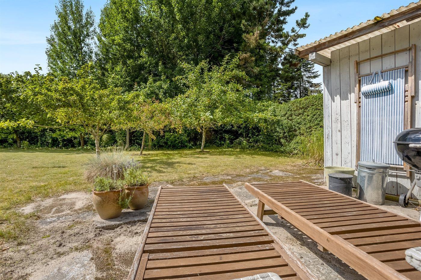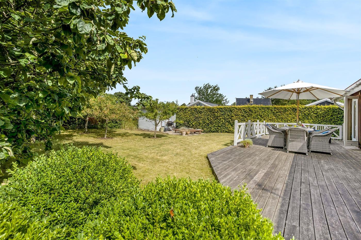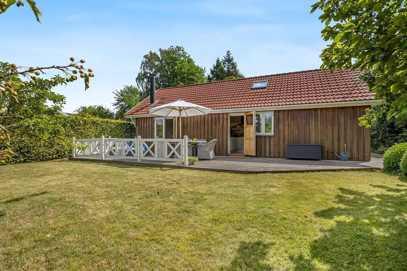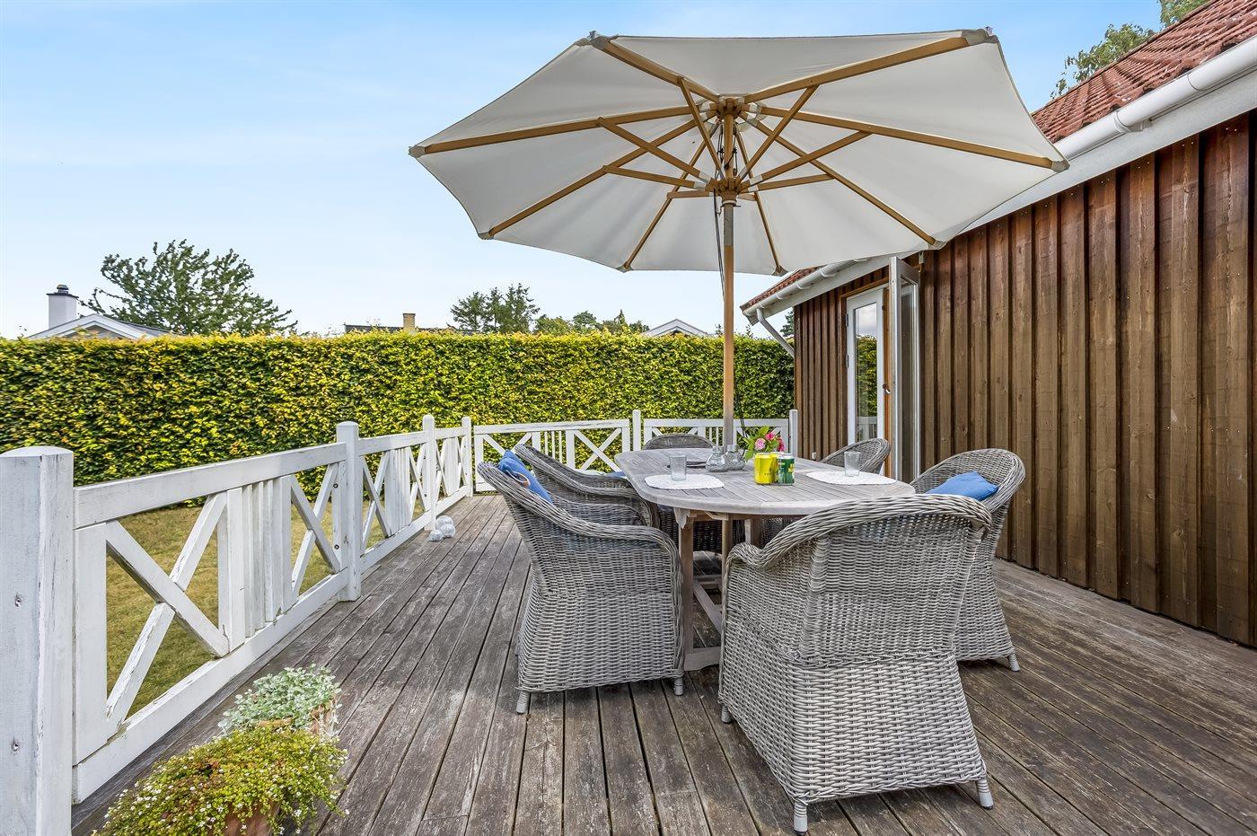 Zum Haus gehört auch eine gemütliche Holzterrasse mit Liegestühlen, Gartenmöbeln und Grill – hier kannst du viele Stunden im Freien verbringen, sei es mit einem guten Buch oder einem leckeren Essen das auf dem Grill zubereitet wurde.
