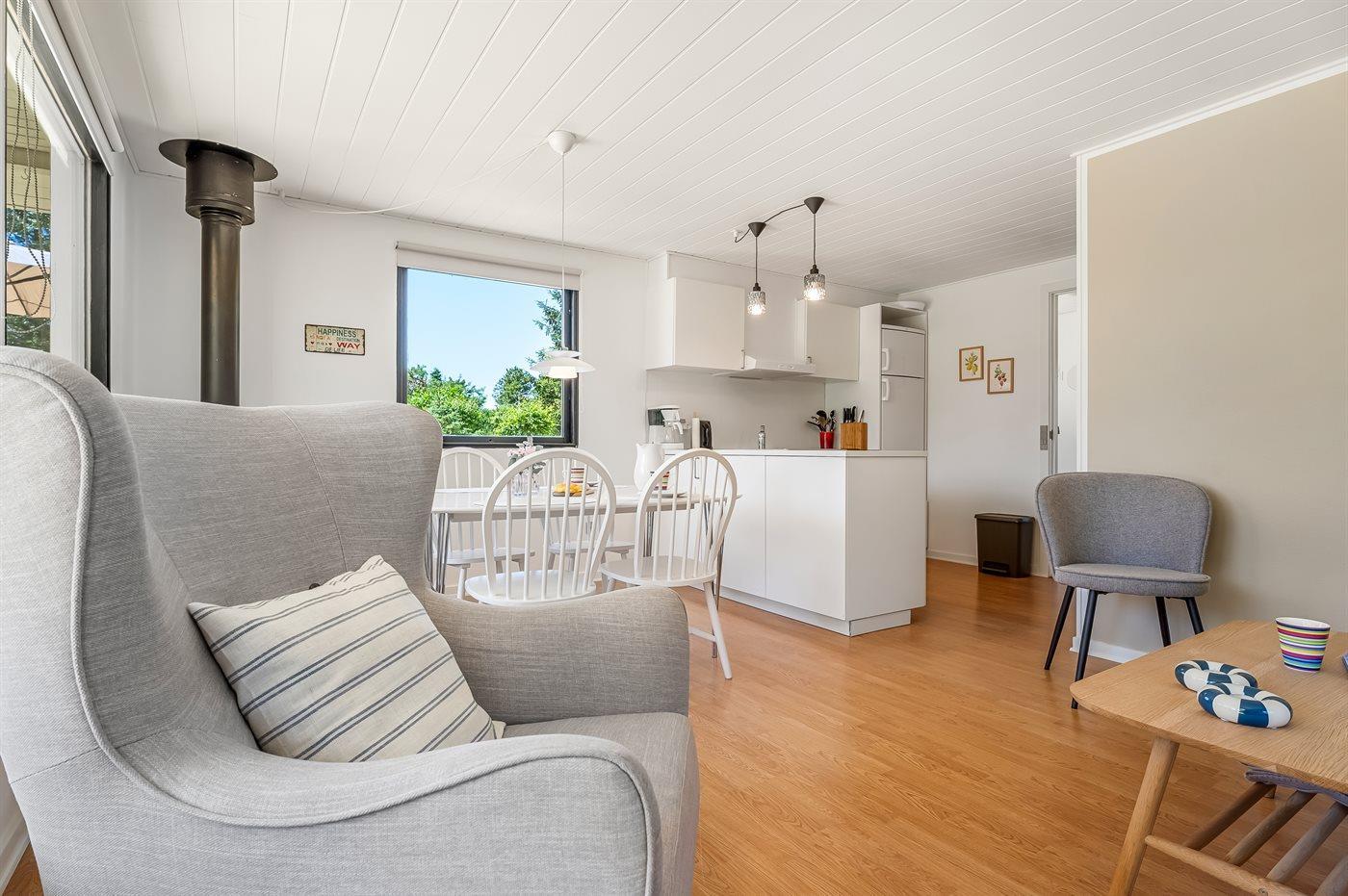 Dieses funktional und hell eingerichtete Holzhaus bietet eine offene Atmosphäre und gemütliche Details. Das Wohnzimmer ist mit bequemen Möbeln ausgestattet, und die großen Fenster in der Sofaecke sorgen für viel Tageslicht. Bei gutem Wetter könnt ihr euch auf den komfortablen Gartenmöbeln entspannen und köstliche Grillgerichte auf der offenen und teilweise überdachten Terrasse genießen.