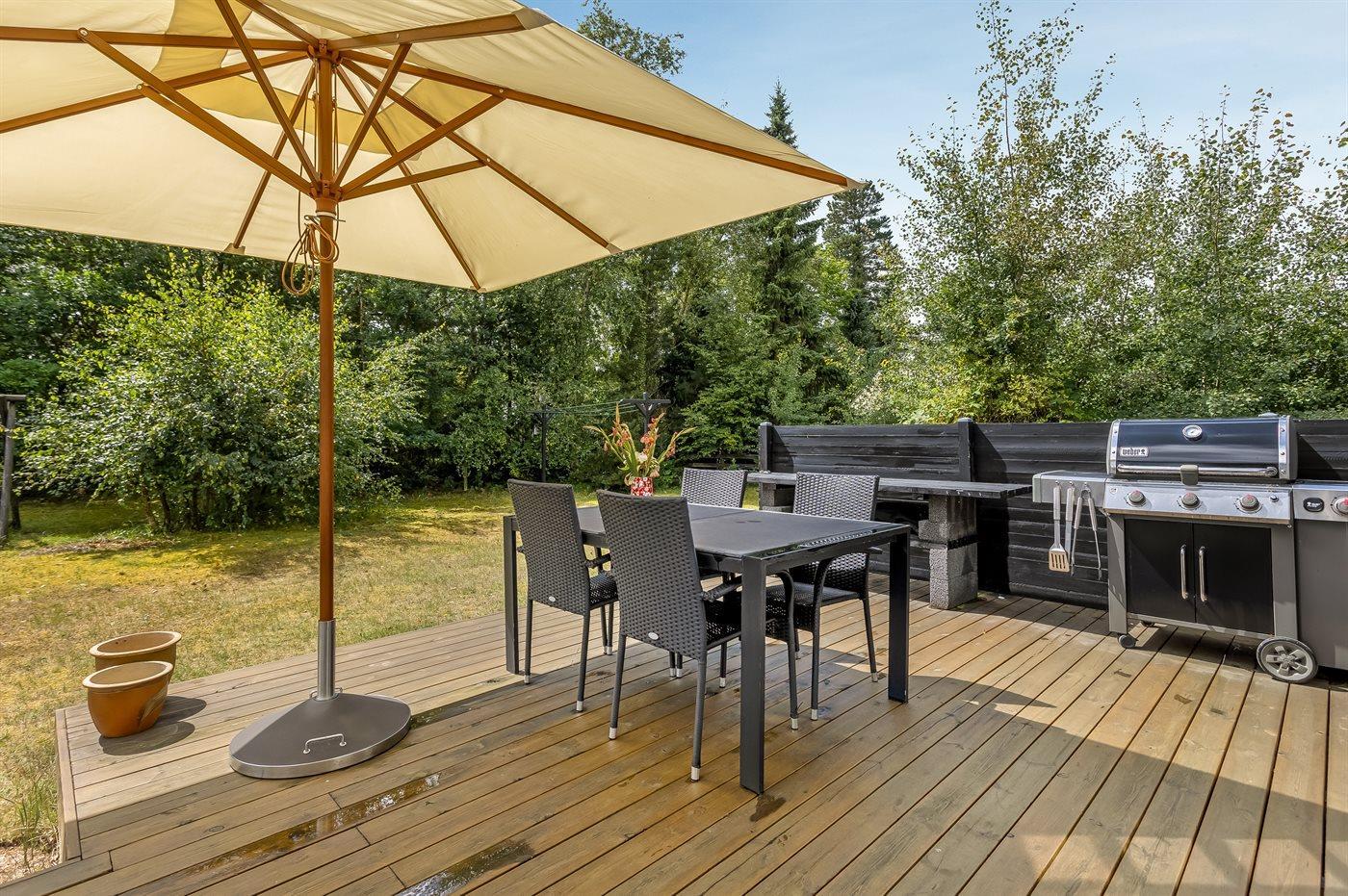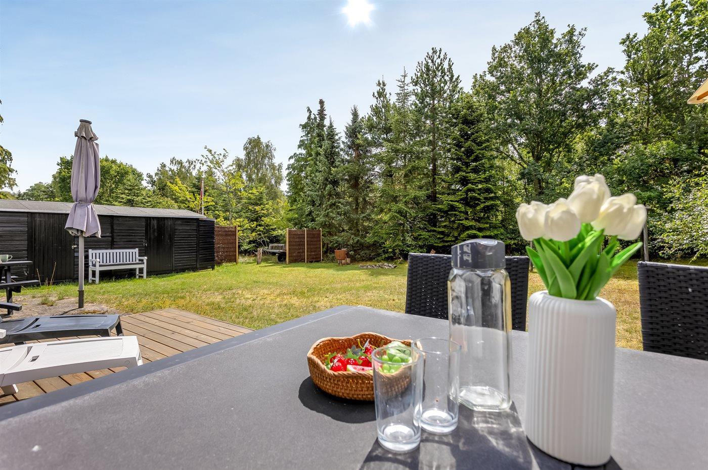 Gemütliches Holzferienhaus in ruhiger Lage nahe Sandstrand mit Terrasse und Gartenmöbeln.