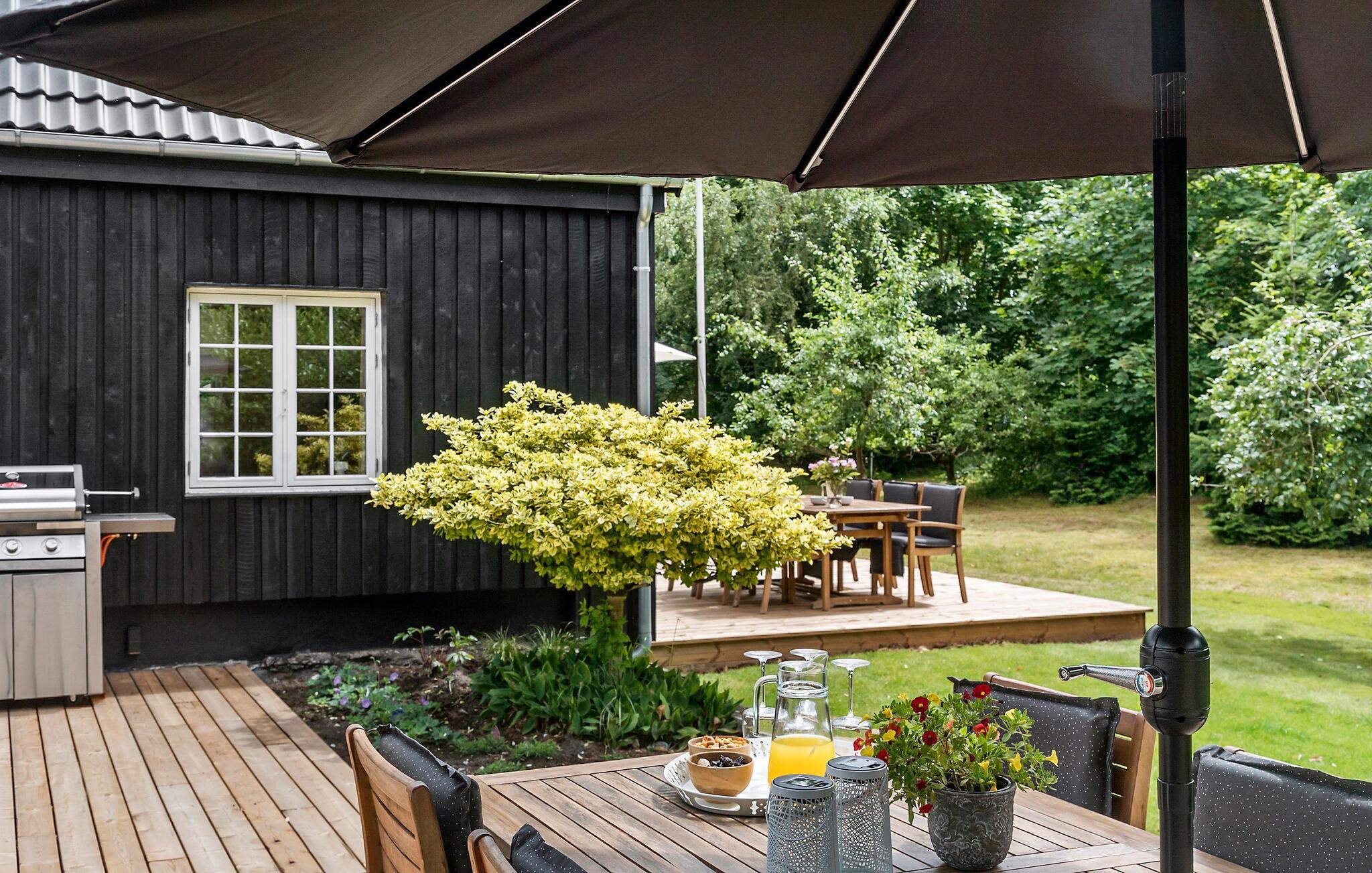 Entspannen Sie auch unter dem Sonnenschirm auf der sonnigen Terrasse. Der schöne Garten bietet reichlich Platz für Aktivitäten mit der Familie.