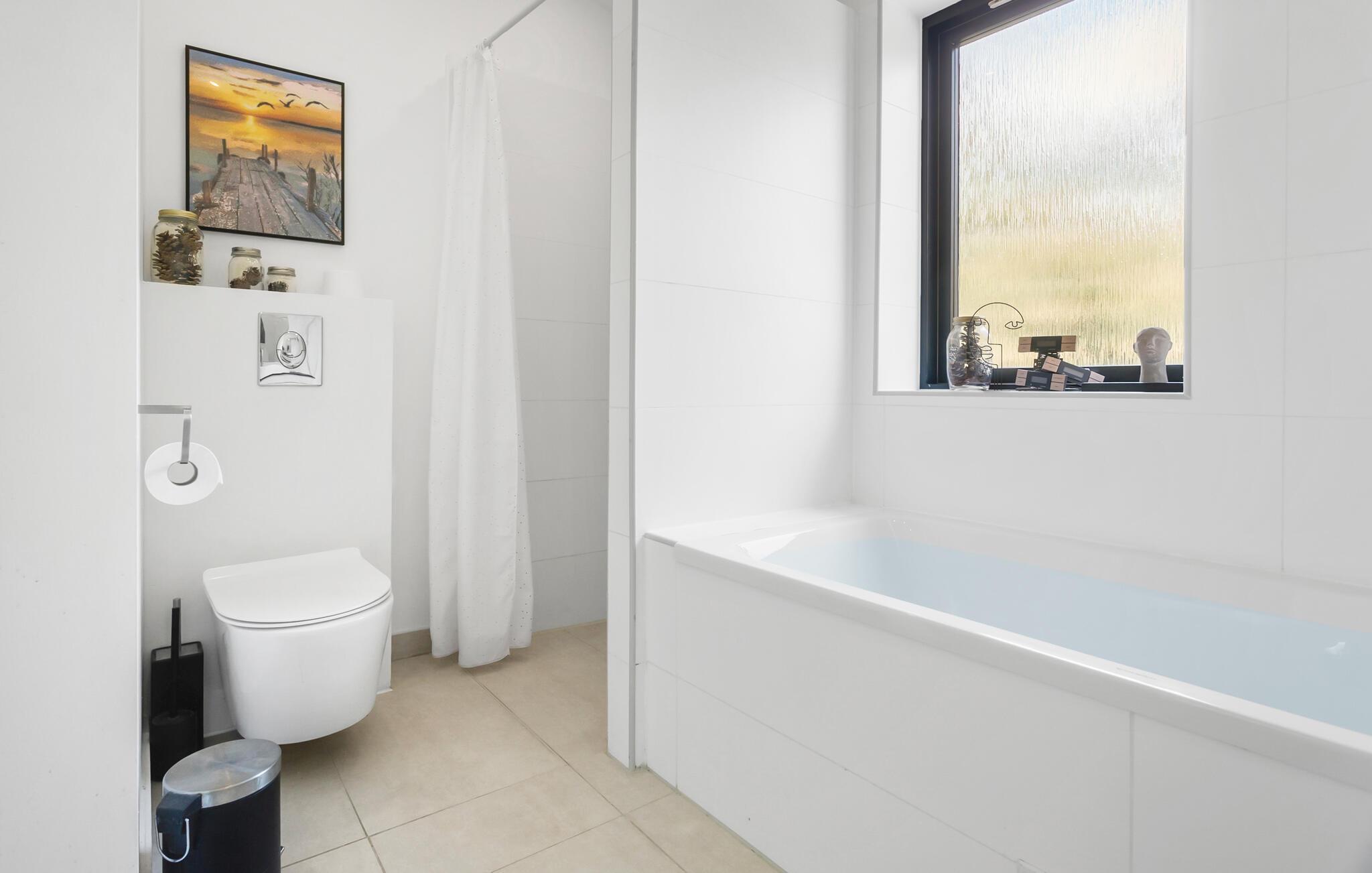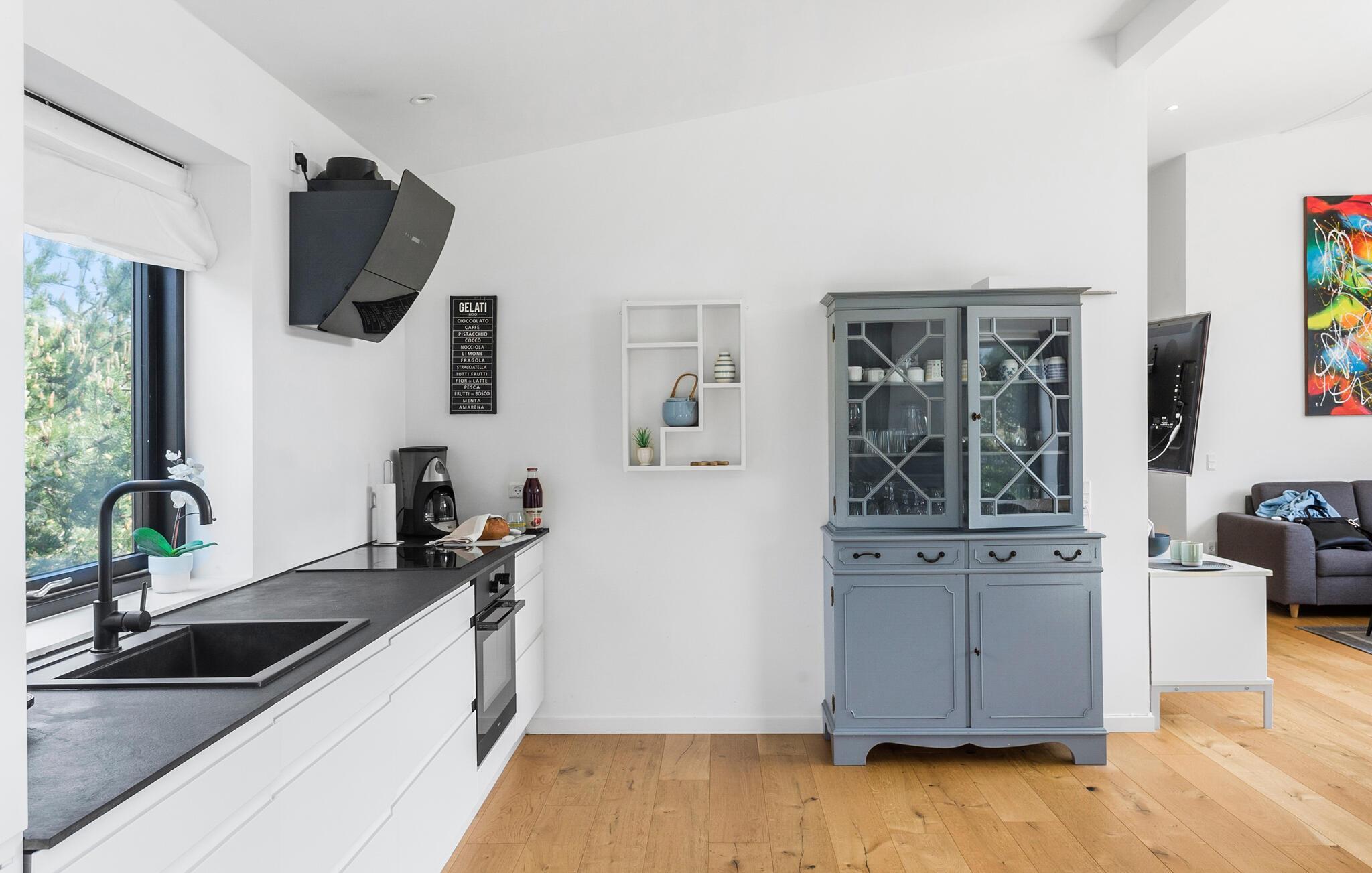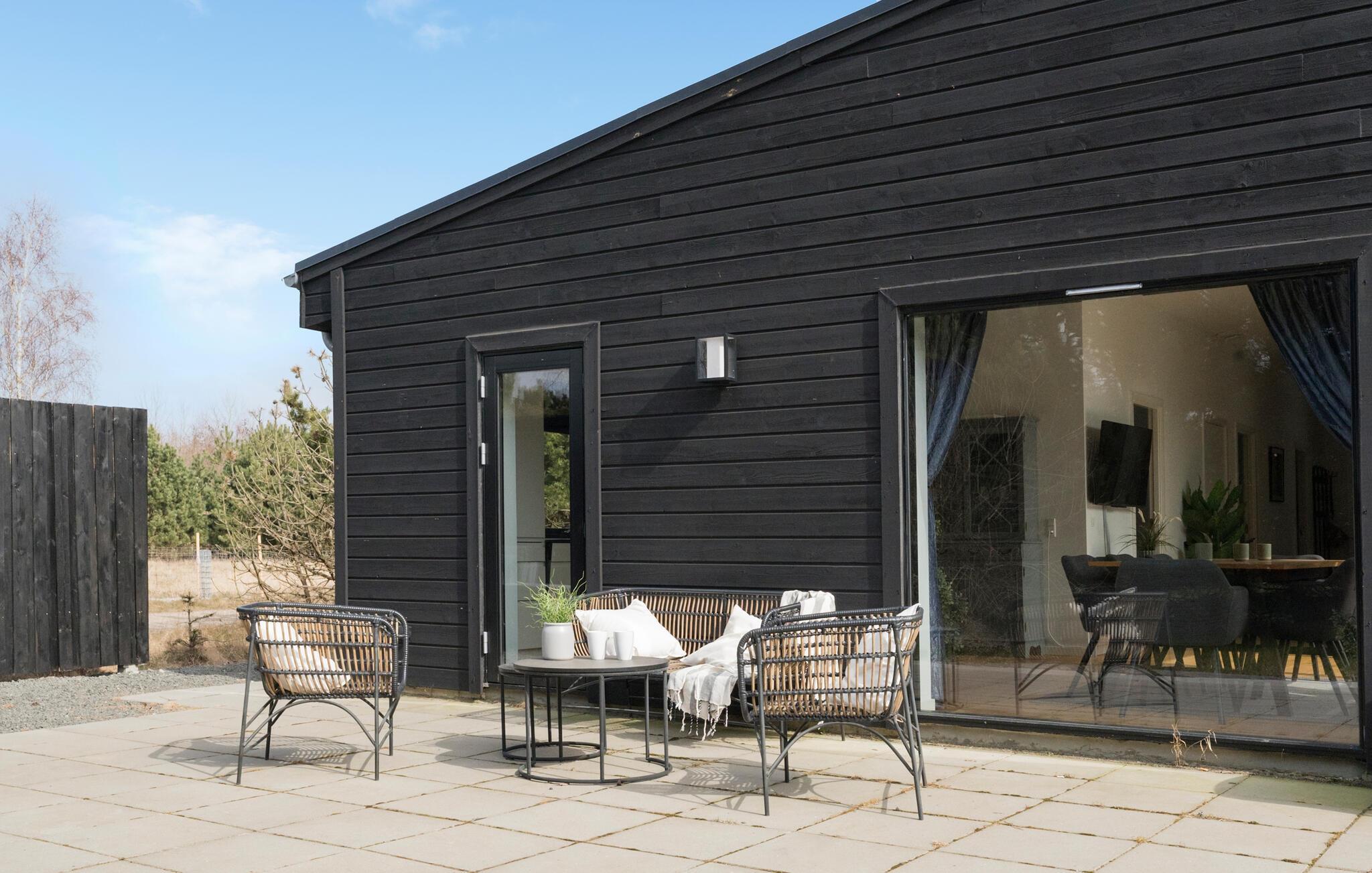 Dieses moderne Ferienhaus bietet alles, was Sie für Ihren Dänemark-Urlaub benötigen. Genießen Sie die hellen, großzügigen Räume mit den großen Fenstern, die viel Licht hereinlassen und einen wunderbaren Ausblick auf den Garten bieten. In dieser heimeligen Atmosphäre werden Sie sich wohlfühlen. Nutzen Sie die gut ausgestattete Küche, um den Kochlöffel zu schwingen, vielleicht ja auch zusammen mit Ihren Kindern. Genießen Sie Ihre kulinarischen Zaubereien am angrenzenden, gemütlichen Esstisch und entspannen Sie im komfortablen Wohnbereich auf den bequemen Sofas. Direkt auf der anderen Seite der Fensterfront erwartet Sie Ihre Terrasse.
