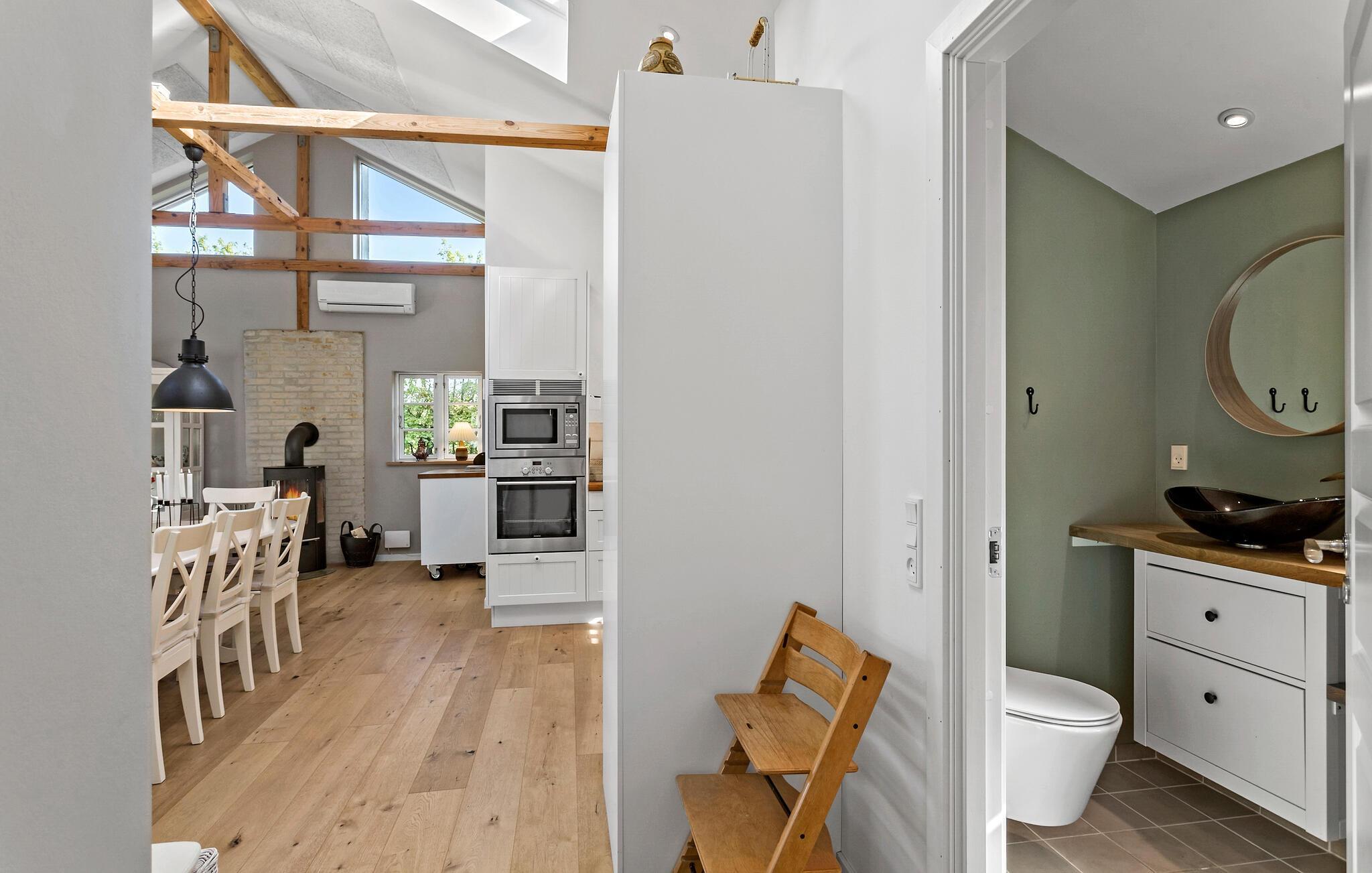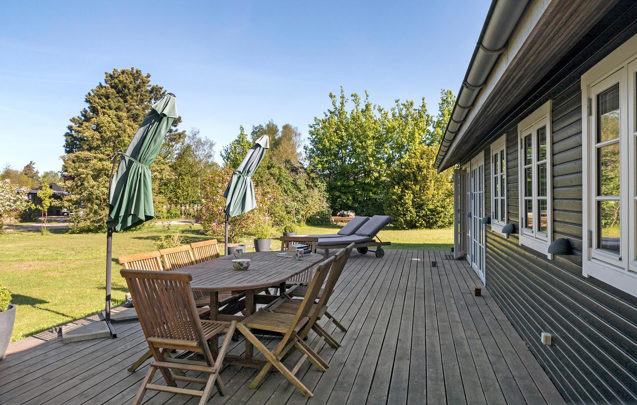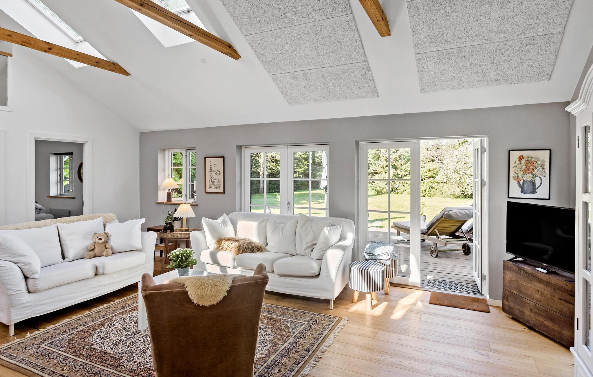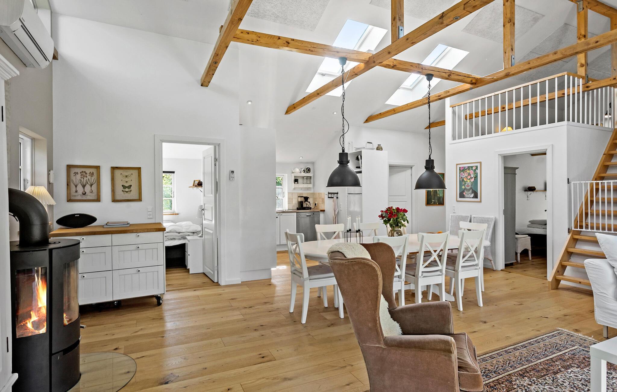Dieses stilvolle und komfortable Ferienhaus bietet Ihnen und Ihrer Familie die Möglichkeit, eine wohlverdiente Auszeit zu genießen. Beginnen Sie Ihren Tag mit einem ausgiebigen Frühstück am Esstisch oder auf der sonnigen Terrasse, wo Sie die frische Luft und den Blick ins Grüne genießen können. Der großzügige Wohnbereich mit den stimmungsvollen Holzbalken an der Decke und den großen Fensterfronten lässt viel Licht herein und bietet einen herrlichen Blick auf den weitläufigen Garten. Machen Sie es sich auf den gemütlichen Sofas bequem und entspannen Sie mit einem guten Film oder einem spannenden Buch.