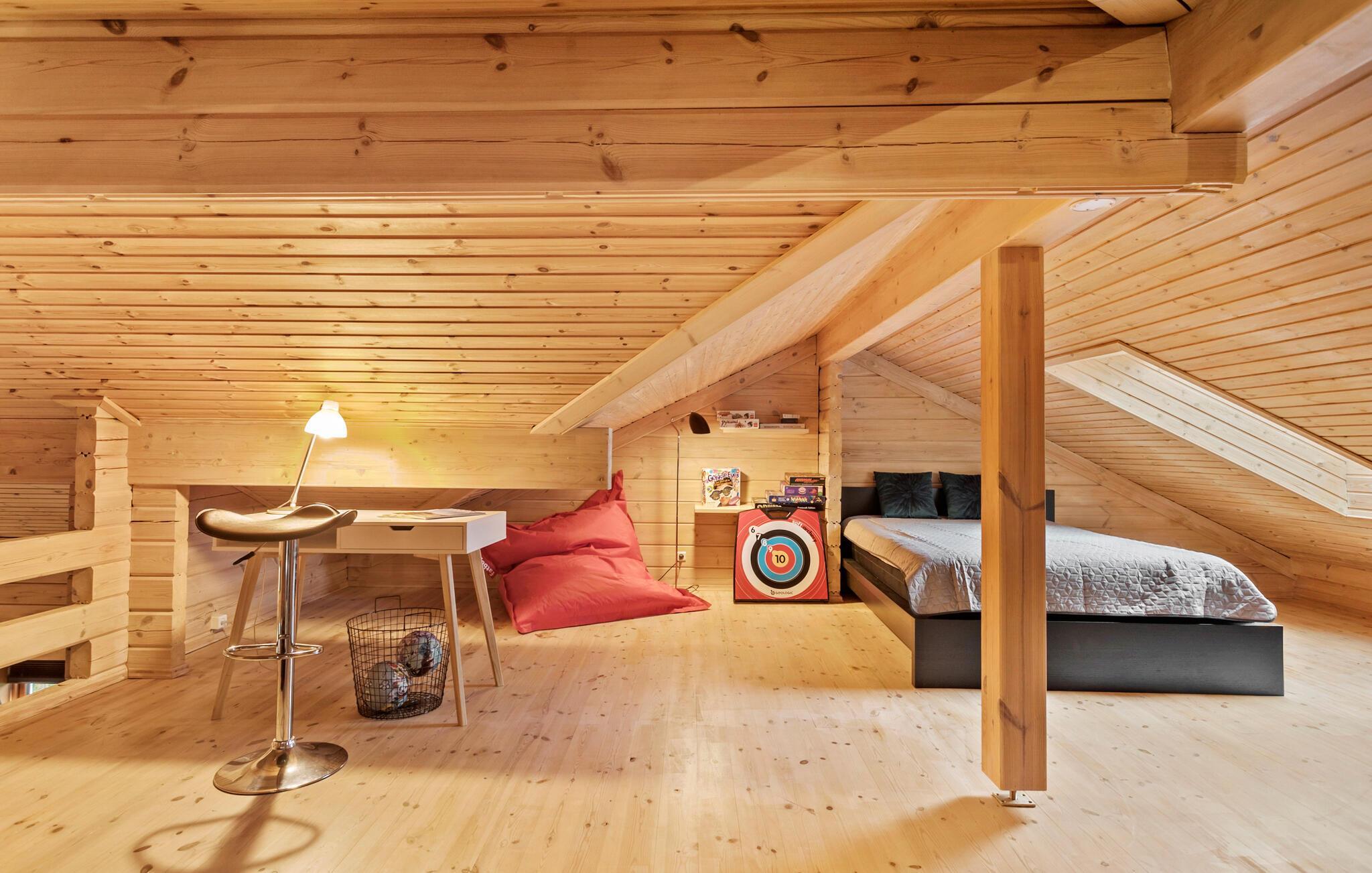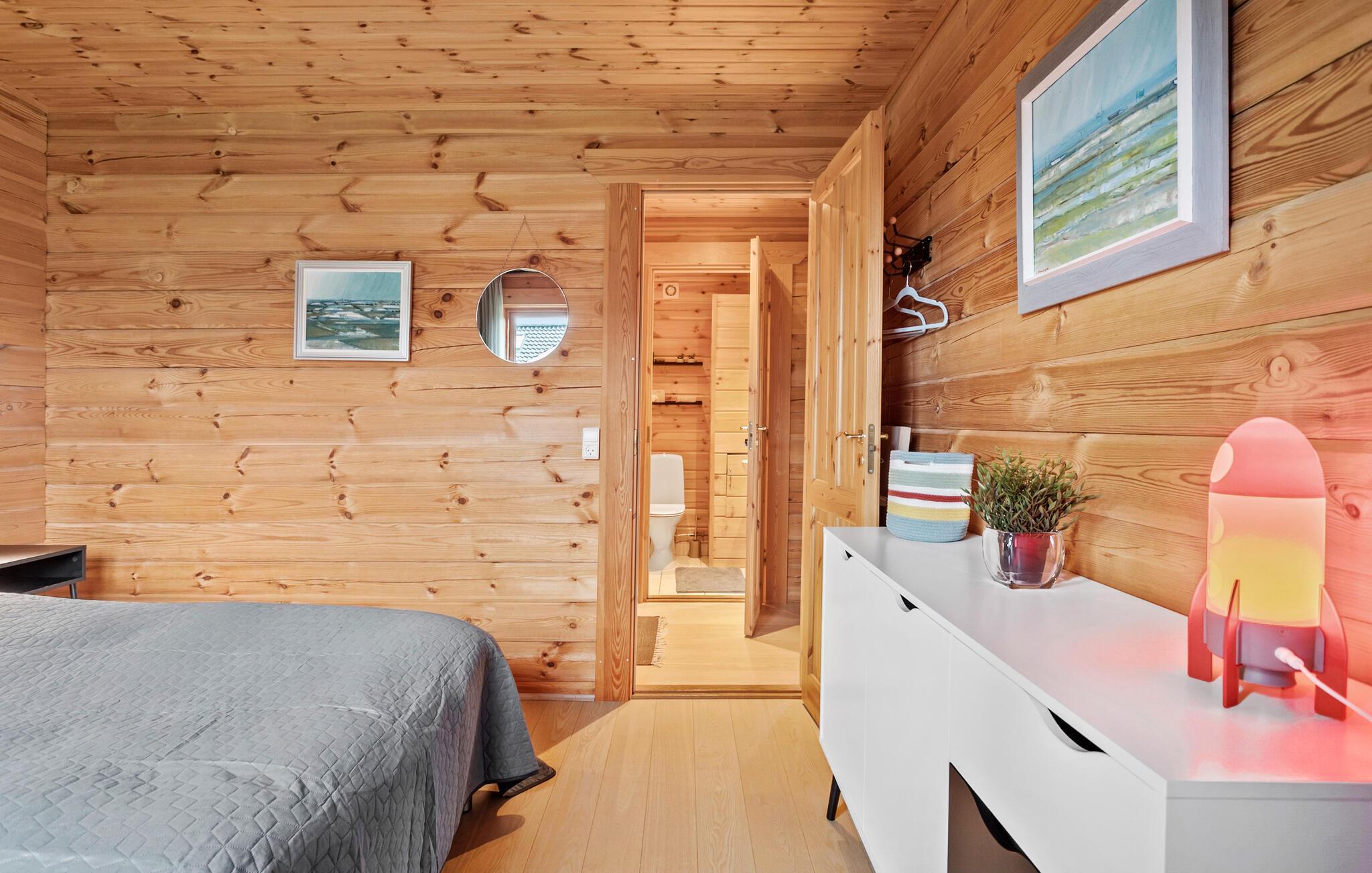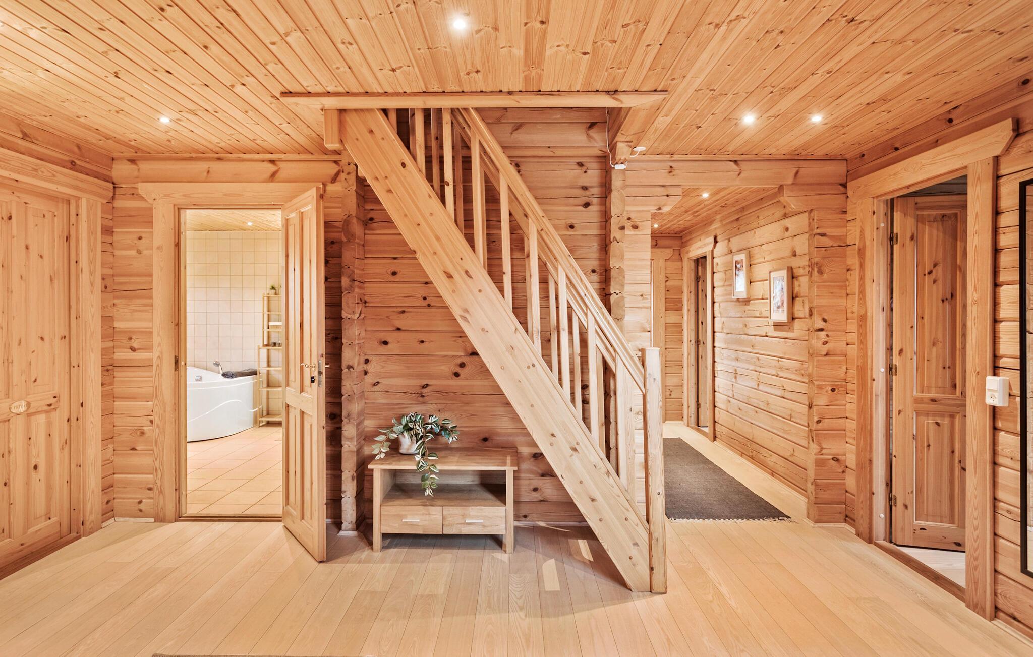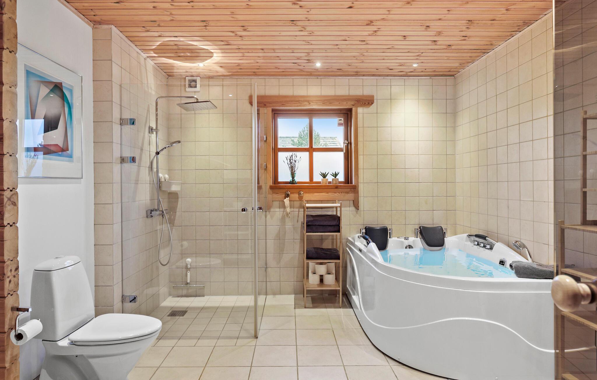 Geräumiges und stilvolles Holzhaus mit Sauna und Whirlpool-Badewanne.