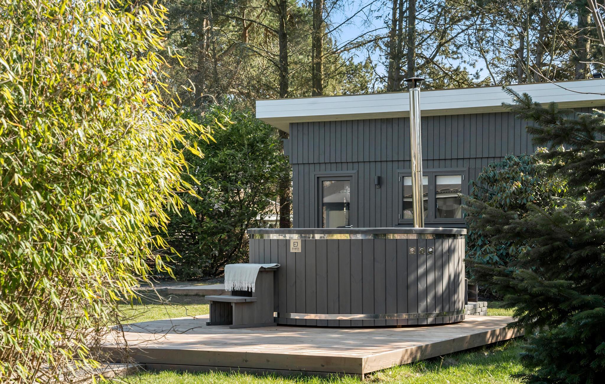 Auch für Entspannung ist gesorgt. Tauchen Sie ein in die wohltuende Wärme des Finnischen Holzbades auf der Terrasse. Ihre Kinder können sich währenddessen auf dem Trampolin austoben oder auf der Rutsche und der Schaukel spielen. Lassen Sie den Tag beim Grillen oder bei geselligem Beisammensein an der Feuerstelle unter freiem Himmel ausklingen.