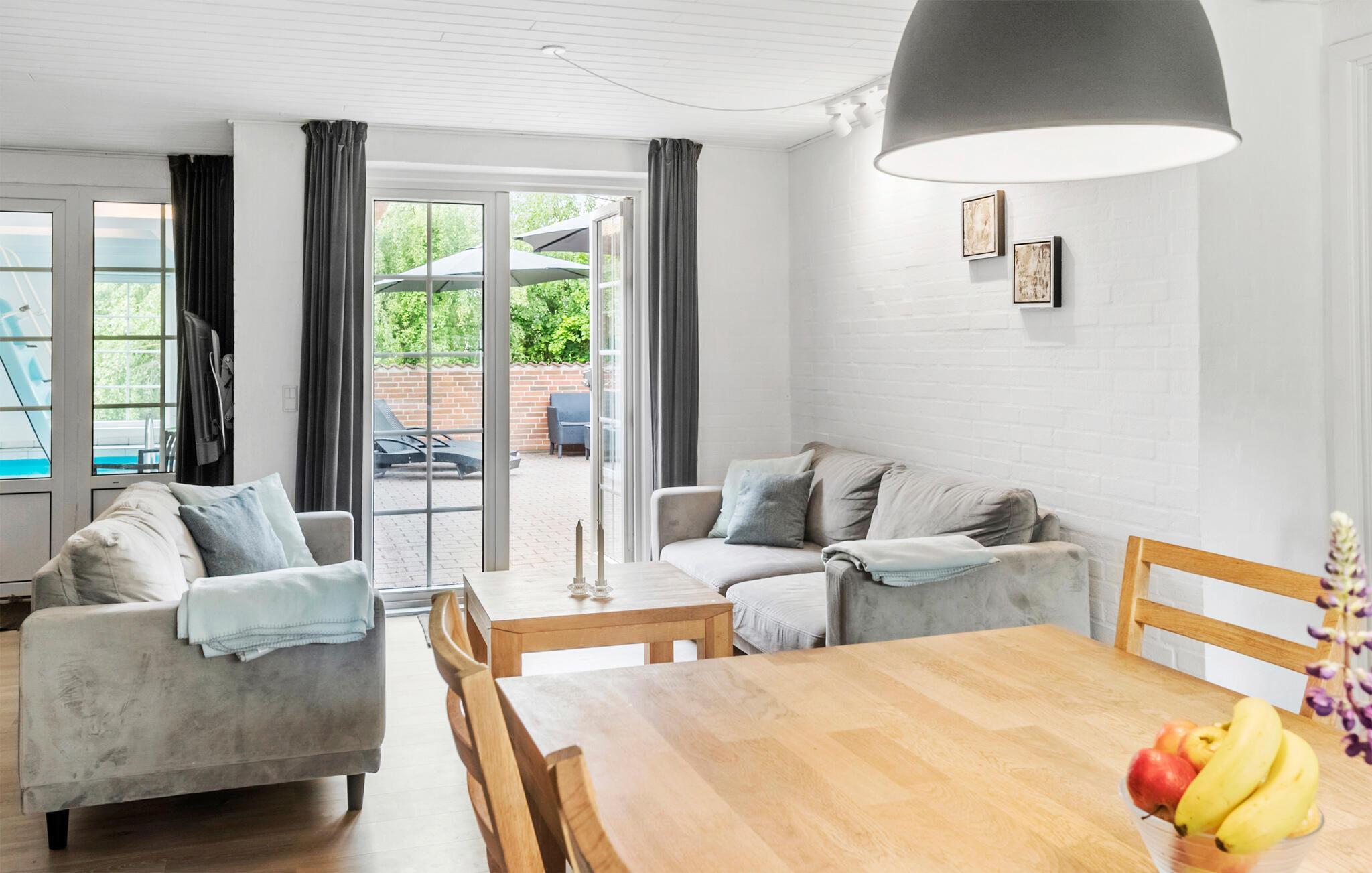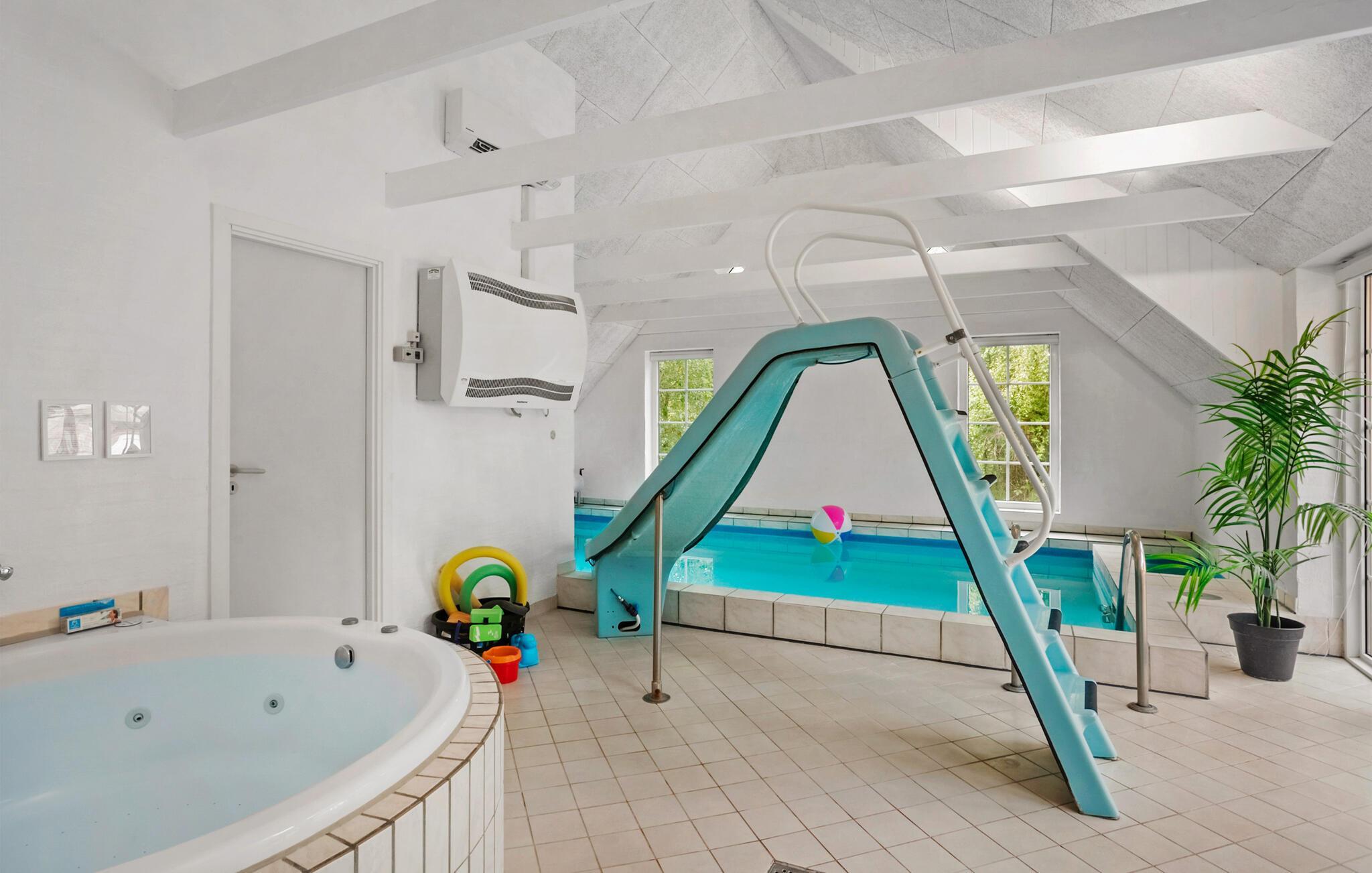 Die 12 Betten des Hauses sind in zwei Schlafbereiche mit je einem Badezimmer aufgeteilt. Mitten im Haus ist das Wohnzimmer, das der Treffpunkt des Hauses ist. Neben einem 18 m² Pool verfügen Sie auch über einen guten Whirlpool für 4 Personen und in diesem Raum ist auch das dritte Badezimmer des Hauses untergebracht. Alle Bäder und der Poolraum sind mit Bodenheizung. Poolraum und Wohnzimmer werden mit einer Wärmepumpe beheizt, Sie können also mit reduzierten Energiekosten rechnen. Im Spielraum sind unter anderem eine Wii und ein 50" Fernseher vorhanden.