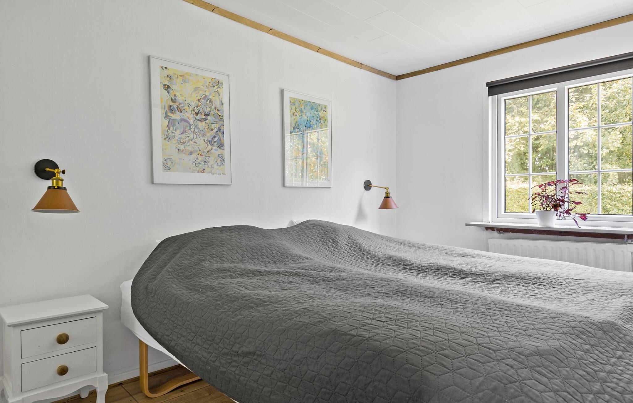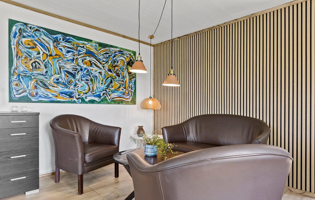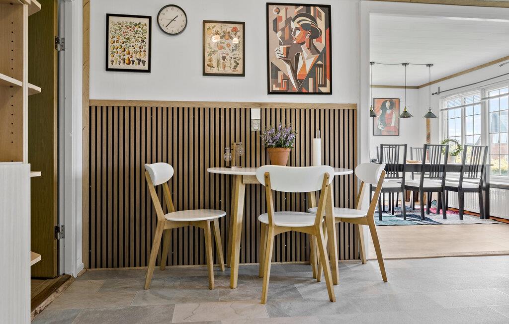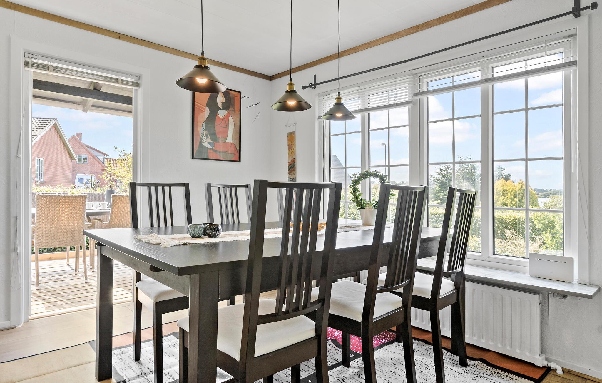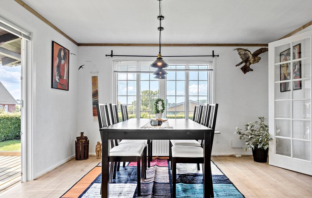 Willkommen in Ihrem Ferienhaus am idyllischen See Mjels Sø. Genießen Sie die helle, freundliche Atmosphäre im großzügigen Wohn- und Essbereich, der durch große Fenster viel Licht hereinlässt und einen schönen Ausblick auf die Umgebung bietet. Setzen Sie sich in die bequemen Sessel und lassen Sie den Alltag hinter sich, während Sie die Kunstwerke an den Wänden bewundern. Nutzen Sie den gemütlichen Esstisch, um gemeinsam zu speisen.