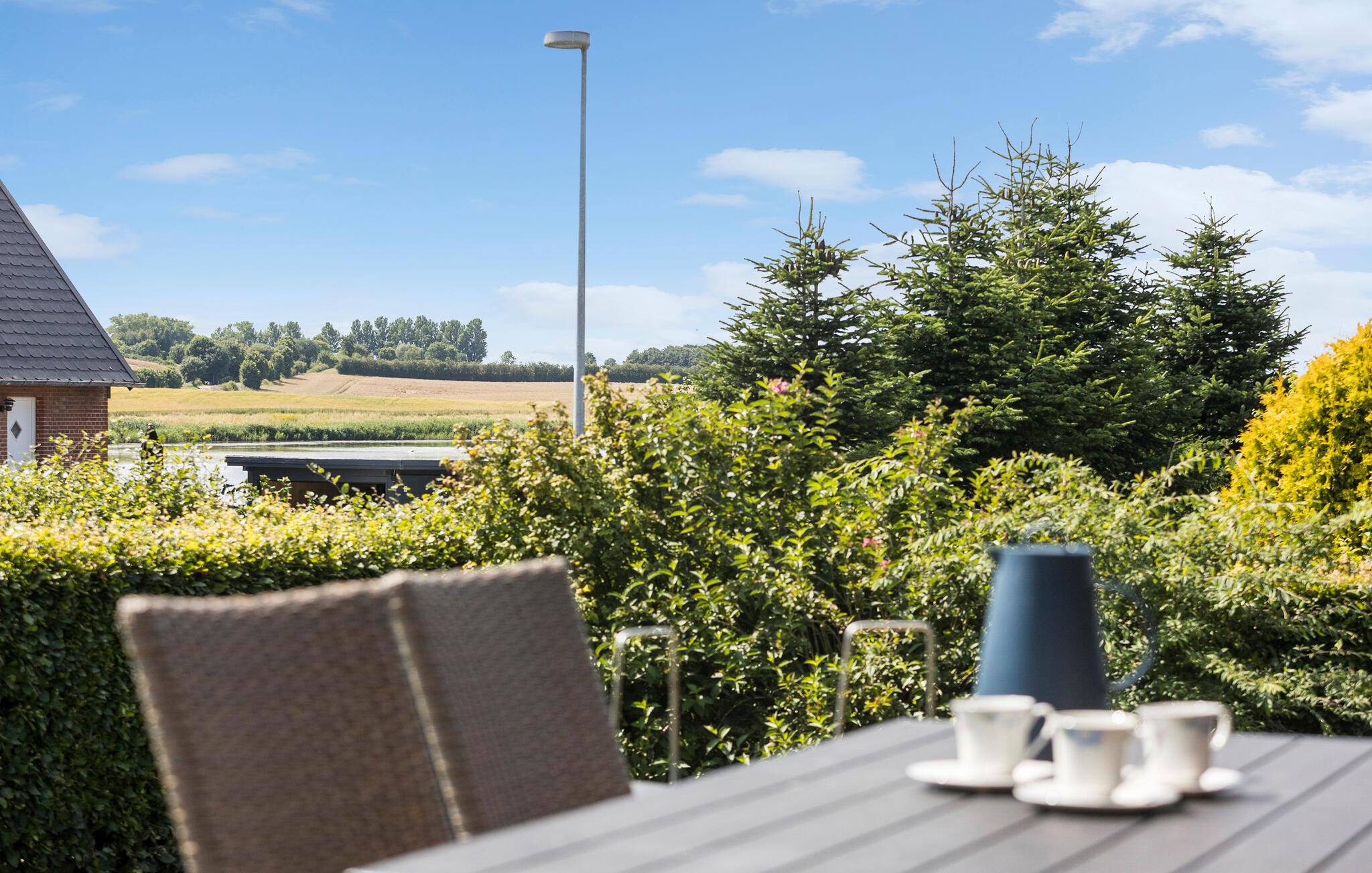 Stilvolles Ferienhaus am Mjels Sø mit großer Terrasse und Seeblick für entspannte Tage in Dänemark.