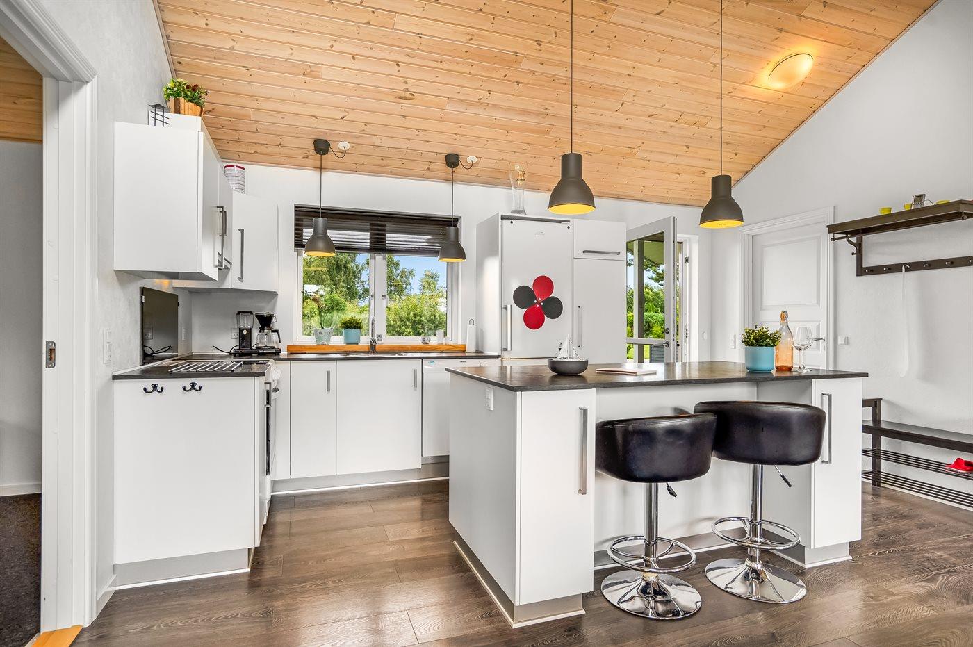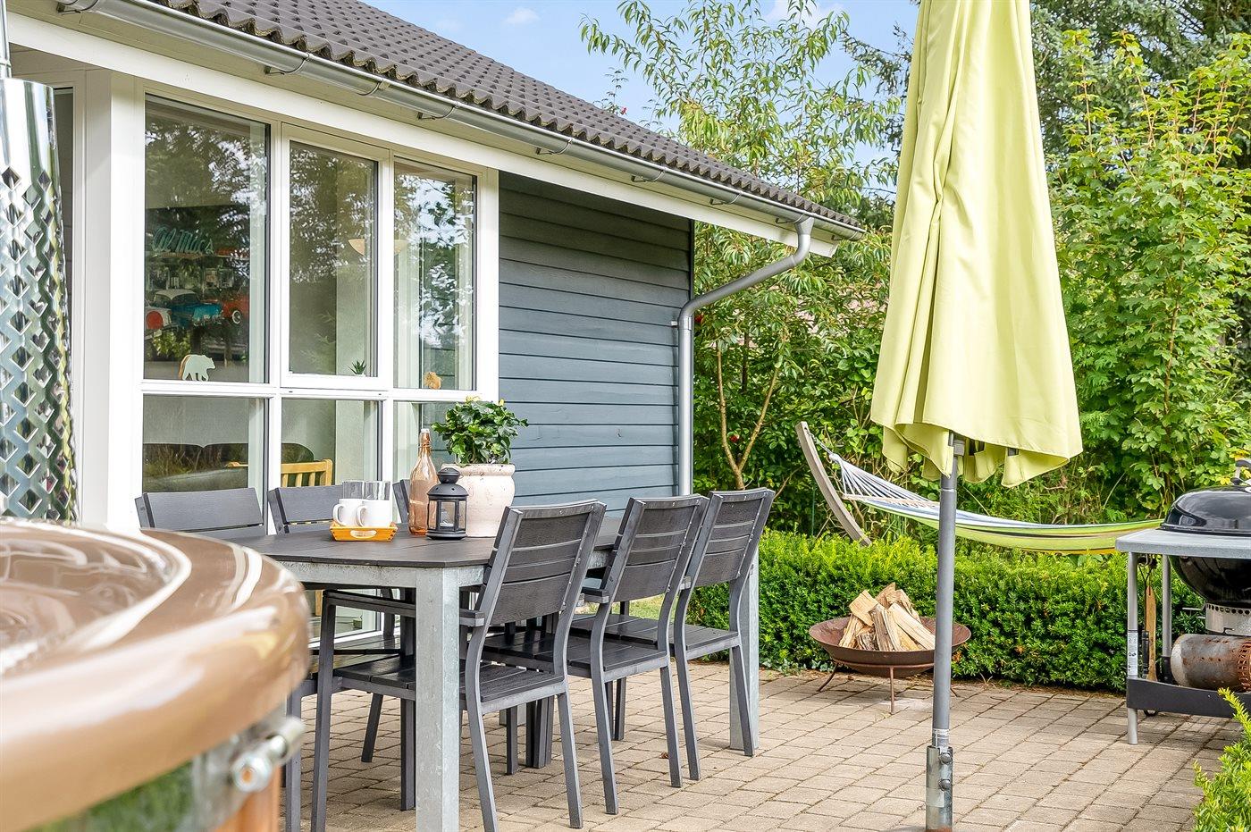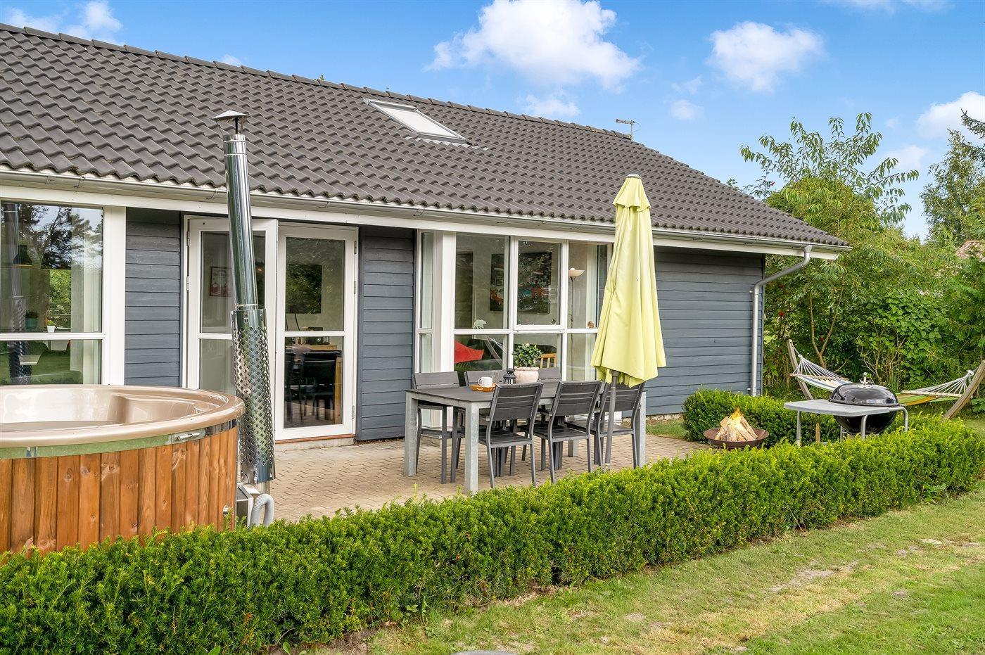 Das Haus bietet Platz für die ganze Familie und die vierbeinigen Freunde und zeichnet sich durch eine moderne Küche und ein Badezimmer mit einem herrlichen Whirlpool aus. Es gibt eine schöne Terrasse mit direktem Zugang vom Wohnzimmer. Das Grundstück ist eingezäunt, und selbst die kühlen Abende können im Freien genossen werden, wenn man in das große Badefass mitten auf der Terrasse steigt.