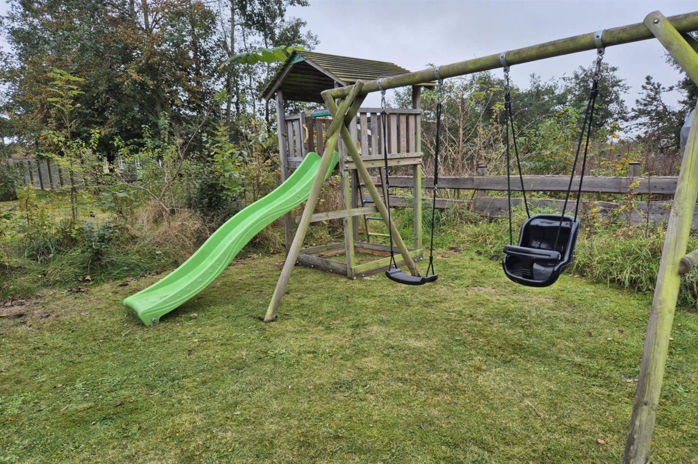 Die Ferienunterkunft liegt auf einem 2626 m² großen Gartengrundstück. Das Grundstück ist eingezäunt. Die Entfernung zum Meer beträgt 7000 m. Die Entfernung zum Fjord beträgt 400 m. Die nächste Einkaufsmöglichkeit liegt 2000 m entfernt. Es steht ein offenes Terrassenareal zur Verfügung. Geräteraum. Schaukel. Spielturm. Rutsche.Lagerfeuerstelle. Windschutzhütte. Es steht ein Grill zur Verfügung. Parkplatz auf dem Grundstück.