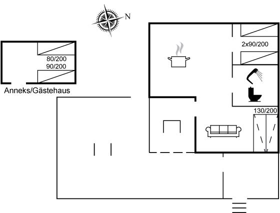 Die Schlafplätze verteilen sich auf 2 Schlafzimmer mit je 2 Einzelbetten. Das eine Schlafzimmer befindet sich im Gästehaus. Darüber hinaus gibt es 2 Schlafplätze auf einer Doppelschlafcouch im Wohnzimmer.