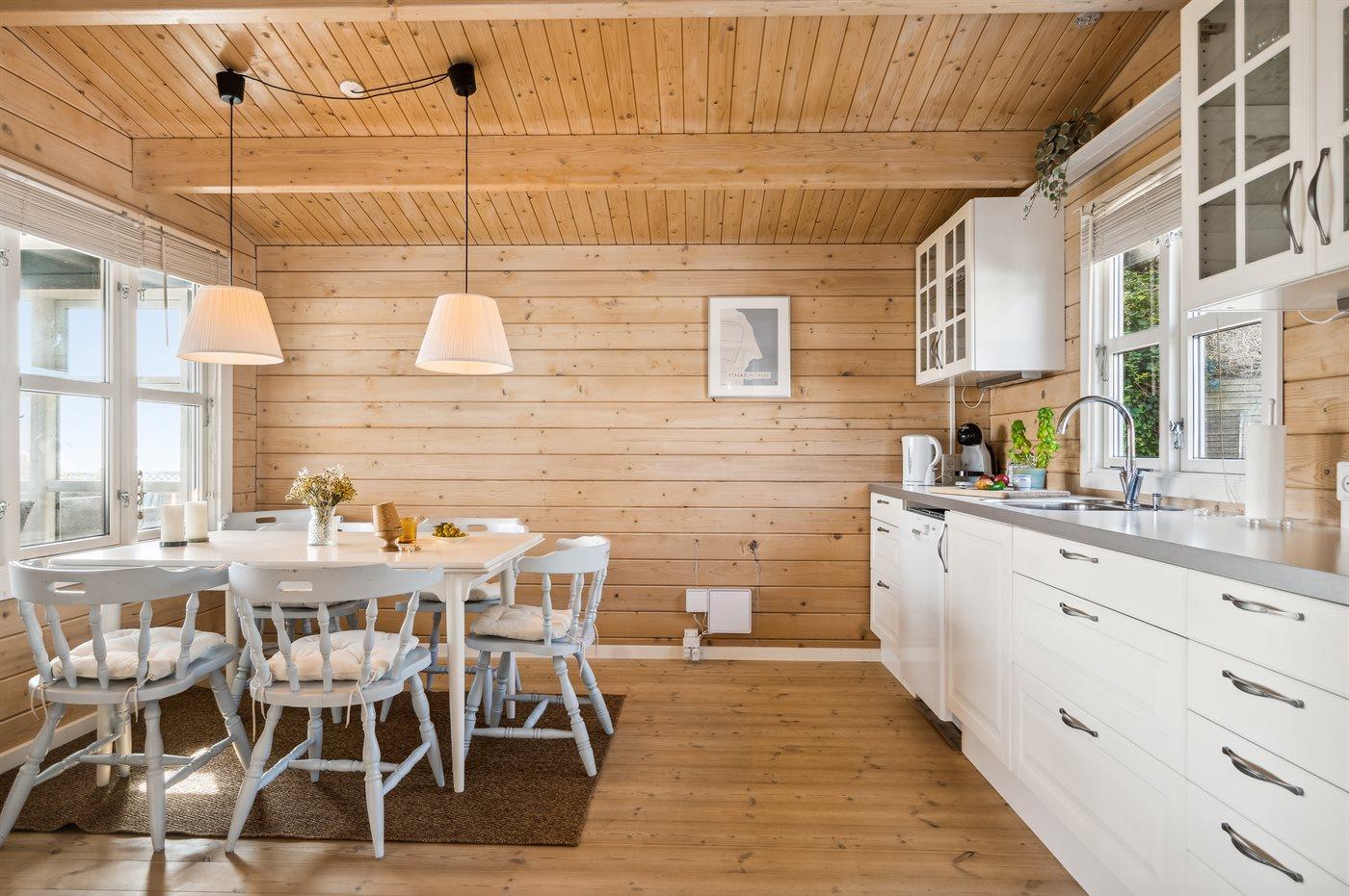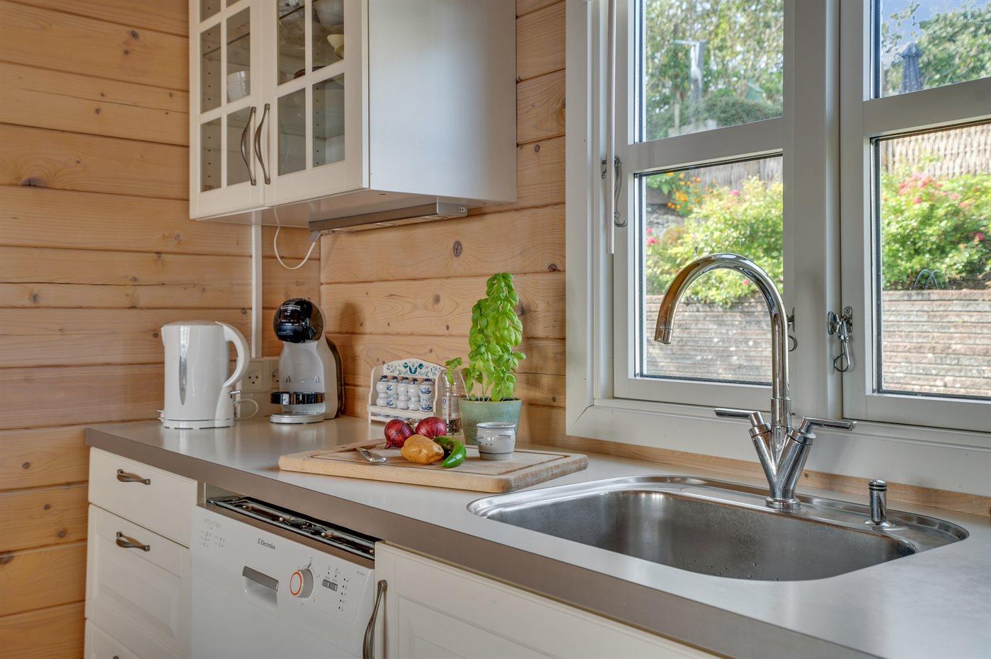 Sehr charmante, neuere Blockhütte mit einer ungestörten Lage am Rande eines grünen Gebiets und direkt am Wasser. Von der schönen Terrasse aus kannst du die Morgensonne genießen, und da ein Teil davon überdacht ist, lädt sie auch abends zum gemütlichen Verweilen ein. Genieße den Blick über Kertinge Nor und Kerteminde Fjord. Vergiss nicht, ein Fernglas mitzubringen, da es in der Umgebung eine reiche Vogelwelt gibt! Nur 20 Meter vom Haus entfernt befindet sich das Wasser und der gemeinsame Badesteg.