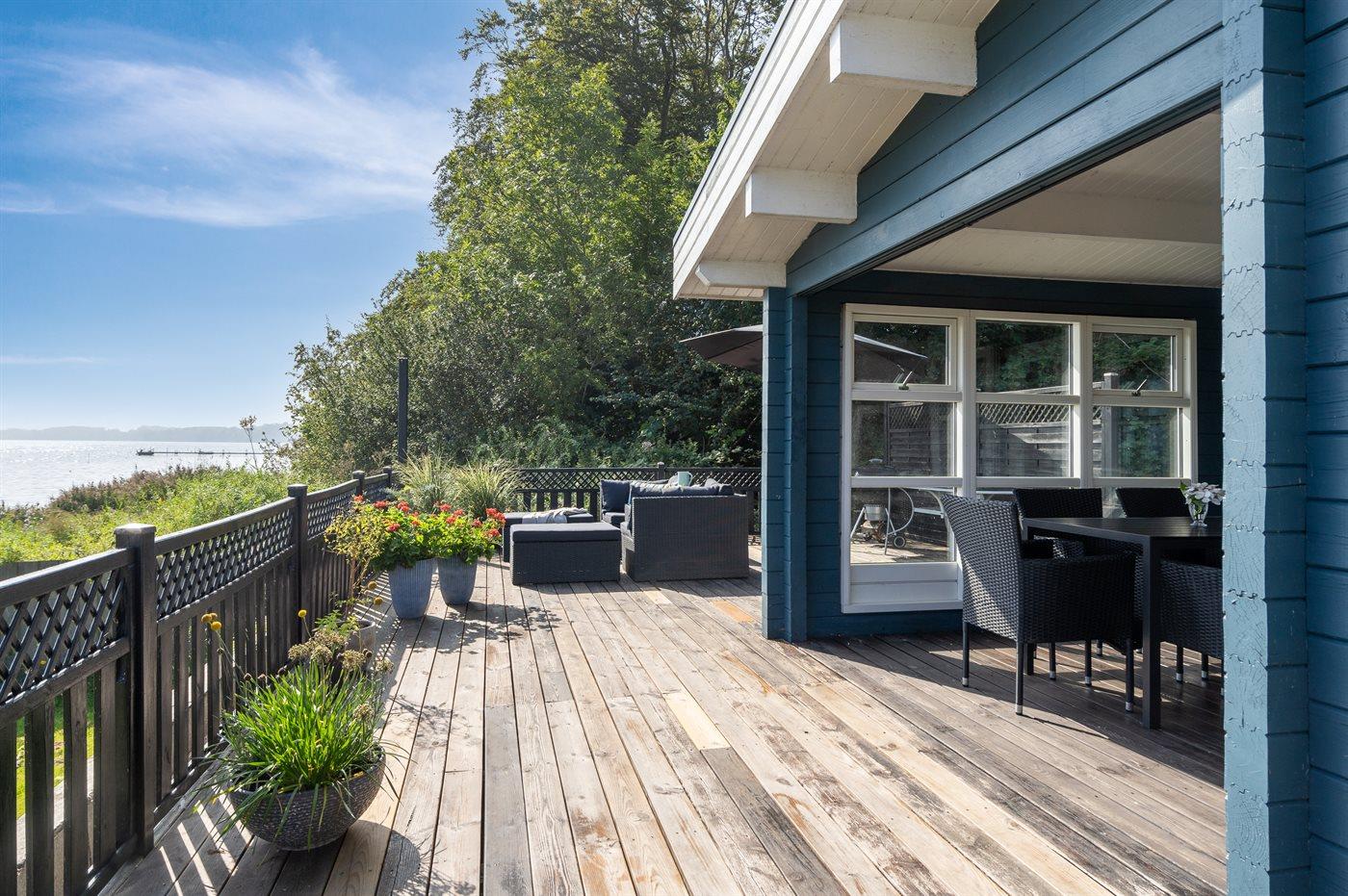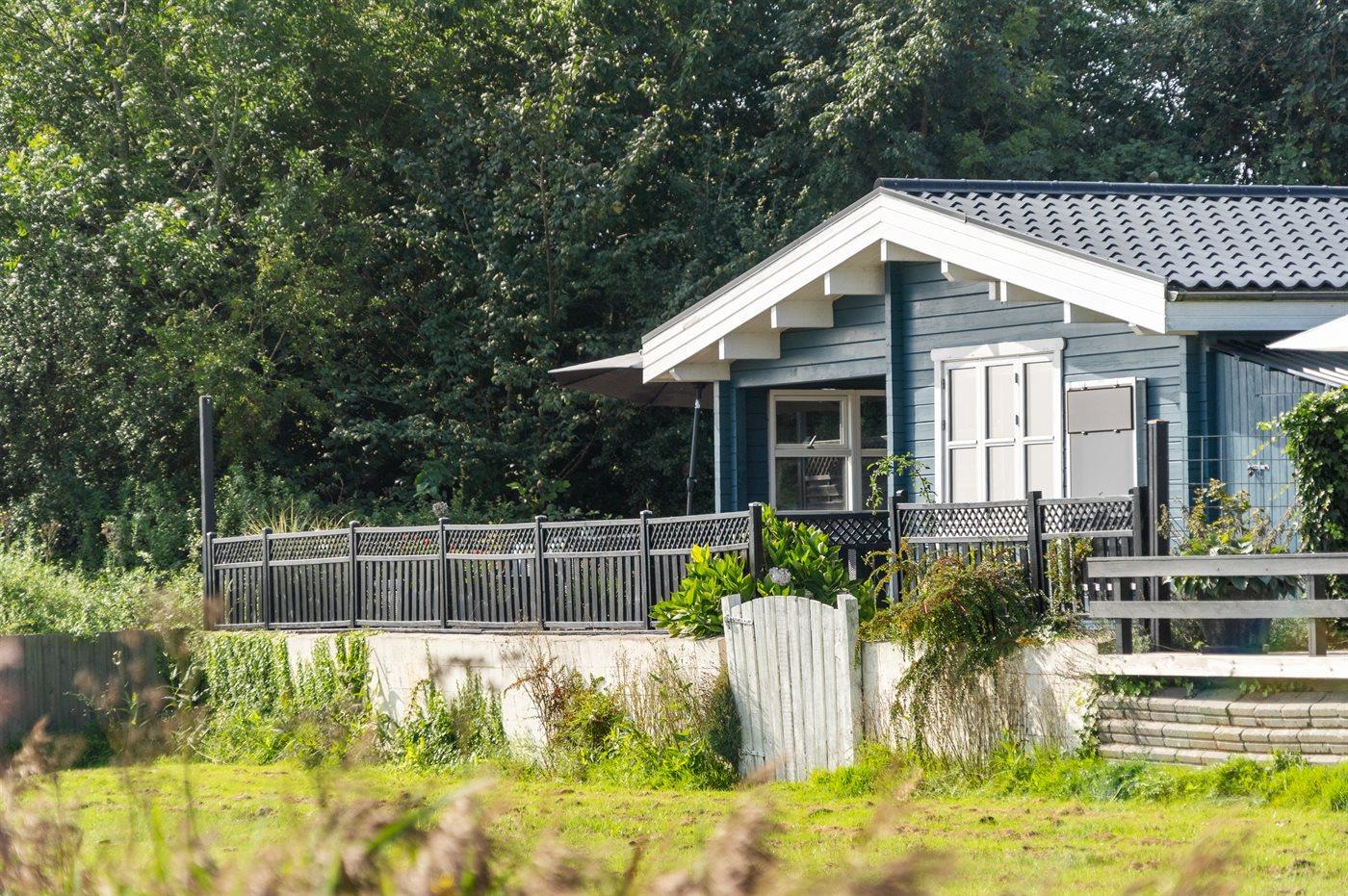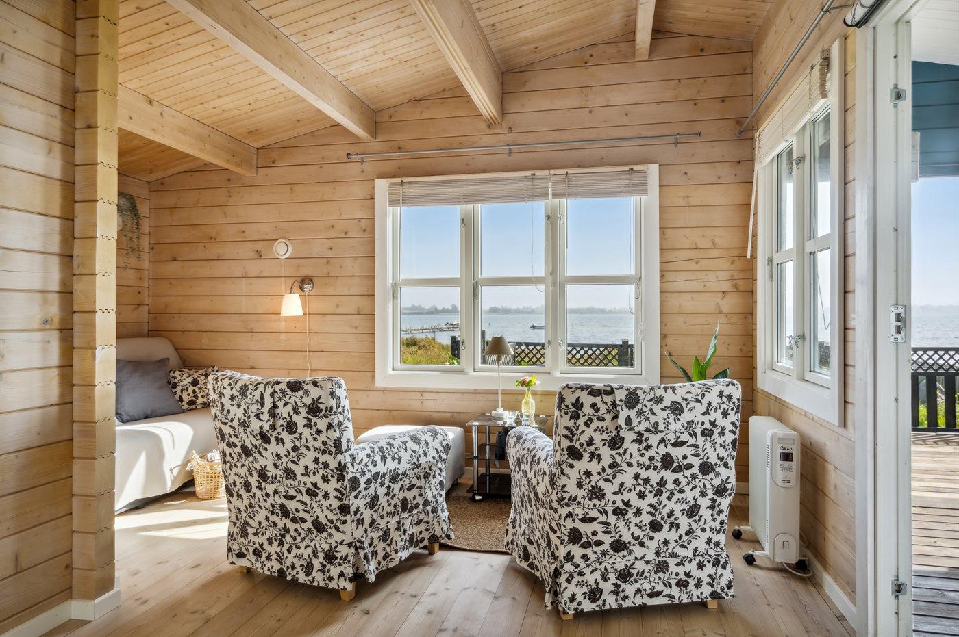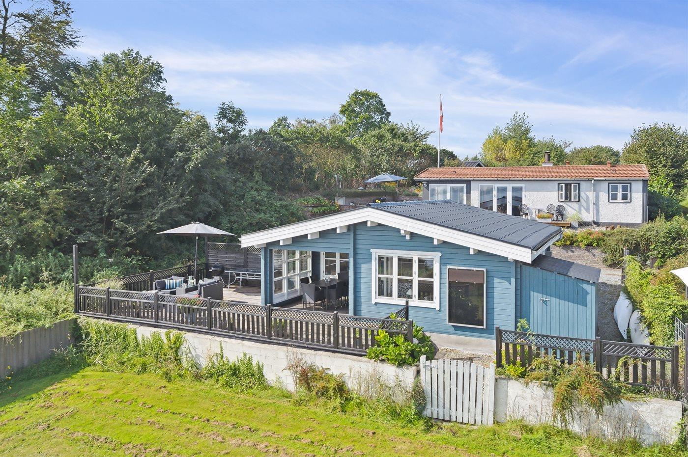 Charmante Blockhütte am Wasser mit Terrasse, Kaminofen und schneller Internetverbindung in Munkebo, Dänemark.