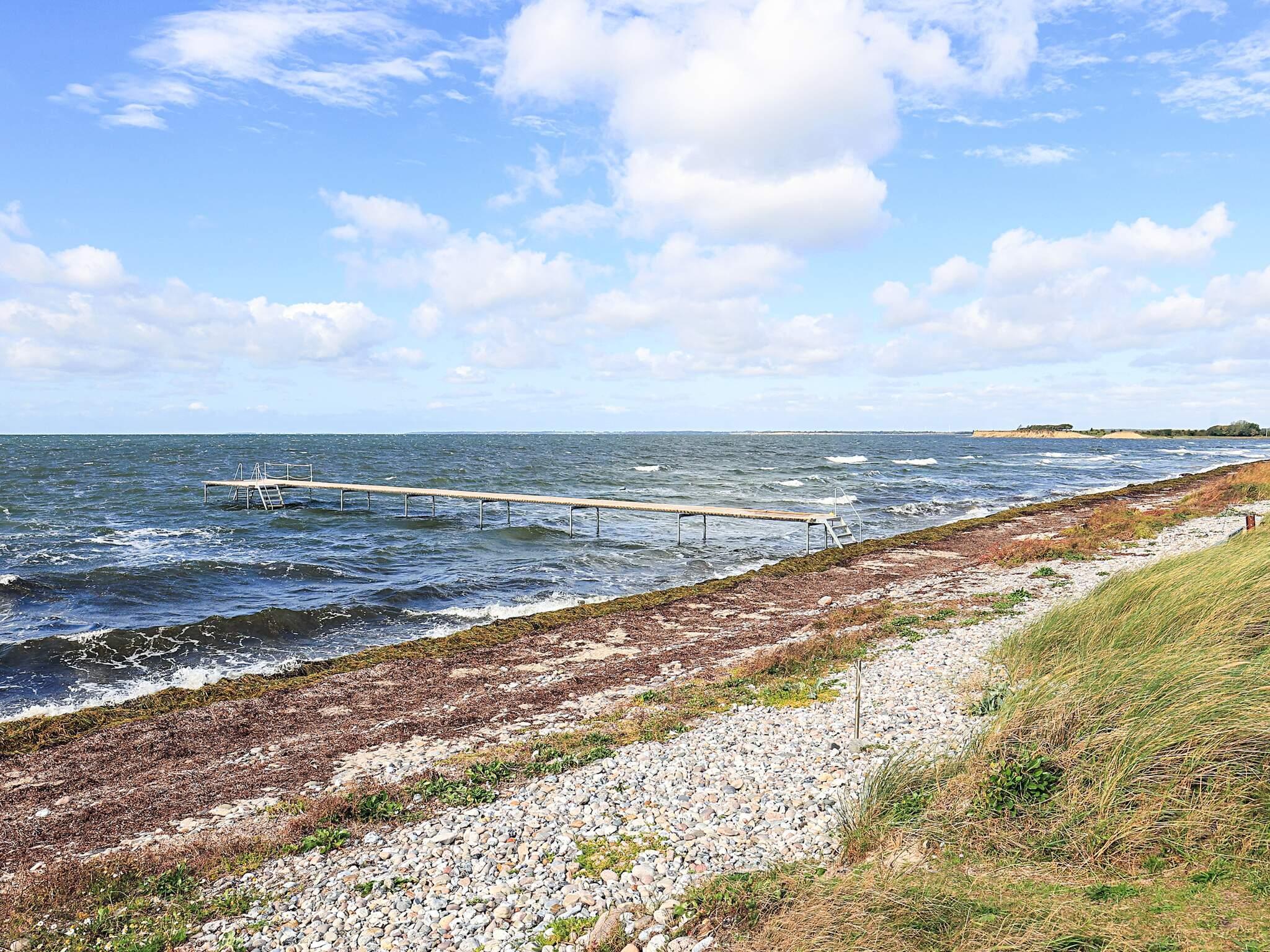 Stranden har en nyopført badebro og byder ellers på en dejlig, ren sandstrand.