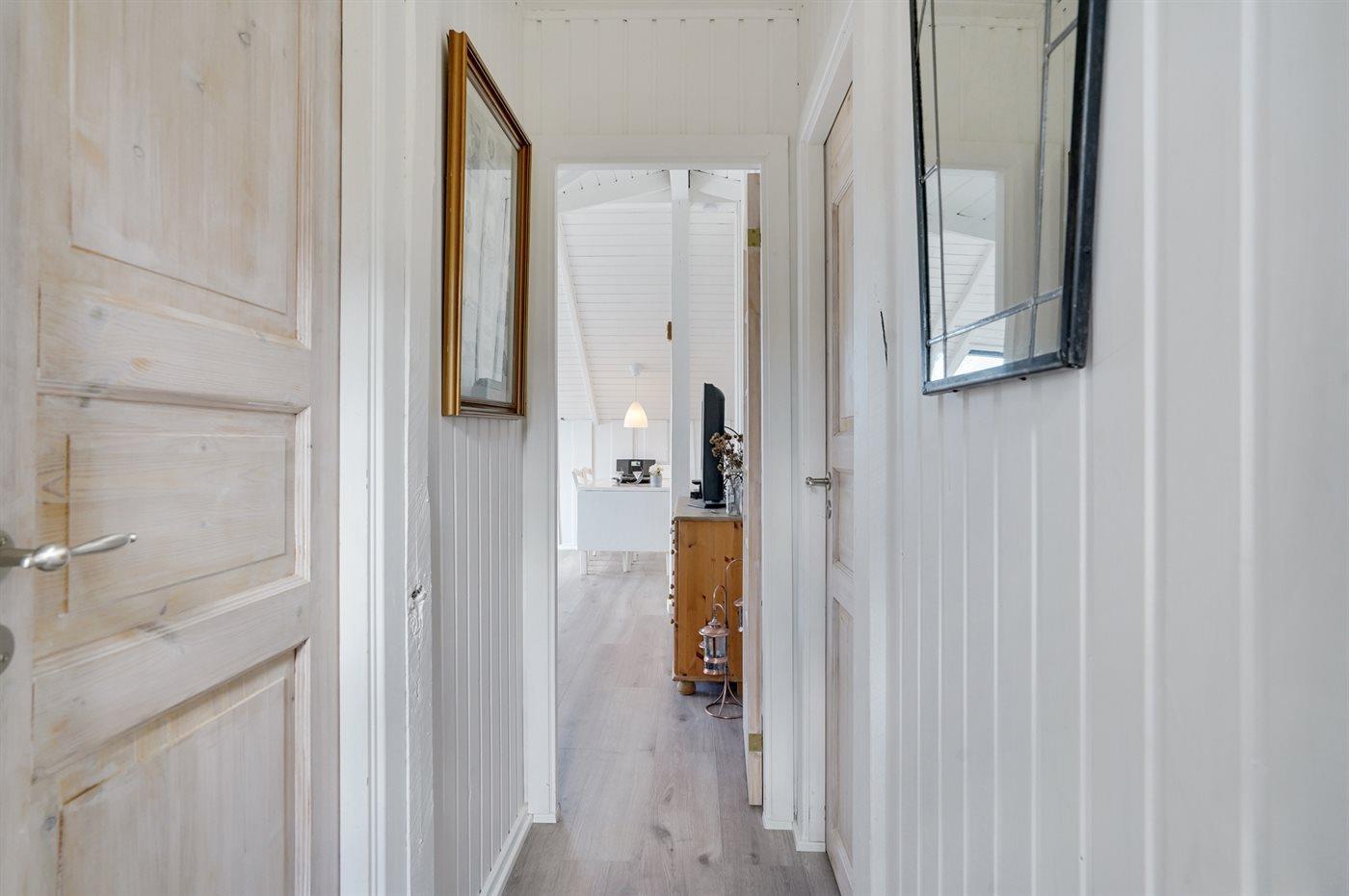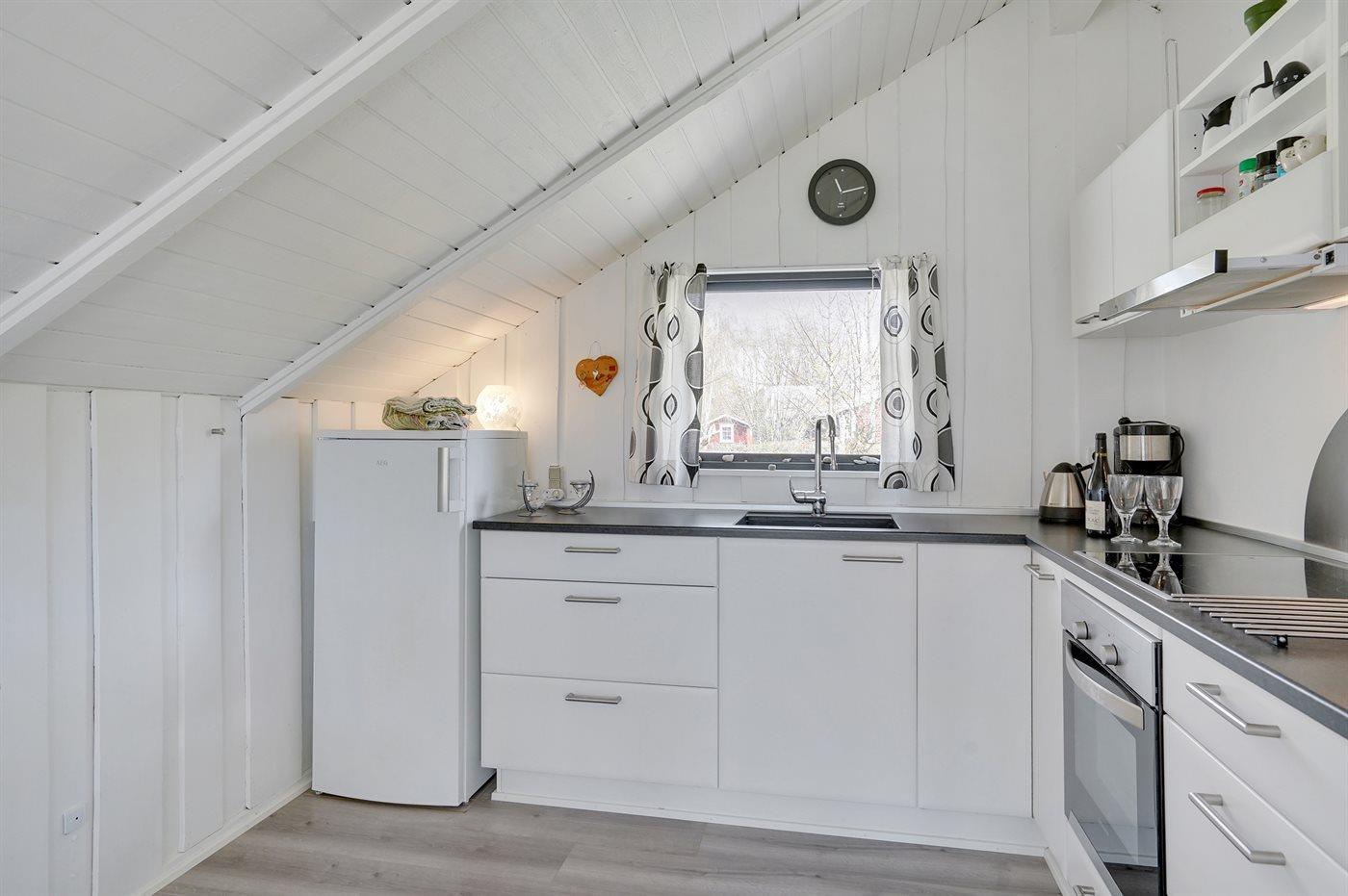 Ein gepflegtes Ferienhaus auf einem von Büschen und Bäumen umgebenen Grundstück gelegen – nicht weit von einem schönen Badestrand entfernt.