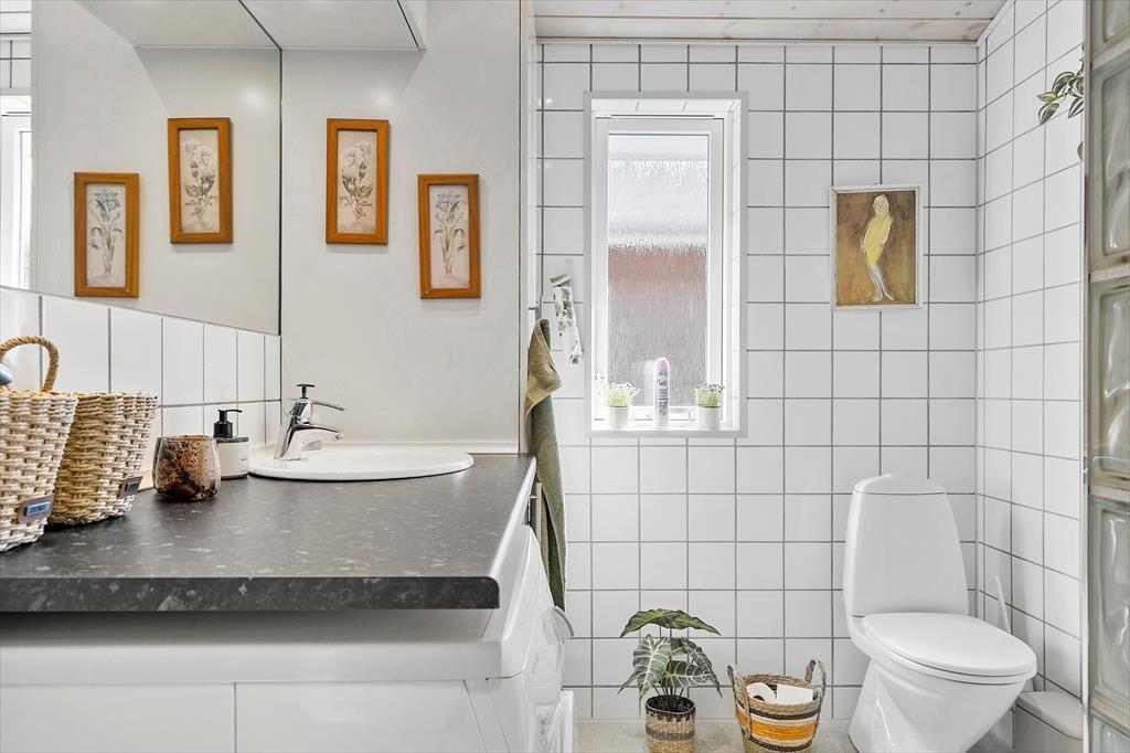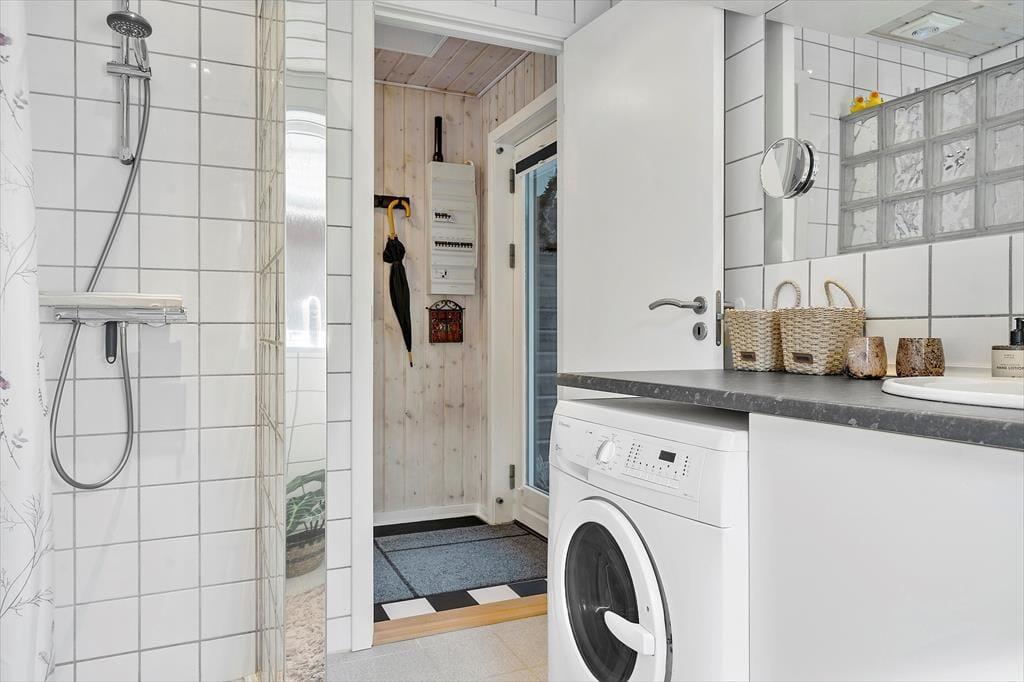 Vom überdachten Hauseingang gelangen Sie in den Eingangsbereich, von dem Sie unter anderem in ein ansprechendes Badezimmer mit WC, Waschbecken, Duschnische und einer Waschmaschine kommen.