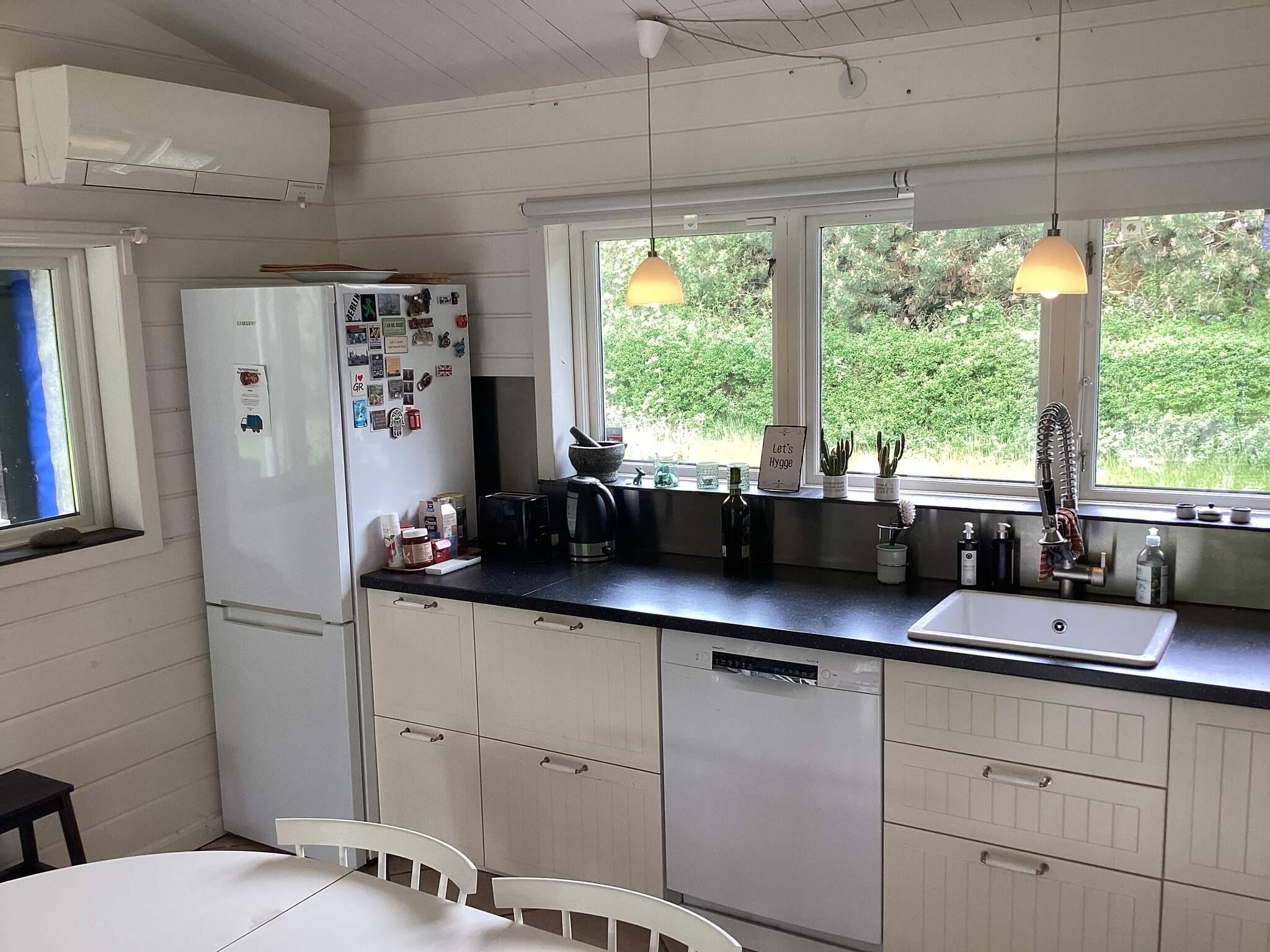 Im Haus befinden sich drei Schlafzimmer; eines mit Doppelbett, eines mit zwei Einzelbetten und ein 3. mit einem Einzelbett. Die offene Küche ist gut ausgestattet und verfügt unter anderem über einen Gasherd, eine Kaffeemaschine, eine Mikrowelle, einen Geschirrspüler und einen Gefrierschrank. Das Wohnzimmer verfügt über eine Wärmepumpe und einen Holzofen, einen Fernseher mit Chromecast und WLAN. Das Badezimmer ist mit Toilette, Waschbecken und Dusche ausgestattet. Vom Wohnzimmer aus haben Sie Zugang zur Terrasse und zum Garten.