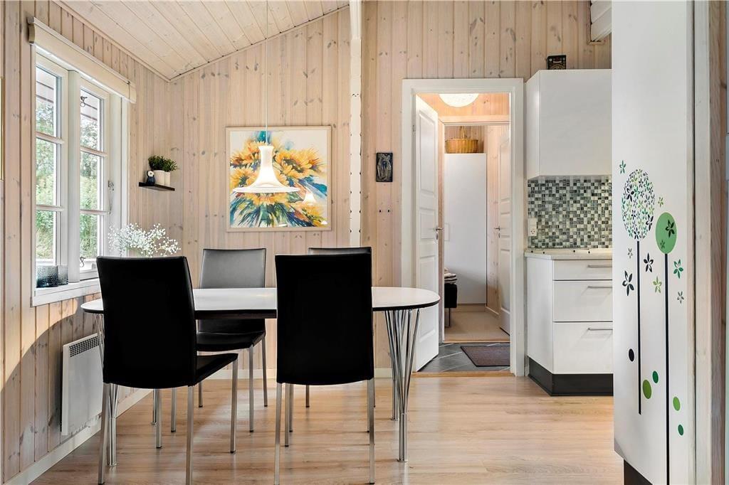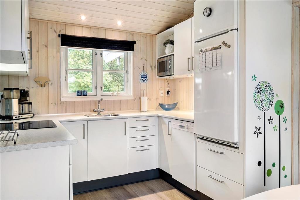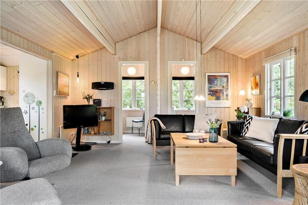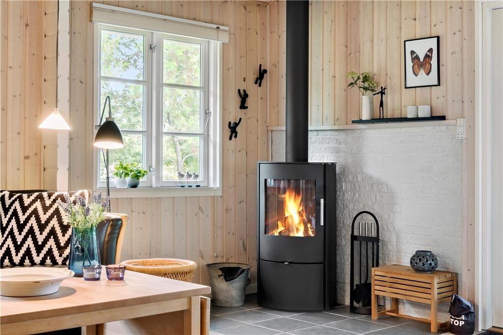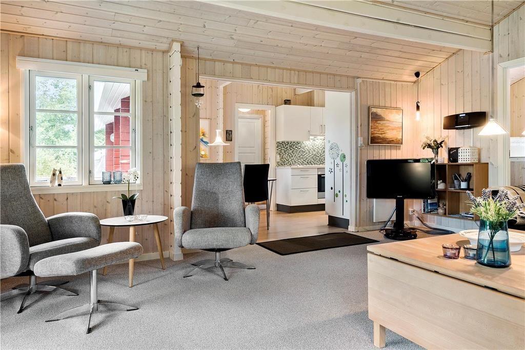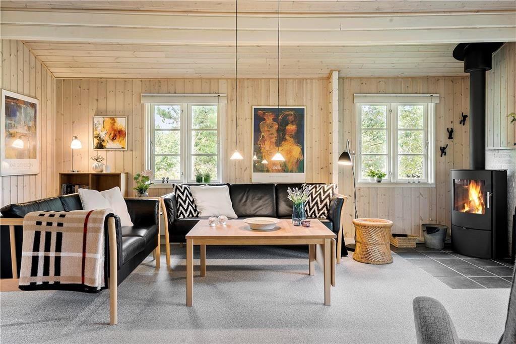Dieses gemütliche, sehr gepflegte Ferienhaus im skandinavischen Stil empfängt Sie mit einer hellen und freundlichen Einrichtung, die in allen Räumen durch ansprechende, komfortable Möbelstücke geprägt wird. Die gemütliche Wohnatmosphäre wird an kühlen Sommerabenden und in der kalten Jahreszeit vom knisternden Feuer im Kaminofen maximiert. Der Kaminofen wird durch eine energiesparende Wärmepumpe unterstützt. Die helle Küche bietet Ihnen alles Wünschenswerte. Das schöne Badezimmer verfügt über eine Dusche, ein WC und ein Waschbecken. Einer der drei Schlafräume beinhaltet ein Doppelbett. In den anderen beiden Schlafräumen treffen Sie auf jeweils ein Etagenbett. Die Schlafräume sind mit Teppichboden versehen, der Wohnraum mit einem Holzfußboden.