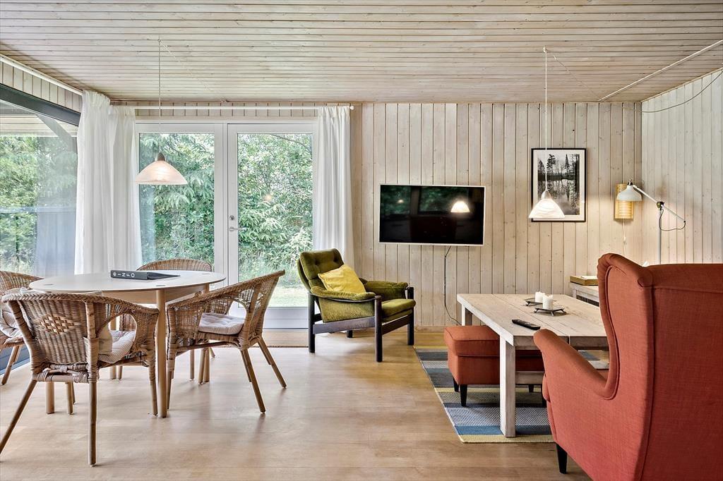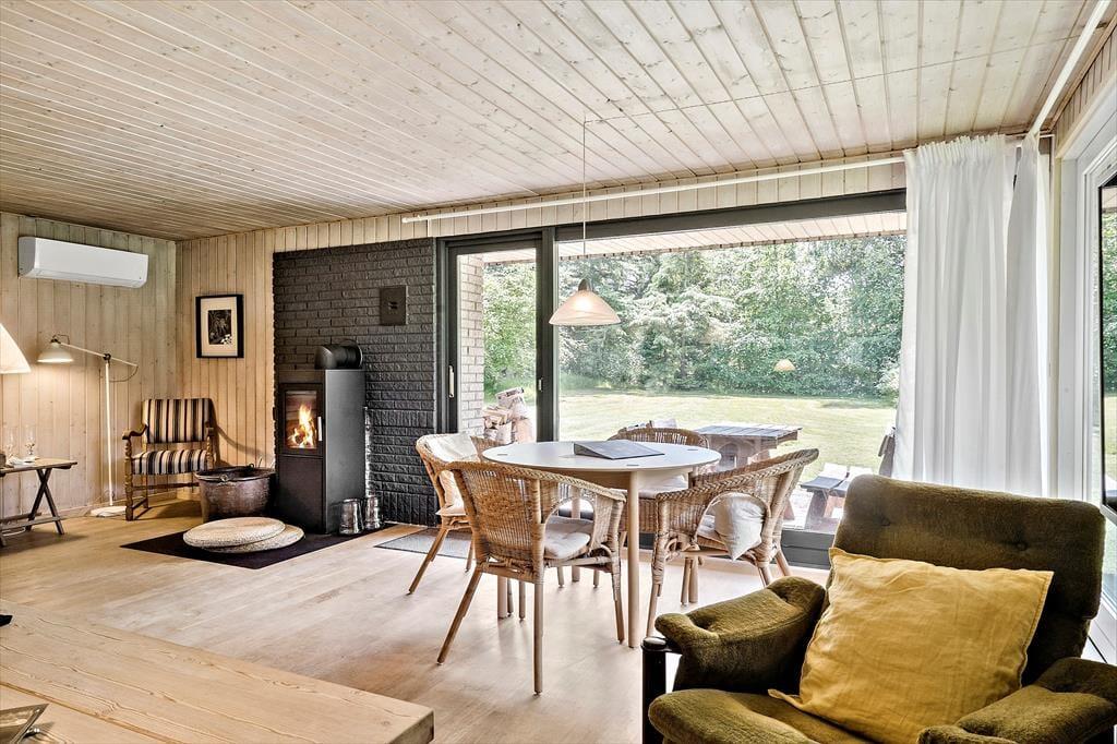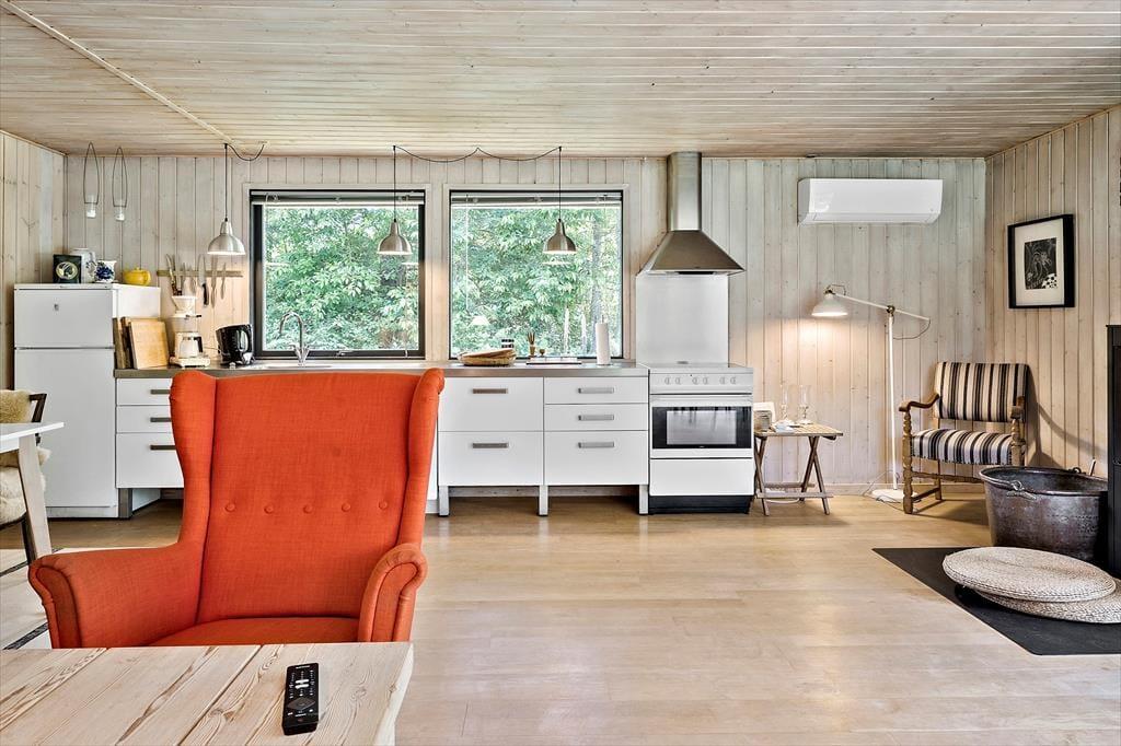 Unmittelbar nach dem ersten Betreten deines Ferienhauses spürst du, wie die Alltagshektik einer entspannten Urlaubsstimmung weicht. Die Holzwände verleihen dem Mietobjekt eine warme Atmosphäre. Große Fensterpartien sorgen den gesamten Tag hindurch für einen schönen Tageslichteinfall. Die Küche fügt sich offen in den Wohnraum ein. Dadurch genießt du selbst während der Zubereitung eurer Mahlzeiten die Nähe und Gesellschaft deiner Lieben, die am Esstisch beisammensitzen und spielen oder es sich in der Polstersitzgruppe gemütlich gemacht haben. An kühlen Abenden verwöhnt euch der im Wohnraum platzierte Kaminofen mit behaglicher Wärme und einem Maximum an klassisch dänischer Ferienhausgemütlichkeit.