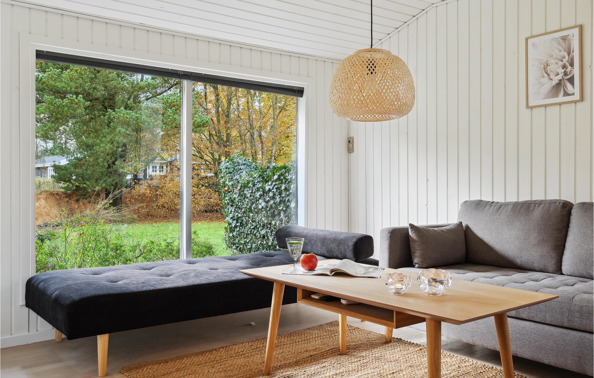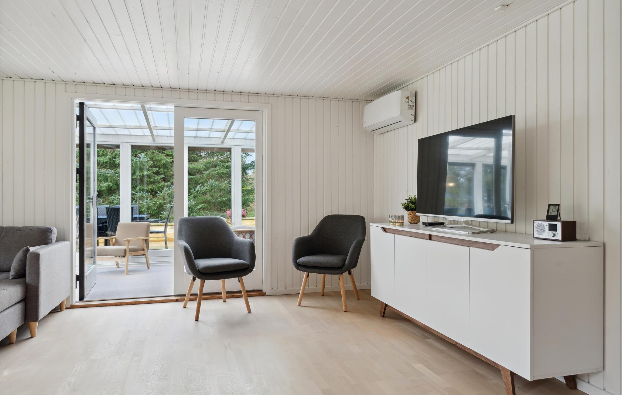 Die geschmackvolle Einrichtung, helle Räume und die schöne Holzverkleidung machen es zum richtigen Ort, um mit der Familie zu entspannen. Ob beim gemeinsamen Kochen und Essen oder beim Plaudern auf dem gemütlichen Sofa mit Blick in den Garten, hier können Sie die gemeinsame Zeit in vollen Zügen genießen. Sorgen Sie mit einem Feuer im Kaminofen für eine besonders behagliche Stimmung und genießen Sie schöne Ausblicke durch die große Fensterfront.