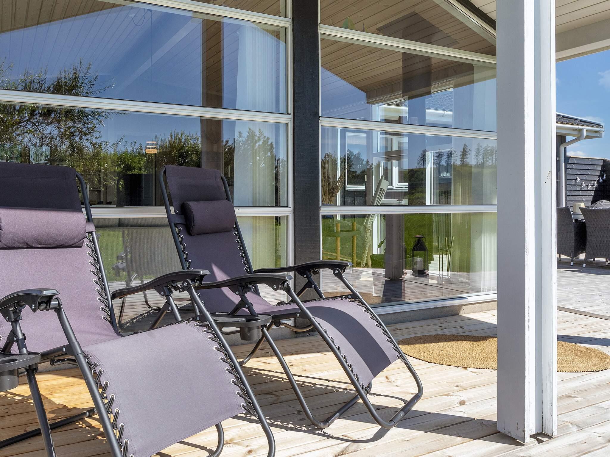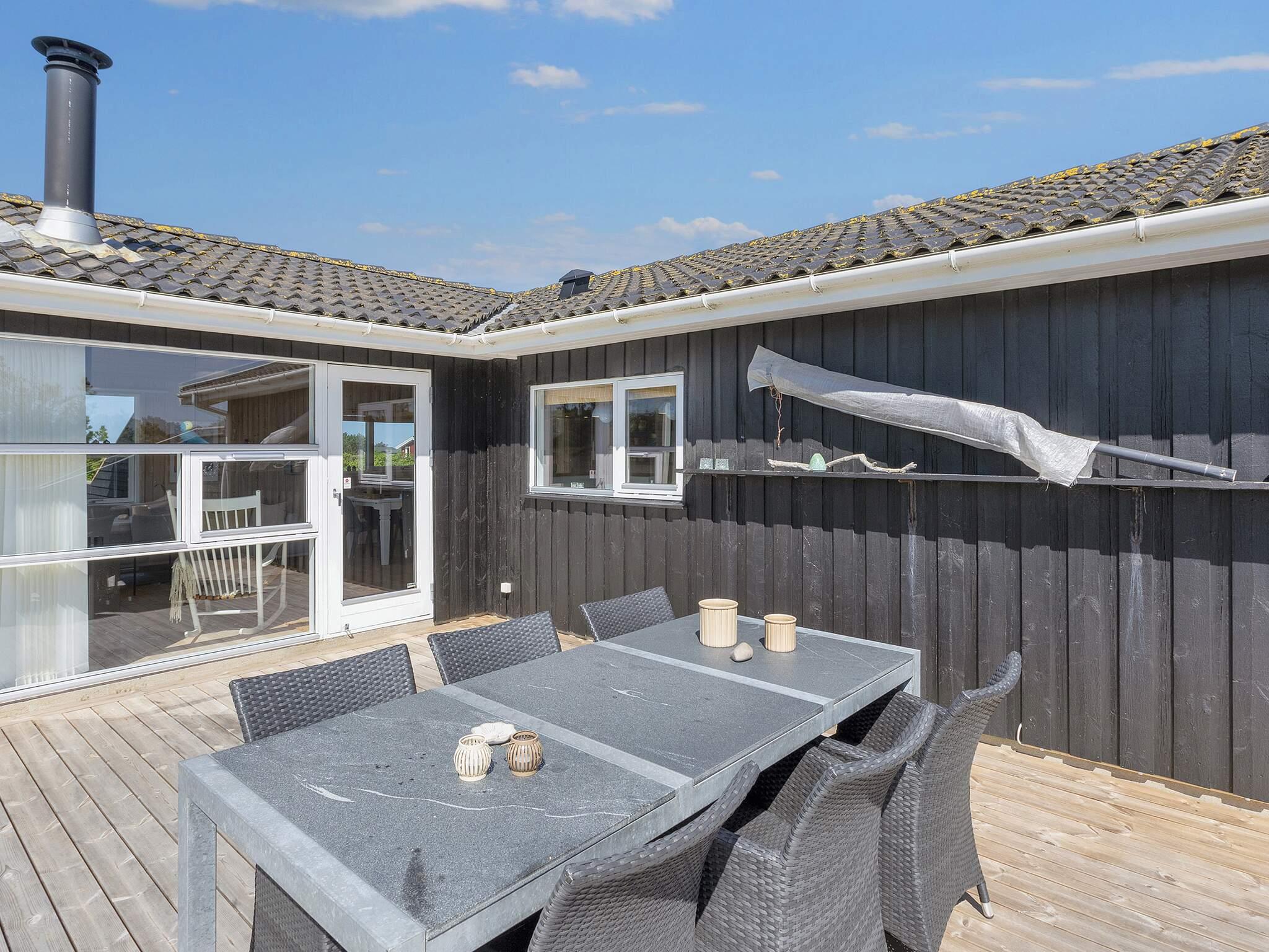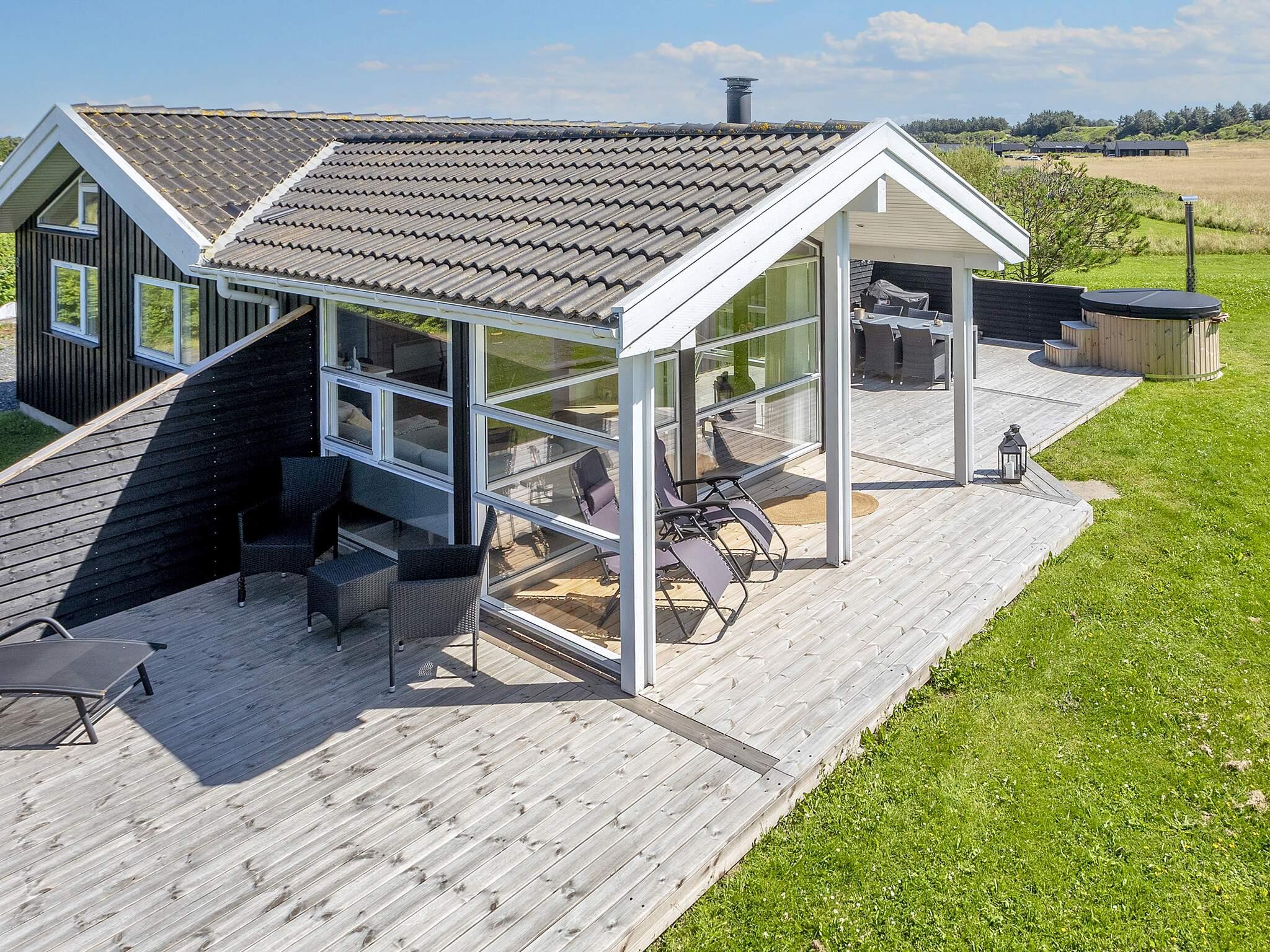 Nach Osten, Süden und Westen gibt es sowohl überdachte als auch offene Terrassenfläche. Ein Teil der Terrasse ist mit Halogenlampen ausgestattet, was besonders gute Voraussetzungen für den Aufenthalt am Abend bietet. Das Grundstück ist ein flaches Naturgrundstück, das an ein herrliches Naturschutzgebiet rund um den Höhenzug Jyske Ås grenzt. Für die Kinder gibt es Schaukeln und einen Sandkasten. Wenn Sie sich draußen aufhalten, ist das Meeresrauschen wahrzunehmen.