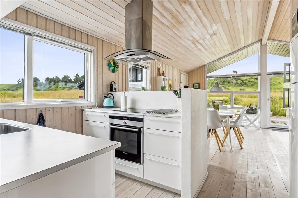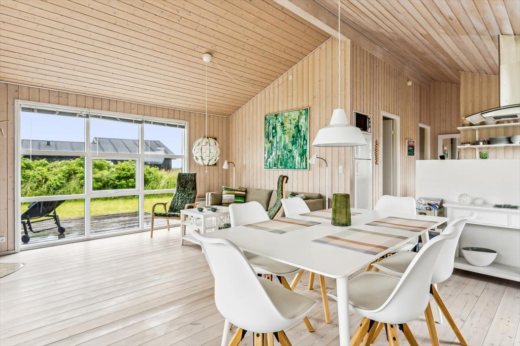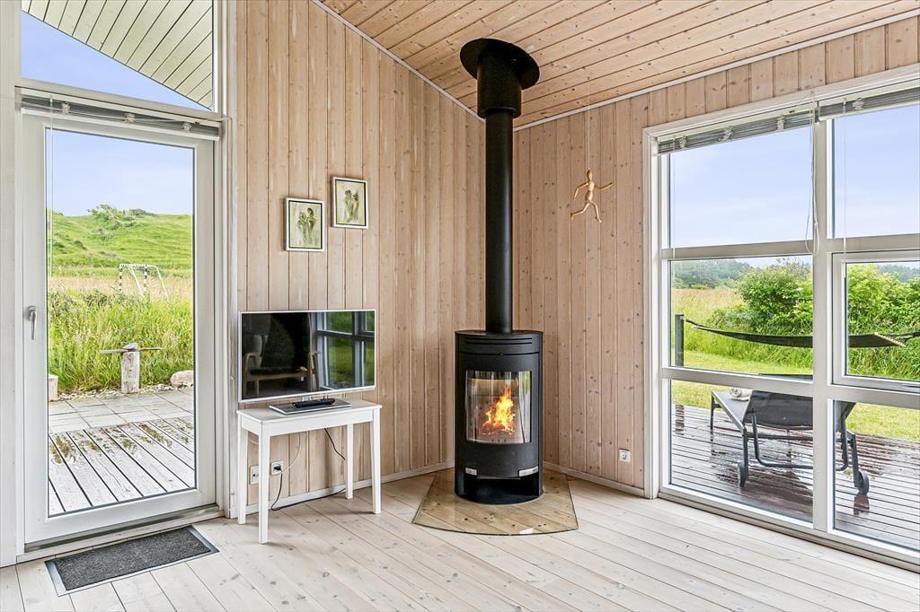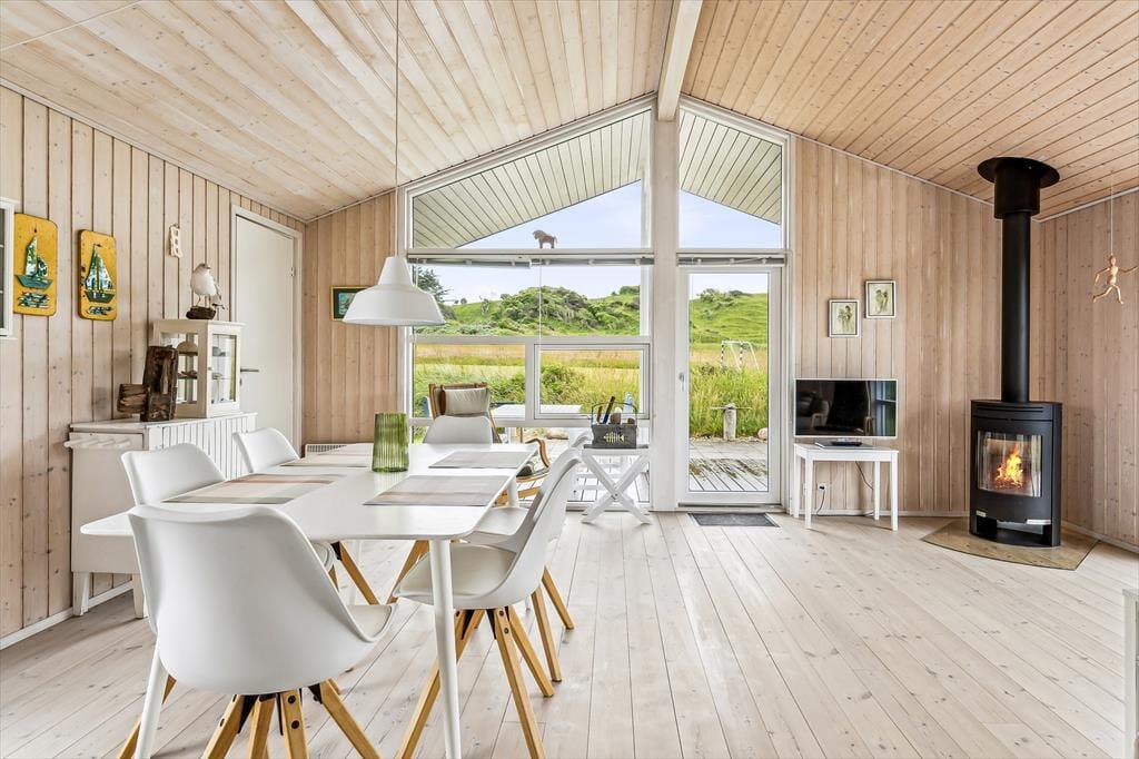 Wenn Sie das Sommerhaus betreten, erwartet Sie eine helle und luftige Einrichtung mit einem hohen, offenen Dach, das dem Raum eine wunderbare Großzügigkeit verleiht. Die großen Fenster lassen die Natur und das Licht herein und bieten einen fantastischen Blick auf die umliegenden Inlanddünen. Der offene Wohnbereich ist perfekt zum Entspannen und Beisammensein, wo Sie sich vor dem gemütlichen Kamin entspannen oder eine Mahlzeit genießen können, während Sie auf die schöne Natur blicken. Die einfache, helle Einrichtung schafft eine ruhige und entspannte Atmosphäre, die sowohl zum Wohlfühlen als auch zum Innehalten einlädt.