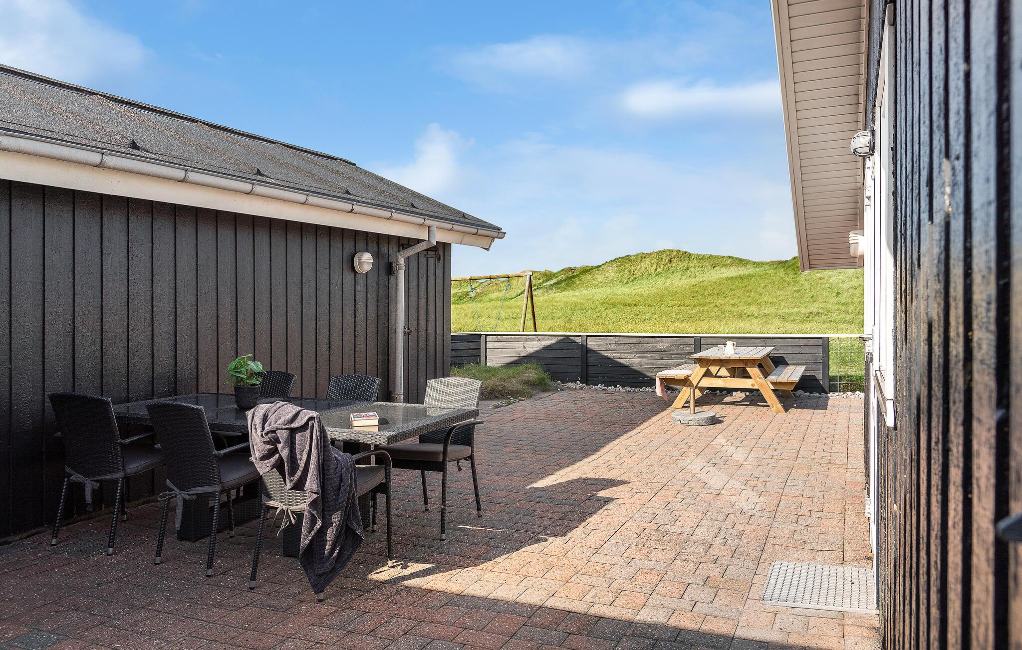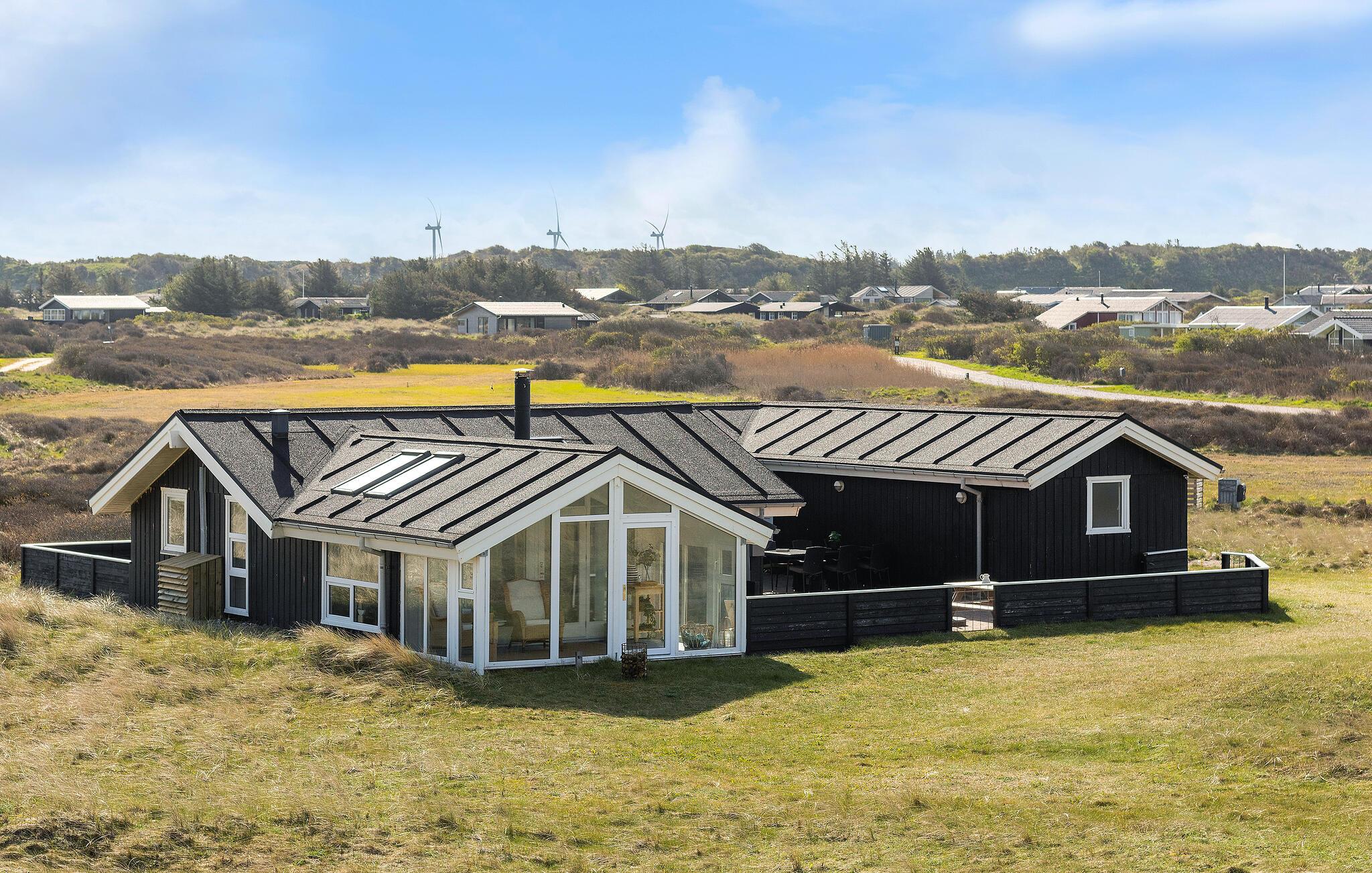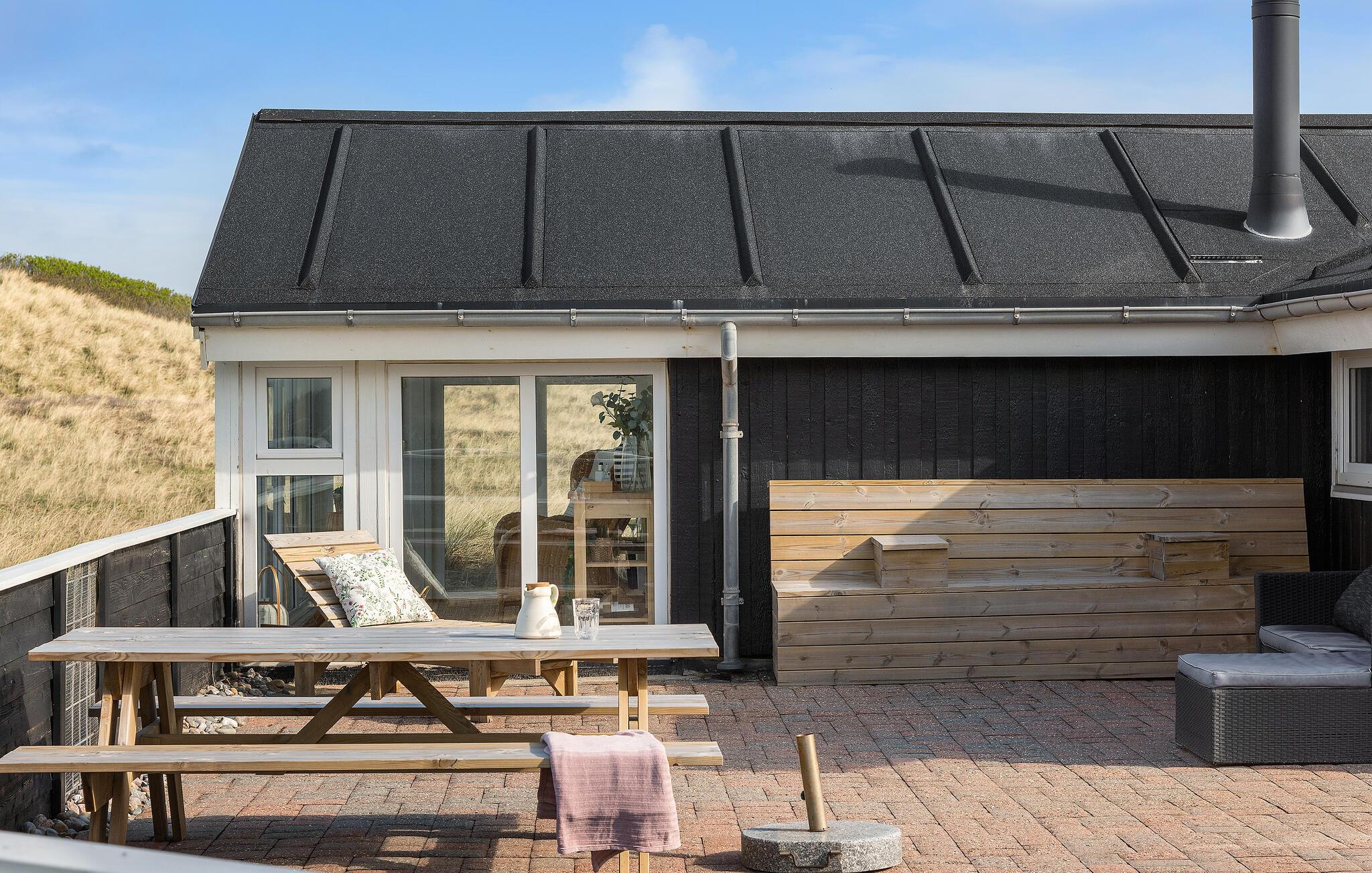 Modernes Ferienhaus mit Blick auf Dünen, Sauna und Spielmöglichkeiten, nur wenige Schritte vom Strand in Dänemark entfernt.