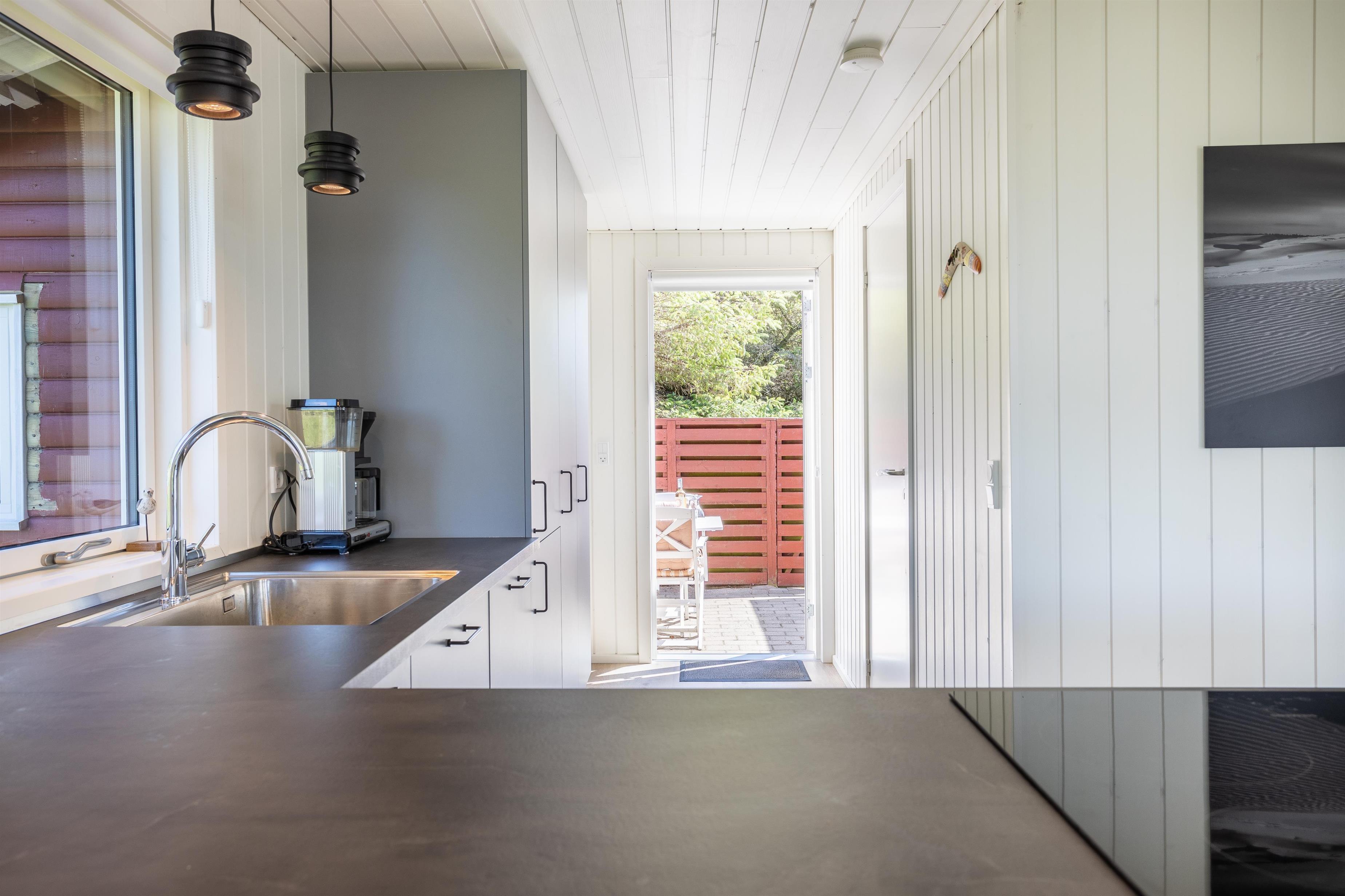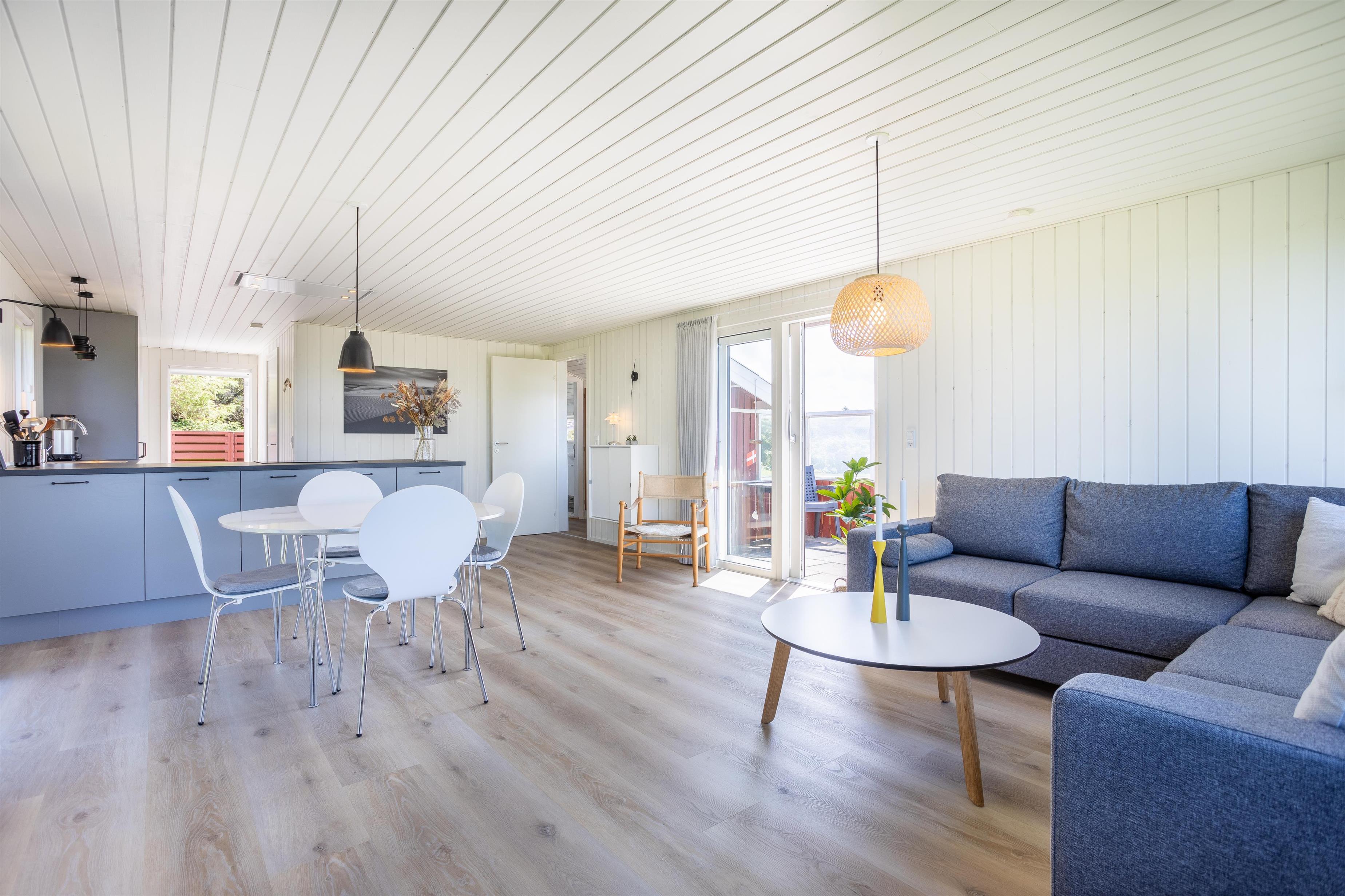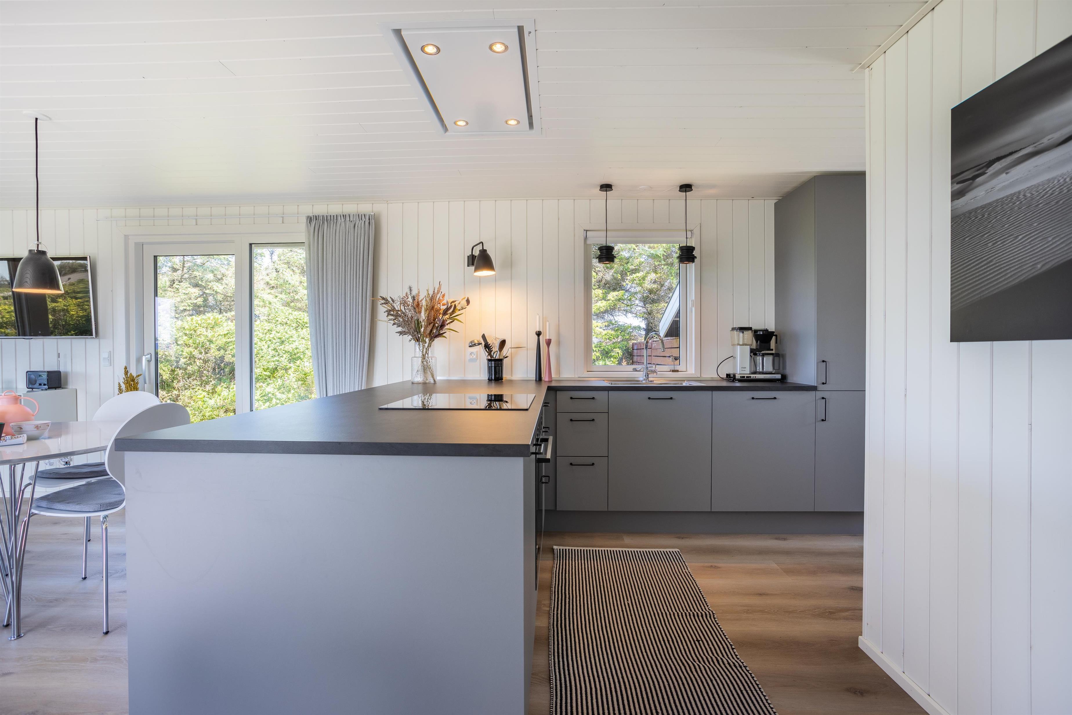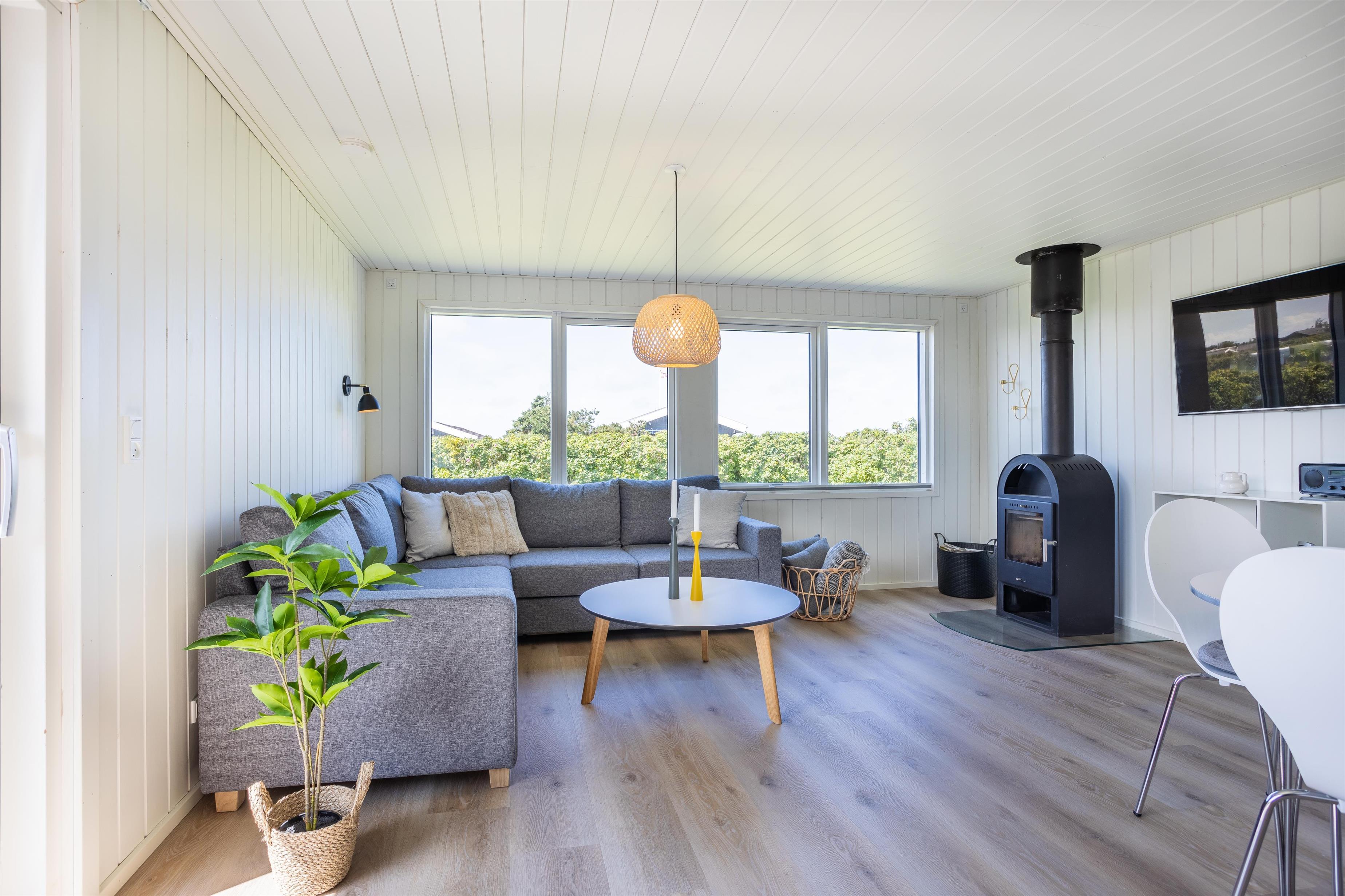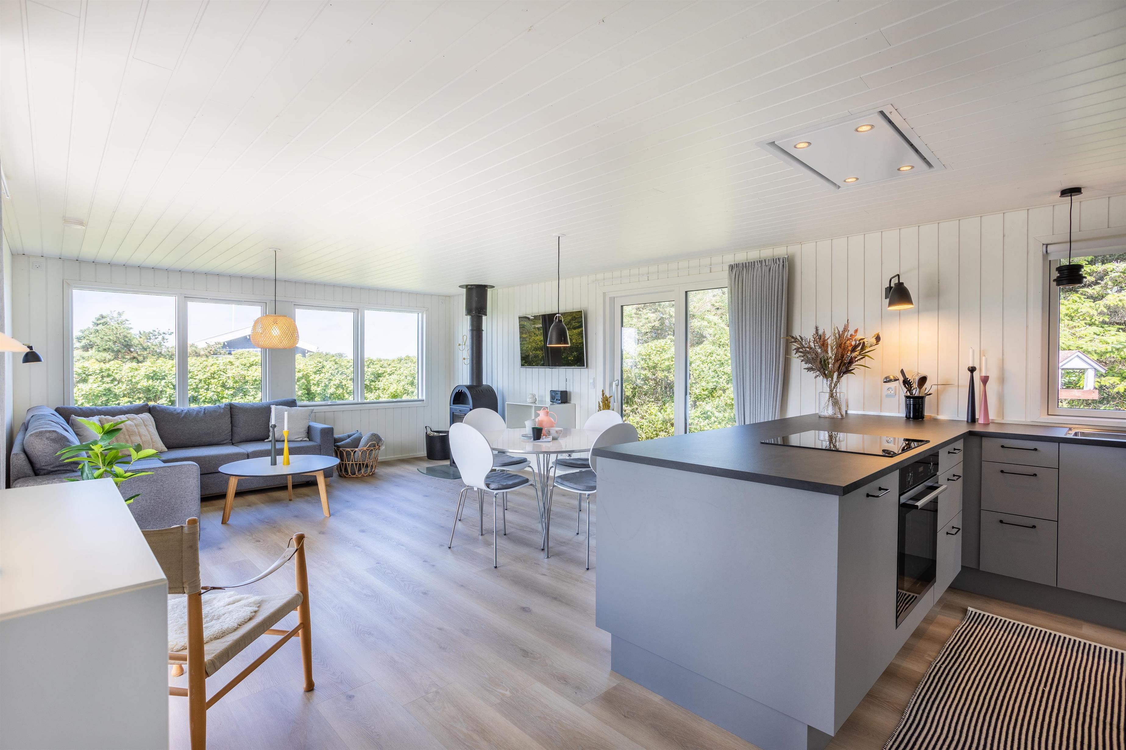Das hell eingerichtete und einladende Ferienhaus besteht aus einer funktionalen Wohnküche, die das Herzstück und den zentralen Treffpunkt des Hauses bildet. Hier ist Platz für gemeinsames Kochen, gemütliche Mahlzeiten und lange Gespräche. Vom Wohnzimmer aus gelangt ihr direkt auf eine der Terrassen, auf der ihr die Sonne und die frische Luft genießen könnt. In den Wintermonaten könnt ihr die Zeit drinnen verbringen und dem Knistern des Kamins lauschen, während ihr euch nach einem langen Spaziergang am Strand aufwärmt. Das Ferienhaus bietet zudem zwei schöne Schlafzimmer und ein Badezimmer mit Dusche. Vom Flur aus habt ihr Zugang zu einer weiteren Terrasse.